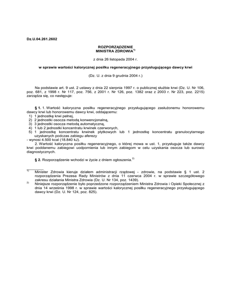 Dz.U.04.261.2602 ROZPORZĄDZENIE 1) MINISTRA ZDROWIA z dnia 26 listopada 2004 r. w sprawie wartości kalorycznej posiłku regeneracyjnego przysługującego dawcy krwi (Dz. U. z dnia 9 grudnia 2004 r.) Na podstawie art. 9 ust. 2 ustawy z dnia 22 sierpnia 1997 r. o publicznej słuŜbie krwi (Dz. U. Nr 106, poz. 681, z 1998 r. Nr 117, poz. 756, z 2001 r. Nr 126, poz. 1382 oraz z 2003 r. Nr 223, poz. 2215) zarządza się, co następuje: § 1. 1. Wartość kaloryczna posiłku regeneracyjnego przysługującego zasłuŜonemu honorowemu dawcy krwi lub honorowemu dawcy krwi, oddającemu: 1) 1 jednostkę krwi pełnej, 2) 2 jednostki osocza metodą konwencjonalną, 3) 3 jednostki osocza metodą automatyczną, 4) 1 lub 2 jednostki koncentratu krwinek czerwonych, 5) 1 jednostkę koncentratu krwinek płytkowych lub 1 jednostkę koncentratu granulocytarnego uzyskanych podczas zabiegu aferezy - wynosi 4.500 kcal (18.840 kJ). 2. Wartość kaloryczna posiłku regeneracyjnego, o której mowa w ust. 1, przysługuje takŜe dawcy krwi poddanemu zabiegowi uodpornienia lub innym zabiegom w celu uzyskania osocza lub surowic diagnostycznych. § 2. Rozporządzenie wchodzi w Ŝycie z dniem ogłoszenia. 2) ________ Minister Zdrowia kieruje działem administracji rządowej - zdrowie, na podstawie § 1 ust. 2 rozporządzenia Prezesa Rady Ministrów z dnia 11 czerwca 2004 r. w sprawie szczegółowego zakresu działania Ministra Zdrowia (Dz. U. Nr 134, poz. 1439). 2) Niniejsze rozporządzenie było poprzedzone rozporządzeniem Ministra Zdrowia i Opieki Społecznej z dnia 14 września 1998 r. w sprawie wartości kalorycznej posiłku regeneracyjnego przysługującego dawcy krwi (Dz. U. Nr 124, poz. 825). 1)