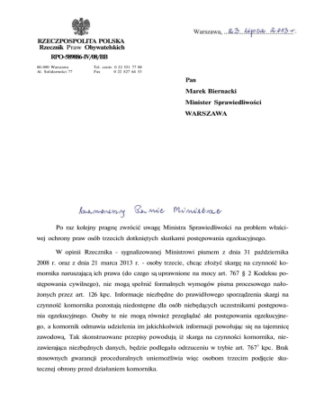 RZECZPOSPOLITA POLSKA Rzecznik Praw Obywatelskich RPO-589886-IV/08/BB 00-090 Warszawa Al. Solidarności 77 Tel. centr. 0 22 551 77 00 Fax 0 22 827 64 53 Pan Marek Biernacki Minister Sprawiedliwości WARSZAWA Po raz kolejny pragnę zwrócić uwagę Ministra Sprawiedliwości na problem właści wej ochrony praw osób trzecich dotkniętych skutkami postępowania egzekucyjnego. W opinii Rzecznika - sygnalizowanej Ministrowi pismem z dnia 31 października 2008 r. oraz z dnia 21 marca 2013 r. - osoby trzecie, chcąc złożyć skargę na czynność ko mornika naruszającą ich prawa (do czego są uprawnione na mocy art. 767 § 2 Kodeksu po stępowania cywilnego), nie mogą spełnić formalnych wymogów pisma procesowego nało żonych przez art. 126 kpc. Informacje niezbędne do prawidłowego sporządzenia skargi na czynność komornika pozostają niedostępne dla osób niebędących uczestnikami postępowa nia egzekucyjnego. Osoby te nie mogą również przeglądać akt postępowania egzekucyjne go, a komornik odmawia udzielenia im jakichkolwiek informacji powołując się na tajemnicę zawodową. Tak skonstruowane przepisy powodują iż skarga na czynności komornika, niezawierająca niezbędnych danych, będzie podlegała odrzuceniu w trybie art. 7673 kpc. Brak stosownych gwarancji proceduralnych uniemożliwia więc osobom trzecim podjęcie sku tecznej obrony przed działaniem komornika. 2 W odpowiedzi udzielonej w dniu 28 listopada 2008 roku (znak: DL-P-II-0760-9/08) Minister Sprawiedliwości zgodził się ze stanowiskiem Rzecznika; w piśmie tym wskazano, że przy najbliższej nowelizacji Kodeksu postępowania cywilnego wprowadzona zostanie regulacja, która zobowiąże komornika do przekazania skarżącemu wszelkich informacji nie zbędnych do sporządzenia skargi, zgodnej z wymogami przewidzianymi przez art. 767 § 3 kpc. Na zapytanie skierowane do Ministra Sprawiedliwości w dniu 21 marca 2013 r., do tyczące realizacji zapowiadanych zmian legislacyjnych, Pan Michał Królikowski, Podsekre tarz Stanu w Ministerstwie Sprawiedliwości, wskazał, że w założeniach projektu ustawy o zmianie ustawy - Kodeks postępowania cywilnego oraz niektórych innych ustaw przewi dziano zmianę trybu wnoszenia skargi na czynności komornika (pismo z dnia 25 kwietnia 2013 r., znak nr DPrC-I-072-5-13/2). Skarga będzie wnoszona do komornika, który dokonał zaskarżonej czynności. Komornik będzie przekazywał skargę wraz z aktami sprawy do sądu. W ocenie przedstawiciela Ministra Sprawiedliwości, modyfikacja trybu wnoszenia skarg na czynności komornika wyeliminuje zjawisko pozbawienia dostępu do akt egzeku cyjnych osób trzecich, które wnoszą skargi na czynności komornika. Komornik już od chwi li wniesienia skargi będzie posiadał wiedzę, że skarżący jest uczestnikiem postępowania. Natomiast po przekazaniu akt komorniczych do sądu, skarżący będzie mógł uzyskać do nich dostęp w sądzie na zasadach określonych w art. 9 kpc. Odnosząc się do przedstawionej argumentacji pragnę wyrazić obawę, że projektowa na zmiana przepisów kodeksu postępowania cywilnego nie pozwoli na zapewnienie gwa rancji proceduralnych dla osób dotkniętych skutkami postępowania egzekucyjnego. Należy bowiem zauważyć, że sama modyfikacja trybu rozpoznawania skargi na czynności komor nika (wedle założeń projektu, będzie ona składana do komornika, a nie do sądu) nie zmienia kręgu uczestników postępowania egzekucyjnego. Innymi słowy, osoba trzecia, wnosząca skargę na podstawie art. 767 § 2 kpc, jest u c z e s t n i k i e m p o s t ę p o w a n i a w przedmio cie skargi na czynności komornika, natomiast nie jest u c z e s t n i k i e m postępo wania egzekucyjnego j a k o takiego (nota bene, o tym przesądza sama treść art. 767 § 2 kpc). Taka jest obecnie sytuacja procesowa osoby trzeciej w postępowaniu egzekucyjnym, i taka pozostanie także po uchwaleniu zapowiadanej nowelizacji. Niezależnie od tego, czy skarga na czynności komornika będzie wnoszona bezpośrednio do sądu, czy też za pośred nictwem komornika, osoba nie będąca stroną postępowania egzekucyjnego nie ma dostępu 3 do akt sprawy. Nie wydaje się także dopuszczalne na tle obowiązującego stanu prawnego (a także w stanie prawnym przekształconym zapowiadaną nowelizacją), aby każda osoba, któ ra deklaruje chęć złożenia skargi na czynności komornika, a nie będąca stroną postępowania egzekucyjnego, miała nieograniczony dostęp do akt sprawy - uprawnienia takiego nie spo sób wywieść z art. 9 kpc. Co więcej, nadanie takiego uprawnienia osobom postronnym na tym etapie sprawy (a w zasadzie, przed jej wszczęciem) wydaje się niecelowe, a dostęp po tencjalnych skarżących do pełnych akt postępowania egzekucyjnego znacznie przekracza konieczność procesową. Zważywszy zatem na - procesowo słuszne - ograniczenie dostępu do akt sprawy, osoba trzecia wnosząca skargę na podstawie art. 767 § 2 kpc nie ma podstaw do żądania ujawnienia jej jakichkolwiek informacji - w kontekście wymogów tajemnicy zawodowej komornika (art. 20 ustawy z dnia 29 sierpnia 1997 r. o komornikach sądowych i egzekucji t. jedn.: Dz. U. z 2011 r., nr 231, poz. 1376 ze zmian.). W efekcie, skarga na czynności ko mornika, w której nie podano wszystkich niezbędnych danych, nie uzupełniona w terminie tygodniowym, podlega odrzuceniu (art. 7673 kpc). Ponownie zatem pragnę wskazać, że - w opinii Rzecznika Praw Obywatelskich - ce lowe byłoby uzupełnienie uprawnienia do zaskarżenia czynności komornika, przewidziane go przez art. 767 § 2 kpc, o taką regulację, która nakładałaby na komornika obowią zek przekazania skarżącemu wszelkich informacji, niezbędnych do sporzą dzenia skargi zgodnej z wymogami przewidzianymi przez art. 767 § 3 kpc. Byłoby to uprawnienie użyteczne, a zarazem wystarczające dla zapewnienia skutecznego korzystania ze skargi przez osoby dotknięte skutkami egzekucji. W związku z powyższym,
