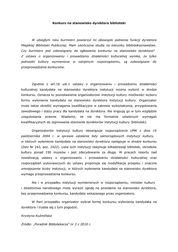 Konkurs na stanowisko dyrektora biblioteki W ubiegłym roku burmistrz powierzył mi obowiązki pełnienia funkcji dyrektora Miejskiej Biblioteki Publicznej. Mam ukończone studia na kierunku bibliotekoznawstwo. Czy burmistrz jest zobowiązany do ogłoszenia konkursu na stanowisko dyrektora? Z ustawy o organizowaniu i prowadzeniu działalności kulturalnej wynika, że tylko jednostki kultury wymienione w odrębnym rozporządzeniu, są zobowiązane do przeprowadzania konkursów. Zgodnie z art.16 ust.1 ustawy o organizowaniu i prowadzeniu działalności kulturalnej kandydata na stanowisko dyrektora instytucji można wyłonić w drodze konkursu. Oznacza to pozostawienie organizatorowi instytucji kultury możliwości wyboru formy wyłonienia kandydata na stanowisko dyrektora instytucji kultury. Organizator może także określić wymagania kwalifikacyjne w zakresie wykształcenia, przygotowania zawodowego i stażu pracy dla kandydata na dyrektora. Nie krępują go w tym względzie uregulowania prawne. Wiadomo, że nie ma formalnie ustalonych wymagań kwalifikacyjnych do zajmowania stanowisk dyrektorów instytucji kultury (bibliotek). Organizatorów instytucji kultury obowiązuje rozporządzenie UMK z dnia 19 października 2004 r. w sprawie ustalenia listy samorządowych instytucji kultury, w których wyłonienie kandydata na stanowisko dyrektora następuje w drodze konkursu (DzU Nr 242, poz. 2422). Lista tych instytucji obejmuje kilkadziesiąt bibliotek, ośrodków kultury ponad 150 muzeów i jest zdecydowanie za długa. W pracach resortu nad nowelizacją ustawy o organizowaniu i prowadzeniu działalności kulturalnej oraz rozporządzeń wykonawczych do ustawy proponuje się modyfikacje przepisu i znaczne zmniejszenie liczby instytucji, w których wyłonienie kandydata na stanowisko dyrektora wymaga przeprowadzenia konkursu. Ale i w przypadku instytucji wymienionych w rozporządzeniu, minister kultury i dziedzictwa narodowego może wyrazić zgodę na powołanie na stanowisko dyrektora, bez przeprowadzenia konkursu, kandydata wskazanego przez organizatora. W Pani przypadku organizator wybrał formę konkursu wyłonienia kandydata na dyrektora i trzeba się z tym pogodzić. Krystyna Kuźmińska Źródło: „Poradnik Bibliotekarza” nr 3 z 2010 r.