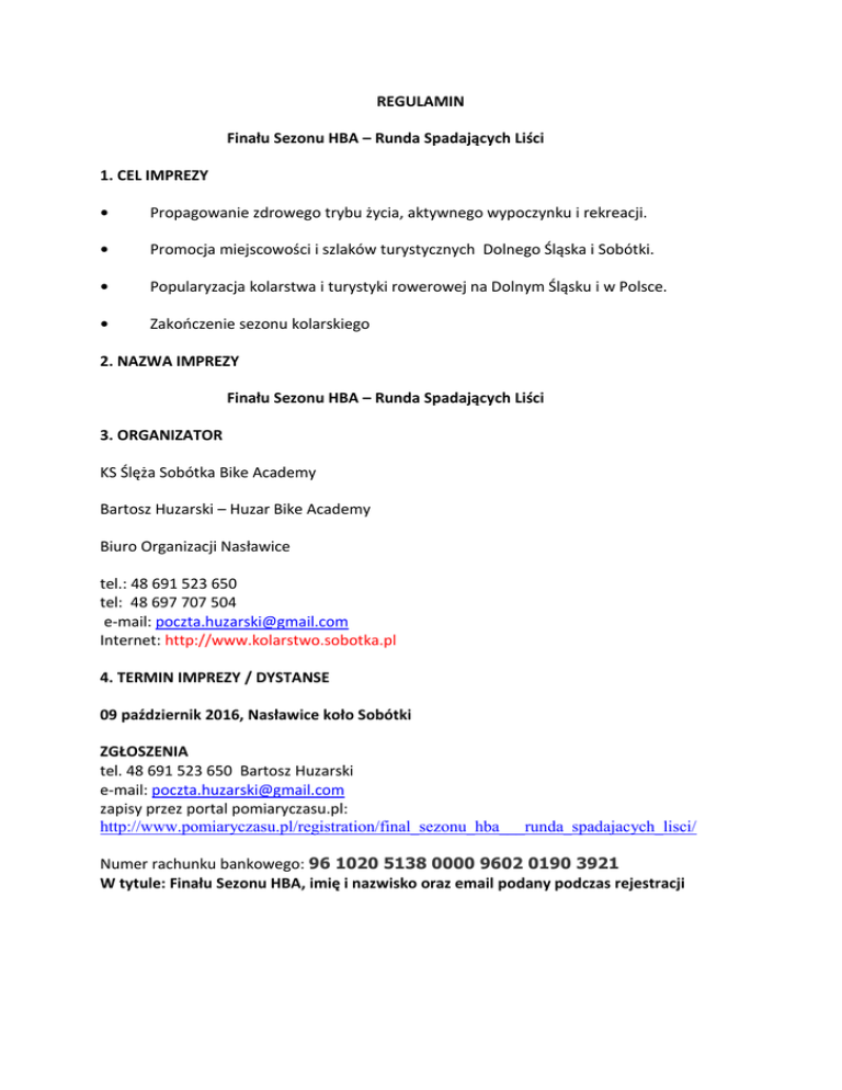 REGULAMIN Finału Sezonu HBA – Runda Spadających Liści 1. CEL IMPREZY • Propagowanie zdrowego trybu życia, aktywnego wypoczynku i rekreacji. • Promocja miejscowości i szlaków turystycznych Dolnego Śląska i Sobótki. • Popularyzacja kolarstwa i turystyki rowerowej na Dolnym Śląsku i w Polsce. • Zakończenie sezonu kolarskiego 2. NAZWA IMPREZY Finału Sezonu HBA – Runda Spadających Liści 3. ORGANIZATOR KS Ślęża Sobótka Bike Academy Bartosz Huzarski – Huzar Bike Academy Biuro Organizacji Nasławice tel.: 48 691 523 650 tel: 48 697 707 504 e-mail: [email protected] Internet: http://www.kolarstwo.sobotka.pl 4. TERMIN IMPREZY / DYSTANSE 09 październik 2016, Nasławice koło Sobótki ZGŁOSZENIA tel. 48 691 523 650 Bartosz Huzarski e-mail: [email protected] zapisy przez portal pomiaryczasu.pl: http://www.pomiaryczasu.pl/registration/final_sezonu_hba___runda_spadajacych_lisci/ Numer rachunku bankowego: 96 1020 5138 0000 9602 0190 3921 W tytule: Finału Sezonu HBA, imię i nazwisko oraz email podany podczas rejestracji 5. WARUNKI UCZESTNICTWA Uczestnikiem może być osoba, która spełni poniższe warunki: 5.1 Uczestnik zobowiązany jest do wypełnienia i wysłania specjalnego formularza zgłoszeniowego oraz do uiszczenia opłaty za organizacje i poczęstunek . Organizator dopuszcza dwa sposoby dokonywania zgłoszeń i opłat: A) Osobiście: Zgłoszeń, opłat i odbioru numerów dla uczestników na Finału Sezonu HBA – Runda Spadających Liści można będzie dokonywać w Nasławicach w dniu 09.10.2016 w godz. od 8:00 - 10:00 . B) Za pośrednictwem Internetu: - Wysłanie poprzez stronę internetową wypełnionego formularza zgłoszeniowego oraz wniesienie opłaty www.kolarstwo.sobotka.pl Nr.konta 96 1020 5138 0000 9602 0190 3921 (przy odbiorze numeru uczestnik zobowiązany będzie do złożenia podpisu na formularzu zgłoszeniowym wydrukowanym przez Organizatora, dotyczy tylko uczestników, którzy wypełnią formularz i dokonają wpłaty, przestrzegając terminu zgłoszeń. Po tym terminie uczestnicy będą musieli wypełniać formularz na miejscu w Biurze w Nasławicach. - Dokonanie opłaty w wysokości określonej w poz. 6 niniejszego regulaminu. Oryginał dowodu opłaty (włącznie z opłatami przez Internet) każdy uczestnik musi zachować do wglądu w Biurze w Nasławicach. - Zgłoszenie uczestnictwa przez Internet oraz wpłacenie opłaty startowej należy dokonać w ostatecznym terminie do 08.10.2016. Po tym terminie zgłoszenie uczestnictwa oraz opłaty będą możliwe tylko w Biurze w Nasławicach w dniu 09.10.2016 w godz. od 8:00 – 10:00 Zgłoszenie jest jednocześnie oświadczeniem o zapoznaniu się uczestnika Finału Sezonu HBA – Runda Spadających Liści z treścią regulaminu i akceptacją jego warunków. UWAGA! Uczestnicy Finału Sezonu HBA – Runda Spadających Liści, którzy zapisali się przez stronę internetową, a nie uiścili opłaty zobowiązani są do przelania na konto - Numer rachunku bankowego: 96 1020 5138 0000 9602 0190 3921 , opłata w wysokości 30,00 zł najpóźniej do 09.10.2016. Brak opłaty w wyżej wymienionym terminie oznaczać będzie wykreślenie z listy uczestników Finału Sezonu HBA. 5.2 Każdy uczestnik zgłoszony do Finału Sezonu HBA – Runda Spadających Liści otrzyma numer uczestnika wraz z chipem, który będzie przypisany uczestnikowi. Odbioru numeru i chipa należy dokonać osobiście. W przypadku utraty lub zniszczenia numeru uczestnika z chipem Organizator wyda uczestnikowi nowy zestaw za pobraniem opłaty 50 zł. 5.3 Impreza ma charakter otwarty, prawo udziału w Finale Sezonu HBA – Runda Spadających Liści mają osoby, które ukończyły 18 lat, Osoby w wieku 16-18 lat, mają prawo udziału wyłącznie za pisemną zgodą rodzica lub opiekuna prawnego lub osoby sprawującej opiekę w czasie trwania Finał Sezonu HBA i jego/jej stałą obecnością na imprezie (podpis na formularzu zgłoszeniowym) - posiadającej pisemne oświadczenie wyrażające zgodę rodzica lub opiekuna prawnego na udział nieletniego w Finale Sezonu HBA – Runda Spadających Liści (według wzoru oświadczenia opublikowanego na stronie internetowej www.kolarstwo.sobotka.pl, stanowiącego załącznik do niniejszego Regulaminu). 5.4 Każdy uczestnik zgłoszony do Finału Sezonu HBA – Runda Spadających Liści w 2016 r. bierze udział na własną odpowiedzialność (w przypadku uczestników niepełnoletnich na odpowiedzialność rodzica lub prawnego opiekuna). Dopuszcza się do uczestnictwa w Finale Sezonu HBA wyłącznie osoby posiadające dobry stan zdrowia, nie posiadające przeciwwskazań medycznych do uczestnictwa w Finale Sezonu HBA. Ten fakt uczestnik potwierdzi własnoręcznym podpisem na formularzu zgłoszeniowym przygotowanym przez Organizatora. W przypadku osób niepełnoletnich potwierdzenie dobrego stanu zdrowia, braku przeciwwskazań medycznych oraz wyrażenie zgody na udział w Finale Sezonu HBA potwierdza na formularzu zgłoszeniowym lub stosownym oświadczeniu własnoręcznym podpisem rodzic lub opiekun prawny nieletniego zawodnika oraz osoba, której opiekunowie prawni powierzyli opiekę nad nieletnim uczestnikiem w czasie trwania Finału Sezonu HBA. 6. OPŁATY ZA UCZESTNICTWO W FINALE SEZONU HBA 2016 6.1 ZA UCZESTNICTWO W TRENINGACH Z POMIAREM CZASU PODCZAS FINAŁU SEZONU HBA obowiązuje opłata: 30,00 zł - do 08.10.2016r. (przelew), 30,00 zł - w dniu 09.10.2016 w godz. od 8:00 – 10:00 dokonywana wyłącznie w formie gotówki w Biurze w Nasławnicach. 6.2 Każdy uczestnik, po uiszczeniu opłaty , otrzymuje numer z chipem uprawniający do udziału w Finale Sezonu HBA. 7. ŚWIADCZENIA DLA UCZESTNIKÓW Uczestnicy Finału Sezonu HBA – Runda Spadających Liści w ramach wpisowego otrzymują: zwrotny numer z chipem, gorący posiłek nagrody rzeczowe dla trzech najlepszych w każdej kat. wiekowej podczas treningu z pomiarem czasu doskonałą organizację, oprawę i kolarską atmosferę. oryginalną pocztówkę z