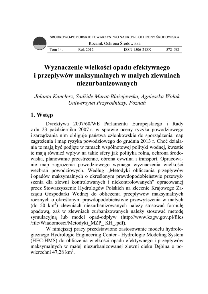 ŚROD DKOWO-POMORSK KIE TOWARZYSTW WO NAUKOWE OCH HRONY ŚRODOWIISKA Rocznik Ochro ona Środowiska Tom 14. Rok 2012 2 ISSN 1506-2218X 572––581 Wyznaczenie wielkości w opadu o efek ktywnego i przepłyywów mak ksymalnycch w małycch zlewniaach niezzurbanizowanych Jolanta Kaanclerz, Sadżżide Murat-Błłażejewska, A Agnieszka Woolak Uniwerssytet Przyrod dniczy, Poznańń 1. Wstęp Dyrekktywa 2007/660/WE Parlaamentu Europpejskiego i Rady z dn. 23 paźddziernika 20007 r. w sprawiie oceny ryzyyka powodziowego i zarządzaniaa nim obligujee państwa czło onkowskie do sporządzeniaa map zagrożenia i map ryzyka powodziowego o do grudnia 20013 r. Choć dzziałania te mają być podjęte w ramach r wspóln notowej polityyki wodnej, kw westie te mają równnież wpływ naa takie sfery jaak polityka rollna, ochrona środowiska, planowanie przestrzzenne, obronaa cywilna i traansport. Opraccowanie map zaggrożenia pow wodziowego wymaga w wyznnaczenia wiellkości wezbrań pow wodziowych. Według „Meetodyki obliczania przepłyywów i opadów maaksymalnych o określonym prawdopodobbieństwie przeewyższenia dla zlewni z kontrollowanych i niekontrolowannych” opracow wanej przez Stowarrzyszenie Hyddrologów Polskich na zlecennie Krajowegoo Zarządu Gospoodarki Wodneej do obliczen nia przepływóów maksymallnych rocznych o określonym o prrawdopodobień ństwie przewyyższenia w małych m (do 50 km2) zlewniach niezurbanizowa n anych należy stosować forrmułę opadową, zaaś w zlewniacch zurbanizow wanych należyy stosować metodę m symulacyjną lub model opad-odpływ w (http://www w.kzgw.gov.pll/files /file/Wiadom mosci/Metodykki_MZP_ KH_ _.pdf). W ninniejszej pracy przedstawion no zastosowaniie modelu hyddrologicznego Hyddrologic Enginneering Center - Hydrologicc Modeling Syystem (HEC-HMS) do obliczeniaa wielkości op padu efektywnnego i przepłyywów maksymalnycch w małej niezurbanizowa n anej zlewni cieku Dębina o powierzchni 47,28 km2. Wyznaczenie wielkości opadu efektywnego i przepływów maksymalnych… 573 2. Funkcjonowanie modelu HEC-HMS HEC-HMS to system symulacji procesów hydrologicznych zachodzących w zlewni na zasadzie modelu opad-odpływ oraz odpływu rozgałęzioną siecią rzeczną, zarówno naturalnego jak i przekształconego [4]. System umożliwia dobór metod modelowania spośród kilku różniących się stopniem złożoności, a tym samym liczbą wymaganych parametrów i dokładnością oszacowania wyników. HEC-HMS składa się z następujących komponentów: ¾ opisu opadu – pozwala ona na wprowadzenie wejściowych danych meteorologicznych zarówno w formie serii obserwacji jak i w postaci opadów o określonym prawdopodobieństwie wystąpienia lub szacowanych wartości maksymalnych. ¾ modeli do szacowania opadu efektywnego (runoff-volume models). Dostępne są cztery modele służące do określania opadu efektywnego podczas poszczególnych zdarzeń opadowych: metoda stałego współczynnika strat, metoda Greena i Ampta, metoda stałego współczynnika strat z deficytem początkowym oraz metoda SCS-CN. W metodach tych zakłada się warunki początkowe występujące w zlewni. Piąta metoda – model SMA (Soil-Moisture Accounting) jest modelem ciągłym wymagającym określenia parametrów poprzez kalibrację. ¾ modeli odpływu bezpośredniego – służących do wyznaczania hydrogramu odpływu ze zlewni elementarnej. Program pozwala na określenie hydrogramu jednostkowego użytkownika, zastosowanie hydrogramu Clark’a, Snyder’a, SCS UH, a także zmodyfikowanego hydrogramu Clark’a dla zlewni o parametrach rozłożonych lub konceptualnego modelu fali kinematycznej. Ten ostatni wymaga dysponowania pomierzonymi wartościami parametrów takich jak: pola powierzchni, długości drogi spływu wody, szerokości kanałów, spadki, współczynniki szorstkości. Model ten zalecany jest do stosowania w przypadku mniejszych zlewni (do 2,5 km2). Z kolei metoda SCS-UH stosowana może być w zlewniach charakteryzujących się prostym hydrogramem o pojedynczym szczycie. ¾ modeli przepływu gruntowego. Przepływ gruntowy można przyjąć jako stały w poszczególnych miesiącach lub wykorzystać jeden z dwóch modeli – model wykładniczy oraz model zbiornika liniowego współpracujący z modelem SMA obliczania opadu efektywnego. 574 Jolanta Kanclerz, Sadżide Murat-Błażejewska, Agnieszka Wolak ¾ modeli transformacji fali wezbraniowej – dostępnych jest pięć modeli przepływu w ciekach, w tym model Lag, który jest najprostszym rozwiązaniem uwzględniającym jedynie przesunięcie hydrogramu w czasie. 3. Zastosowanie modelu HEC-HMS Zlewnia cieku Dębina położona jest na Pojezierzu Wielkopolskim (315.5) w mezoregionie Pojezierze Gnieźnieńskie (315.54) [5]. Ciek Dębina o długości 14,64 km jest ciekiem V rzędu, który wpływa do Jeziora Kłeckiego około 17 km na północny-zachód od Gniezna w miejscowości Borzątew. Średnia wysokość zlewni to 110,4 m n.p.m. Spadek podłużny zlewni wynosi 1,17‰, a spadki poprzeczne wahają się w granicach od 1,0 do 17,7‰, średnio 7,7‰. Charakterystykę gleb opracowano na podstawie mapy glebowo-rolniczej w skali 1:100 000 (IUNG Puławy, 1981) oraz informacji uzyskanej w Nadleśnictwie Gniezno. Typy gleb zreinterpretowano w celu ich określenia wg najnowszej Systematyki Gleb Polski [6]. W zlewni cieku dominują gleby płowe wytworzone z materiałów morenowych (ok. 50%) oraz występujące pod lasami gleby rdzawe (ok. 23%). Pozostały obszar pokryty jest glebami hydrogenicznymi i semihydrogenicznymi. W strukturze użytkowania określonej na podstawie bazy danych Corine Land Cover dominują w 77% grunty orne, a ok. 20% stanowi pas terenów leśnych wraz z terenami zielonymi. Analizowany obszar charakteryzuje się najniższymi w Polsce rocznymi sumami opadów. Pomiary w stacji opadowej w Kiszkowie, płożonej ok. 15 km od profilu Borzątew zamykającego badaną zlewnię wskazują, że średnia roczna suma opadów z w