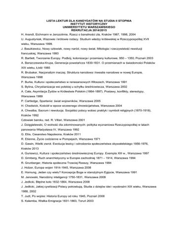 LISTA LEKTUR DLA KANDYDATÓW NA STUDIA II STOPNIA INSTYTUT HISTORYCZNY UNIWERSYTETU WARSZAWSKIEGO REKRUTACJA 2014/2015 H. Arendt, Eichmann w Jerozolimie. Rzecz o banalności zła, Kraków 1987, 1998, 2004 U. Augustyniak, Wazowie i królowie rodacy. Studium władzy królewskiej w Rzeczypospolitej XVII wieku, Warszawa 1999. J. Baszkiewicz, Nowy człowiek, nowy naród, nowy świat. Mitologia i rzeczywistość rewolucji francuskiej, Warszawa 1993 R. Bartlett, Tworzenie Europy. Podbój, kolonizacja i przemiany kulturowe, 950 – 1350, Poznań 2003 A. Barszczewska-Krupa, Generacja powstańcza 1830-1831. O przemianach w świadomości Polaków XIX wieku, Łódź 1985 R. Brubaker, Nacjonalizm inaczej. Struktura narodowa i kwestie narodowe w nowej Europie, Warszawa 1998 P. Burke, Kultura i społeczeństwo w renesansowych Włoszech, Warszawa 1991 S. Bylina, Chrystianizacja wsi polskiej u schyłku średniowiecza, Warszawa 2002 A. Cała, Asymilacja Żydów w Królestwie Polskim (1864-1897). Postawy, konflikty, stereotypy, Warszawa 1989 P. Cartledge, Spartanie: świat wojowników, Warszawa 2005 H. Chadwick, Kościół w epoce wczesnego chrześcijaństwa, Warszawa 2004 A. Chwalba, Sacrum i rewolucja. Socjaliści polscy wobec praktyk i symboli religijnych (1870-1918), Kraków 1992 Człowiek baroku, red. R. Villari, Warszawa 2001 J. Dzięgielewski, O wolność dla zdominowanych: polityka wyznaniowa Rzeczypospolitej w latach panowania Władysława IV, Warszawa 1992 G. Eliis, Cesarstwo Napoleona, Kraków 2011 R. Etienne, Życie codzienne w Pompejach, Warszawa 1971 D. Gawin, Wielki zwrot. Ewolucja lewicy i odrodzenia społeczeństwa obywatelskiego 1956-1976, Kraków 2013 A. Guriewicz, Kultura i społeczeństwo średniowiecznej Europy. Exempla XIII w., Warszawa 1997 D. Grinberg, Ruch anarchistyczny w Europie zachodniej 1871 – 1914, Warszawa 1994 R. Grunberger, Historia społeczna Trzeciej Rzeszy, Warszawa 1994 J. Holzer, Europa wojen 1914-1945, Warszawa 2008 E. Hornung, Jeden czy wielu? Koncepcja Boga w starożytnym Egipcie, Warszawa 1991 M. Janowski, Narodziny inteligencji 1750-1831, Warszawa 2008 J. Jedlicki, Błędne koło 1832-1864, Warszawa 2008 J. Jedlicki, Jakiej cywilizacji Polacy potrzebują. Studia z dziejów idei i wyobraźni XIX wieku, Warszawa 1988, 2002 T. Judt, Po wojnie: Historia Europy od roku 1945, Poznań 2008 S. Kalemba, Wielka Emigracja 1831-1863, Toruń 2003 Ł. Kądziela, Między zdradą a służbą Rzeczypospolitej. Fryderyk Moszyński w latach 1792-1793, Warszawa 1993 A. Kersten, Hieronim Radziejowski. Studium władzy i opozycji, Warszawa 1988 T. Kizwalter, O nowoczesności narodu – przypadek Polski, Warszawa 1999 M. Koczerska, Rodzina szlachecka w Polsce późnośredniowiecznej, Warszawa 1975 T. Kotula, Septymiusz Sewer. Cesarz z Lepcis Magna, Wrocław 1987 W. Kriegseisen, Sejmiki w Rzeczypospolitej szlacheckiej w XVII i XVIII wieku, Warszawa 1991 W. Kriegseisen, Stosunki wyznaniowe w relacjach państwo-kościół między reformacją a oświeceniem, Warszawa 2010 C. Kuklo, Kobieta samotna w społeczeństwie miejskim u schyłku Rzeczypospolitej szlacheckiej: studium demograficzno – społeczne, Białystok 1998 J. Kurtyka, Odrodzone Królestwo. Monarchia Władysława Łokietka i Kazimierza Wielkiego w świetle nowszych badań, Kraków 2001 W. Lengauer, Religijność starożytnych Greków, Warszawa 1994 H. Manikowska, Jerozolima, Rzym, Compostela: wielkie pielgrzymowanie u schyłku średniowiecza, Wrocław 2008 A. Mączak, Klientela: nieformalne systemy władzy w Polsce i Europie XVI – XVIII w., Warszawa 2000 (lub wcześniejsze wydanie) A. Mączak, Rządzący i rządzeni. Władza i społeczeństwo w Europie wczesnonowożytnej, wydanie II, Warszawa 2002 Między monarchią a demokracją. Studia z dziejów Polski XV-XVIII w., red. A. Sucheni-Grabowska, M. Żaryn, Warszawa 1994 J. Michalski, Rousseau i sarmacki republikanizm, Warszawa 1977 M. Micińska, Zdrada, córka Nocy. Pojęcie zdrady narodowej w świadomości Polaków w latach 18611914, Warszawa 1998 K. Modzelewski, Barbarzyńska Europa, Warszawa 2004 K. Nawotka, Aleksander Wielki, Wrocław 2007 D. Olszewski, Polska kultura religijna na przełomie XIX i XX wieku, Warszawa 1996 E. Opaliński, Kultura polityczna szlachty polskiej w latach 1587 – 1652, Warszawa 1995 K. Ożóg, Intelektualiści w służbie Królestwa Polskiego w latach 1306 – 1382, Kraków 1995 A. Paczkowski, Wojna polsko – Jaruzelska: stan wojenny w Polsce 13 XII 1981 – 22 VII 1983, Warszawa 2007 K. Pomian, Europa i jej narody, Warszawa 1992 K. Reinsberg, Życie seksualne starożytnych Greków, Gdynia 1998 E. Rostworowski, Legendy i fakty XVIII w., Warszawa 1963 E. Rostworowski, Ostatni król Rzeczypospolitej, Warszawa 1966 Rzeczpospolita wielu narodów i jej tradycje, red. A.K. Link-Lenczowski, M. Markiewicz, Kraków 1999 K. Skwierczyński, Recepcja idei gregoriańskich w Polsce do początku XIII wieku, Wrocław 2005 T. Snyder, Skrwawione ziemie, Warszawa 2011 J. Strzelczyk, Otton III, Wrocław 2000 T. Szarota, Życie codzienne w stolicach okupowanej Europy, Warszawa 1995. A. Świderkówna, Życie codzienne w Egipcie greckich papirusów, Warszawa 1983 Tradycje polityczne dawnej Polski, red. A. Sucheni-Grabowska, A. Dybkowska, Warszawa 1994 H. Wereszycki, Pod berłem Habsburgów. Zagadnienia narodowościowe, Kraków 1986 A. Wyczański, Wschód i zachód Europy w początkach doby nowożytnej, Warszawa 2003 J.P. Vernant, Źródła myśli greckiej, Warszawa 1969, 1996 A.B. Zakrzewski, Wielkie Księstwo Litewskie (XVI-XVIII w.) Prawo – ustrój – społeczeństwo, Warszawa 2013 B. Zientara, Henryk Brodaty i jego czasy, Warszawa 1975 (i następne wydania) V. Zubok, K. Pleszakow, Zimna wojna zza kulis Kremla. Od Stalina do Chruszczowa, Warszawa 1999.