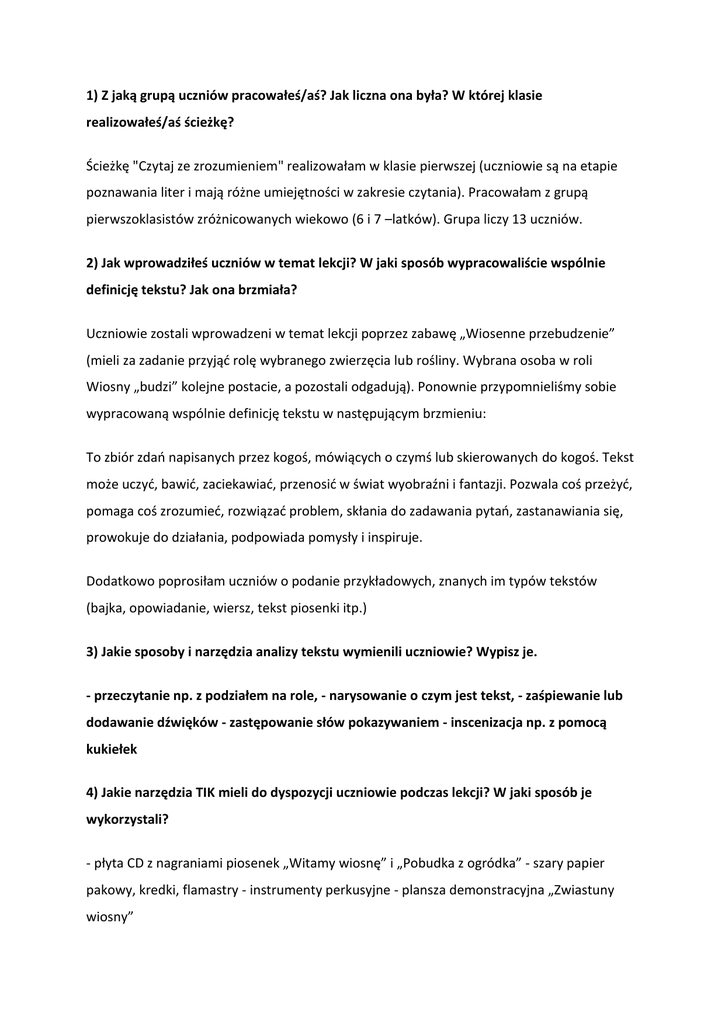 1) Z jaką grupą uczniów pracowałeś/aś? Jak liczna ona była? W której klasie realizowałeś/aś ścieżkę? Ścieżkę "Czytaj ze zrozumieniem" realizowałam w klasie pierwszej (uczniowie są na etapie poznawania liter i mają różne umiejętności w zakresie czytania). Pracowałam z grupą pierwszoklasistów zróżnicowanych wiekowo (6 i 7 –latków). Grupa liczy 13 uczniów. 2) Jak wprowadziłeś uczniów w temat lekcji? W jaki sposób wypracowaliście wspólnie definicję tekstu? Jak ona brzmiała? Uczniowie zostali wprowadzeni w temat lekcji poprzez zabawę „Wiosenne przebudzenie” (mieli za zadanie przyjąć rolę wybranego zwierzęcia lub rośliny. Wybrana osoba w roli Wiosny „budzi” kolejne postacie, a pozostali odgadują). Ponownie przypomnieliśmy sobie wypracowaną wspólnie definicję tekstu w następującym brzmieniu: To zbiór zdań napisanych przez kogoś, mówiących o czymś lub skierowanych do kogoś. Tekst może uczyć, bawić, zaciekawiać, przenosić w świat wyobraźni i fantazji. Pozwala coś przeżyć, pomaga coś zrozumieć, rozwiązać problem, skłania do zadawania pytań, zastanawiania się, prowokuje do działania, podpowiada pomysły i inspiruje. Dodatkowo poprosiłam uczniów o podanie przykładowych, znanych im typów tekstów (bajka, opowiadanie, wiersz, tekst piosenki itp.) 3) Jakie sposoby i narzędzia analizy tekstu wymienili uczniowie? Wypisz je. - przeczytanie np. z podziałem na role, - narysowanie o czym jest tekst, - zaśpiewanie lub dodawanie dźwięków - zastępowanie słów pokazywaniem - inscenizacja np. z pomocą kukiełek 4) Jakie narzędzia TIK mieli do dyspozycji uczniowie podczas lekcji? W jaki sposób je wykorzystali? - płyta CD z nagraniami piosenek „Witamy wiosnę” i „Pobudka z ogródka” - szary papier pakowy, kredki, flamastry - instrumenty perkusyjne - plansza demonstracyjna „Zwiastuny wiosny” 5) Jaki tekst/y kultury postanowiliście przeanalizować? Wymień typ/y tekstu oraz podaj jego pełną nazwę/y. Czy uczniowie mieli wpływ na jego wybór? Jeżeli tak, napisz dlaczego wybrali właśnie ten tekst/y. Postanowiliśmy przeanalizować słowa piosenki „Pobudka z ogródka” autorstwa Doroty Gellner (muzyka: Adam Skorupka) i „Witamy wiosnę”, słowa: W. Maksymkin (muzyka: Cz. Grudziński). Decyzję o wyborze tekstów podjęłam samodzielnie głównie ze względu na wiek uczniów. 6) Czy uczniowie pracowali w grupach czy samodzielnie? Napisz czy analizowali jeden tekst kultury, a może kilka różnych. Jakie strategie i narzędzia analizy tekstu wykorzystali podczas pracy na lekcji. Uczniowie w grupach tworzyli chodniczek z obrazkami i i historyjkami obrazkowymi na zasadzie tzw. „ścieżki opowiadania” do kolejnych zwrotek piosenek. Następnie wędrowali kolejnymi etapami zgodnie z czytaną treścią piosenek. Wcześniej przeanalizowaliśmy tekst włączając naśladownictwo i improwizację ruchową. Również tworzyli akompaniament do piosenki na instrumentach perkusyjnych. Słowa piosenki Pobudka z ogródka były czytane z podziałem na role (narrator, Wiosna, dzieci). 7) Jakie obszary tekstu przeanalizowali uczniowie i jakie konteksty poruszyli? - kontekst społeczno-przyrodniczy (zmiany pojawiające w związku z nadchodzącą porą roku w świecie ludzi, zwierząt i roślin) - uczniowie odpowiadali na pytania dotyczące treści piosenek, omawiali ich nastrój i charakter, wyrażali się na temat własnych upodobań - uczniowie wskazywali różnice między tekstem piosenki, a innymi tekstami. 8) Jakie wnioski wyciągnęli uczniowie z pracy na tekście. Czy dzięki głębokiej analizie więcej dowiedzieli się z tekstu? Jakie umiejętności przydały im się podczas analizy? Uczniowie dotknęli odmiennych sposobów analizy tekstu, poprzez jego wizualizację, "ożywienie". Odkrywali, że treść można „odczytywać” na różne ciekawe sposoby. Wszechstronna analiza tekstu umożliwiła również przyjemniejszą i sprawniejszą naukę słów piosenki. Dzięki zgłębionej analizie tekstu uczniowie poruszyli zagadnienie związane z tematem zajęć (zwiastuny wiosny). Próbowali wyrażać i określać nastrój utworów. Dzieci doskonaliły różne umiejętności artystyczne (plastyczne, muzyczno-ruchowe, teatralne), współpracy w grupie. 9) Podziel się własną refleksją: co dla ciebie było najważniejsze, co okazało się trudne lub zaskakujące? Jakie masz wskazówki dla naśladowców? Najważniejsze dla mnie było ukazanie różnych sposobów analizy tekstu poprzez zabawę. Innym ważnym aspektem było zmotywowanie grupy poprzez wykorzystanie mocnych stron uczniów. Trudne okazało się nawiązanie zgodnej współpracy przy realizacji zadania grupowego.