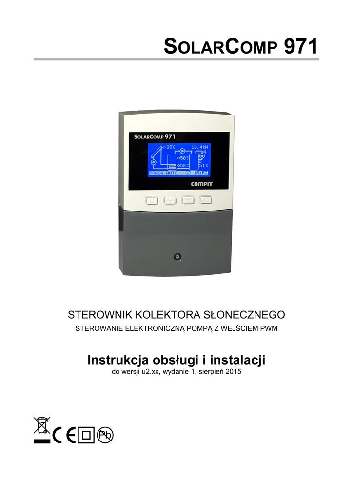 SOLARCOMP 971 971 STEROWNIK KOLEKTORA SŁONECZNEGO STEROWANIE ELEKTRONICZNĄ POMPĄ Z WEJŚCIEM PWM Instrukcja obsługi i instalacji do wersji u2.xx, wydanie 1, sierpień 2015 Pb Wstęp Regulator SOLARCOMP 971 jest przeznaczony do sterowania pracą układu solarnego. Podstawowe cechy regulatora: • Sterowanie pompą z wejściem PWM - regulator steruje płynnie elektroniczną pompą ładującą zasobnik, co pozwala na ekonomiczne wykorzystanie energii solarnej (energia może być odzyskiwana z kolektora słonecznego nawet przy niesprzyjających warunkach pogodowych). • Wyświetlacz graficzny - ułatwia obsługę regulatora. Pozwala w prosty sposób ustalić, który schemat pracy jest realizowany oraz jakie są parametry układu. • Licznik ciepła – regulator oblicza ilość ciepła pozyskanego z kolektora słonecznego. • Dwustopniowa kontrola przepływu – bez potrzeby dołączania przepływomierza. • Współpraca z przepływomierzem – wejście do podłączenia impulsatora • Wbudowany zegar – podtrzymywany w przypadku zaniku zasilania przez 48 godz. • Wykres dzienny mocy uzyskanej na kolektorze. • Statystyki tygodniowe uzysku energii słonecznej. • Sygnalizacja grawitacyjnego unoszenia ciepła z zasobnika. • Sterowanie pompą cyrkulacyjną CWU. • Tryb urlopowy zabezpieczający instalację przed przegrzaniem jeśli ciepła woda nie będzie wykorzystywana. • Funkcja chłodzenia rewersyjnego – stabilizuje temperaturę zasobnika pozbywając się nadmiaru ciepła przez kolektor. • Funkcja okresowej sterylizacji zasobnika CWU – raz na tydzień temperatura zadana zasobnika CWU zostaje podniesiona do ustawionego poziomu aby usunąć mogące pojawić się w zasobniku bakterie z rodzaju Legionella. • Funkcja ochrony kolektora przed zamarzaniem – regulator przeciwdziała zamarzaniu płynu solarnego uruchamiając pompę kiedy temperatura kolektora spadnie poniżej ustalonego poziomu. • Funkcja ochrony zasobnika przed zamarzaniem – regulator załącza podłączoną grzałkę lub inne źródło ciepła gdy temperatura zasobnika spadnie poniżej 4°C • Funkcje zabezpieczające - regulator jest wyposażony w algorytmy chroniące kolektor i zasobnik. Daje to możliwość zabezpieczenia układu przed przegrzaniem kolektora (a co za tym idzie zatrzymania ładowania zasobnika) lub przegrzaniem zasobnika. • Sterowanie rozbudowanymi układami - dzięki dodatkowym wyjściom oraz po podłączeniu dodatkowych czujników, regulator może sterować rozbudowanymi układami. • Interfejs cyfrowy – umożliwia monitorowanie pracy regulatora. 2 SOLARCOMP 971 wersja u2.xx, wydanie 1 Lista schematów Schemat 1 Ładowanie zasobnika z kolektora słonecznego schemat z dwoma czujnikami. Sterowanie pompą cyrkulacyjną. T1 P3 P1 T2 Schemat 2 Ładowanie zasobnika z kolektora słonecznego schemat z trzema czujnikami. Sterowanie pompą cyrkulacyjną. T1 P3 T3 P1 T2 Schemat 3 Ładowanie zasobnika z kolektora słonecznego schemat z trzema czujnikami. Sterowanie pompą cyrkulacyjną. Dogrzewanie zasobnika grzałką. T1 P3 T3 G P1 T2 T1 P3 T3 P1 T2 T1 P2 P2 P3 T3 P1 T2 Schemat 4 Ładowanie zasobnika z kolektora słonecznego schemat z trzema czujnikami. Sterowanie pompą cyrkulacyjną. Sterowanie zrzutem nadmiaru ciepła z zasobnika. Schemat 5 Ładowanie zasobnika z kolektora słonecznego schemat z trzema czujnikami. Sterowanie pompą cyrkulacyjną. Przepompowywanie ciepła do drugiego T4 zbiornika (na zasadzie różnicy temperatur). Instrukcja SOLARCOMP 971 wersja u2.xx, wydanie 1 3 T1 P3 2 P1 Z T3 1 T4 Schemat 6 Ładowanie dwóch zasobników z kolektora słonecznego. Przełączanie zasobników za pomocą zaworu. Sterowanie pompą cyrkulacyjną. T2 T1 P3 2 T3 1 T4 Schemat 7 Ładowanie dwóch zasobników z kolektora słonecznego w układzie z dwoma pompami solarnymi. Sterowanie pompą cyrkulacyjną. T2 P1 P2 Schemat 8 Ładowanie zasobnika z kolektora słonecznego, schemat z trzema czujnikami. T4 Ładowanie zasobnika solarnego z dodatkowego źródła ciepła na zasadzie różnicy temperatur. Sterowanie pompą cyrkulacyjną. T1 P3 T3 P1 T2 P2 Schemat 9 Ładowanie zasobnika z kolektora słonecznego, schemat z trzema czujnikami. Sterowanie wspomaganiem powrotu w układzie ogrzewania. Sterowanie pompą cyrkulacyjną. T1 T4 P3 Z T3 P1 T2 I II T1 P1 T4 I P3 Z 4 T2 II Schemat 10 Ładowanie dwóch zasobników z dwupołaciowego układu kolektorów. Sterowanie pracą dwupompowej grupy solarnej. Wybór ładowanego zasobnika T3 za pomocą zaworu rozdzielającego. SOLARCOMP 971 wersja u2.xx, wydanie 1 I II T1 P1 T4 P3 T3 T2 P2 T1 Schemat 12 Ładowanie zasobnika z kolektora słonecznego, schemat z trzema czujnikami. Sterowanie zaworem kierującym CWU przez podgrzewacz przepływowy. Sterowanie pompą cyrkulacyjną. Z T3 T2 P1 P3 T2 Schemat 13 Ładowanie zasobnika z kolektora słonecznego, schemat z trzema czujnikami. Sterowanie ładowaniem basenu w układzie z zaworem przełączającym. Sterowanie pompą cyrkulacyjną. T3 Schemat 14 Ładowanie zasobnika z dwóch kolektorów w układzie z zaworem przełączającym. Sterowanie pompą cyrkulacyjną. T1 P3 T3 P1 Z T4 I II T1 T4 P3 Schemat 11 Ładowanie zasobnika z dwupołaciowego układu kolektorów. Sterowanie pracą dwupompowej grupy solarnej. Sterowanie pompą cyrkulacyjną. T2 Z P1 Instrukcja SOLARCOMP 971 wersja u2.xx, wydanie 1 5 Opis panelu wyświetlacz klawisze osłona złącz wkręt mocujący osłonę Ilustracja 1: Rozmieszczenie elementów na panelu czołowym regulatora Podstawowa obsługa regulatora Funkcje klawiszy Klawisz ON/OFF Powoduje powrót do wyższego poziomu menu, lub do podstawowego ekranu zawierającego schemat instalacji solarnej. Klawisz ENTER Z poziomu ekranów informacyjnych przenosi do głównego MENU. Z poziomu głównego MENU przenosi do wybranego podmenu. W podmenu przełącza pomiędzy trybem przeglądania listy listy parametrów a trybem edycji (zmiany wartości) parametru. Klawisz minus / strzałka w dół Na poziomie ek