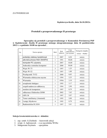 ZATWIERDZAM Kędzierzyn-Koźle, dnia 26.10.2012r. Protokół z przeprowadzonego II przetargu Sporządza się protokół z przeprowadzonego w Komendzie Powiatowej PSP w Kędzierzynie -Koźlu II przetargu ustnego nieograniczonego dnia 26 października 2012 r. o godzinie 10:00 na sprzedaż ; Lp. Nazwa sprzętu Ilość Rok nabycia Cena jednostkowa po wycenie Kategoria majątku zużyty / zbędny 1 podwójny stalowy karabińczyk 1 2007 0,50 zużyty 2 piła łańcuchowa HQV 254XP/G 1 1991 50,00 zużyty 3 komputer PC używany 1 2007 10,00 zużyty 4 Jednostka centralna komputer 1 2000 50,00 zużyty 5 Węże W-75 5 1997 1,25 zużyty 6 Węże W-52 3 1997 1,00 zużyty 7 Przełącznik 75/52 1 2000 0,85 zużyty 8 Wiertarka elektryczna ręczna 1 1994 2,25 zużyty 9 Wiertarka 1 1994r 3,10 zużyty 10 urządzenie ładujące 1 1995 3,17 zużyty 11 zespół nadawczo-odbiorczy 1 1994 2,98 zużyty 12 modem do komputera 1 1997 0,79 zużyty 13 odkurzacz Elektrolux D500 1 2002 7,62 zużyty 14 GPS 38 1 1997 5,07 zużyty 15 Tuner satelitarny (Amstard) 2 1995 5,00 zużyty 16 Lampy błyskowe 4 1995 0,78 zużyty 17 Radiotelefon R-2434 1 1997 3,61 zużyty Sekcja kwatermistrzowska w składzie: 1. asp. sztab. G.Zieliński – kierownik sekcji 2. st.kpt. A. Jędrzejczyk - z-ca naczelnika WOSz 3. Małgorzata Szymura - specjalista 1.Termin i miejsce oraz rodzaj przetargu: Dnia 26 października 2012 roku o godz.10:00 w kwatermistrzostwie (pokój nr 8) Komendy Powiatowej Państwowej Straży Pożarnej w Kędzierzynie –Koźlu przy ul. Kraszewskiego 12, przeprowadzono II przetarg ustny nieograniczony. Przetarg rozpoczął się od przedstawienia regulaminu przetargu. 2.Oznaczenie przedmiotu przetargu: Na wskazany sprzęt w tabeli , wyjaśnień i oświadczeń złożonych przez oferentów: brak 3. Osoby i firmy przystępujące do uczestnictwa w przetargu: brak 4. Cena wywoławcza i najwyższa cena osiągnięta w przetargu: Ceny wywoławcze - ceny wskazane po wycenie wg w/w tabeli -50% (2 przetarg) Cena najwyższa - brak zainteresowanych 5. Uzasadnienie rozstrzygnięć podjętych decyzji : W związku z brakiem zainteresowanych, do licytacji sprzętu i sprzedaży nie doszło. Wnioskujemy o fizyczną likwidację w/w sprzętu przez Komisje ds. oceny i likwidacji KP PSP i przedstawienie protokołów zniszczenia w terminie do 20 listopada 2012r. Likwidację należy przeprowadzić w sposób zgodny z zasadą : - sprzęt elektryczny i elektroniczny - utylizacja z kartą przekazania odpadu - przełącznik i łączniki z węży – złom kolorowy - węże bez łączników – odpady komunalne - piła – złom, złom kolorowy - karabińczyk – złom stalowy 6. Protokół otrzymują: - PF - Komisja ds. oceny i likwidacji KP PSP - a/a Podpisy 1 ........................... 2. ........................... 3. ...........................
