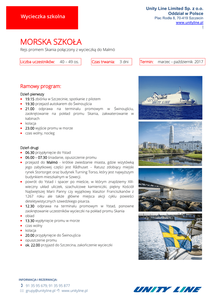 Unity Line Limited Sp. z o.o. Oddział w Polsce Wycieczka szkolna Plac Rodła 8, 70-419 Szczecin www.unityline.pl l MORSKA SZKOŁA Rejs promem Skania połączony z wycieczką do Malmö Liczba uczestników: 40 – 49 os. Czas trwania: 3 dni Ramowy program: Dzień pierwszy 19.15 zbiórka w Szczecinie, spotkanie z pilotem 19.30 przejazd autokarem do Świnoujścia 21.00 odprawa na terminalu promowym w Świnoujściu, zaokrętowanie na pokład promu Skania, zakwaterowanie w kabinach kolacja 23.00 wyjście promu w morze czas wolny, nocleg Dzień drugi 06.30 przypłynięcie do Ystad 06.00 – 07.30 śniadanie, opuszczenie promu przejazd do Malmö - krótkie zwiedzanie miasta, gdzie wizytówką jego zabytkowej części jest Rådhuset – Ratusz zdobiący miejski rynek Stortorget oraz budynek Turning Torso, który jest najwyższym budynkiem mieszkalnym w Szwecji. powrót do Ystad i spacer po mieście, w którym znajdziemy XIIIwieczny układ uliczek, szachulcowe kamieniczki, piękny Kościół Najświętszej Marii Panny czy wyjątkowy klasztor Franciszkanów z 1267 roku ale także główne miejsca akcji cyklu powieści detektywistycznych szwedzkiego pisarza. 12.30 odprawa na terminalu promowym w Ystad, ponowne zaokrętowanie uczestników wycieczki na pokład promu Skania obiad 13.30 wypłynięcie promu w morze czas wolny kolacja 20.00 przypłynięcie do Świnoujścia opuszczenie promu ok. 22.00 przyjazd do Szczecina, zakończenie wycieczki INFORMACJA I REZERWACJA: 91 35 95 679; 91 35 95 877 [email protected] www.unityline.pl Termin: marzec – październik 2017 Wycieczka szkolna Unity Line Limited Sp. z o.o. Oddział w Polsce Plac Rodła 8, 70-419 Szczecin www.unityline.pl l Cena 260 PLN za osobę w kabinie 4-osobowej Cena zawiera: Przejazd promem Skania na trasie Świnoujście – Ystad – Świnoujście Miejsce w kabinie podczas całego rejsu Kolacja na promie Skania na trasie Świnoujście – Ystad Śniadanie na promie Skania na trasie Świnoujście – Ystad Obiad na promie Skania na trasie Ystad – Świnoujście Kolacja na promie Skania na trasie Ystad – Świnoujście Zwiedzanie Malmö Obsługa autokaru na całej trasie wg programu Opieka pilota – przewodnika w trakcie trwania wycieczki Ubezpieczenie NNW i KL Dodatek paliwowy Uwagi Oferta dla grupy minimum 40-49 osobowej. W przypadku zmniejszenia ilości osób w grupie cena oferty ulegnie zmianie. Oferta ważna dla dzieci i młodzieży do lat 19. Wypłynięcie od niedzieli do środy. Oferta nie obowiązuje na rejsy w piątki i soboty. Termin ważności oferty: marzec – październik 2017 (z wyłączeniem lipca i sierpnia). 4 opiekunów z ramienia szkoły – bezpłatnie. Organizator zastrzega sobie prawo do zmiany programu, kolejności zwiedzania. Sugerowane kieszonkowe około 100 SEK. Za dodatkową opłatą istnieje możliwość zorganizowania poniższych atrakcji: Wejście do Muzeum Techniki i Komunikacji w Malmö w której znajduje się wystawa lotnictwa i motoryzacji – 20 PLN za osobę Do zobaczenia na pokładzie! INFORMACJA I REZERWACJA: 91 35 95 679; 91 35 95 877 [email protected] www.unityline.pl m.in.:
