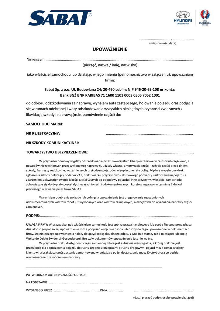 ............................... , .................... (miejscowość; data) UPOWAŻNIENIE Niniejszym................................................................................................................................................. (pieczęć, nazwa / imię, nazwisko) jako właściciel samochodu lub działając w jego imieniu (pełnomocnictwo w załączeniu), upoważniam firmę: Sabat Sp. z o.o. Ul. Budowlana 24; 20-460 Lublin; NIP 946-20-69-108 nr konta: Bank BGŻ BNP PARIBAS 71 1600 1101 0003 0506 7052 1001 do odbioru odszkodowania za naprawę, wynajem auta zastępczego, holowanie pojazdu oraz podjęcia się w ramach odebranej kwoty odszkodowania wszystkich niezbędnych czynności związanych z likwidacją szkody i naprawą (m.in. zamówienie części) do: SAMOCHODU MARKI: ..................................................................................... NR REJESTRACYJNY: ..................................................................................... NR SZKODY KOMUNIKACYJNEJ: ..................................................................................... TOWARZYSTWO UBEZPIECZENIOWE: ..................................................................................... W przypadku odmowy wypłaty odszkodowania przez Towarzystwo Ubezpieczeniowe w całości lub częściowo, z powodów niezawinionych przez wykonawcę naprawy tj. udziały własne, amortyzacja części - zużycie części przed dniem szkody, franszyzy redukcyjne, wcześniejszych uszkodzeń pojazdów, nieopłacone raty polisy, błędnie wypełniony druk zgłoszenia szkody dotyczący podatku VAT, brak związku przyczynowo - skutkowego pomiędzy uszkodzeniami pojazdu a zdarzeniem, zakwestionowania jakości części użytych do odbudowy pojazdu i inne przyczyny, właściciel samochodu zobowiązuje się do dopłaty pozostałych uzasadnionych i udokumentowanych kosztów naprawy w terminie 7 dni od pierwszego wezwania przez firmę SABAT. Warunkiem odebrania pojazdu lub cofnięcia upoważnienia jest uregulowanie uzasadnionych i udokumentowanych kosztów robót już wykonanych oraz kosztów zakupionych, niezbędnych do wykonania naprawy części zamiennych. PODPIS:..................................................................................................................................................... UWAGA FIRMY: W przypadku, gdy właścicielem samochodu jest spółka prawa handlowego lub osoba fizyczna prowadząca działalność gospodarczą, upoważnienie może podpisać wyłącznie osoba lub osoby do tego upoważnione w dokumentach firmy. Do niniejszego upoważnienia należy dołączyć kopię aktualnego odpisu z KRS (nie starszy niż 3 miesiące) lub kopię Wpisu do Działu Ewidencji Gospodarczej. Bez w/w dokumentów upoważnienie jest nie ważne. W przypadku braku dostępności części zamiennej, która jest aktualnie nieosiągalna, a której brak nie jest przeszkodą dla dopuszczenia pojazdu do ruchu zgodnie z przepisami o ruchu drogowym, pojazd może zostać wydany klientowi, a brakująca część zostanie zamontowana w pojeździe po jej dostarczeniu przez Dystrybutora co będzie równoznaczne z zakończeniem naprawy. ___________________________________________________________________ POTWIERDZAM AUTENTYCZNOŚĆ PODPISU: NA PODSTAWIE: …………………………………………………………………… WYDANEGO PRZEZ : ………………………………………….DNIA: …………… ……………………………………………………… (data, pieczęć podpis osoby potwierdzającej)