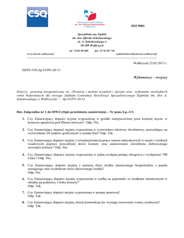 ISO 9001 Specjalistyczny Szpital im. dra Alfreda Sokołowskiego ul. A. Sokołowskiego 4 58-309 Wałbrzych tel. 74/64 89 600 fax 74/ 64 89 746 www.zdrowie.walbrzych.pl [email protected] _________________________________________________________________________________________________________ Wałbrzych 23.05.2013 r. DZPZ-530-Zp/33/PN-28/13 Wykonawcy – wszyscy Dotyczy –przetarg nieograniczony na „Dostawę i montaŜ urządzeń i sprzętu oraz wykonanie niezbędnych robót budowlanych dla nowego Zakładu Centralnej Sterylizacji Specjalistycznego Szpitala im. dra A. Sokołowskiego w Wałbrzychu” - Zp/33/PN-28/13. Dot. Załącznika nr 1 do SIWZ (Opis przedmiotu zamówienia) – Nr pom./Lp.-3/1: 1. Czy Zamawiający dopuści myjnię wyposaŜoną w grzałki umiejscowione poza komorą mycia, w komorze spustowej pod filtrem sitowym? Odp. Nie. 2. Czy Zamawiający dopuści myjnię wyposaŜoną w wyświetlacz tekstowy dwuliniowy, pozwalający na wyświetlanie 20 znaków graficznych w kaŜdej linii? Odp. Tak. 3. Czy Zamawiający dopuści myjnię z wizualną kontrolą pracy ramion natryskowych w myjni i wózkach wsadowych poprzez przeszklone drzwi komory oraz zastosowanie oświetlenia elektrycznego wewnątrz komory? Odp. Nie. 4. Czy Zamawiający dopuści myjnię wyposaŜoną w jedną wydajną pompę obiegową o wydajności 700 l/min.? Odp. Nie. 5. Czy Zamawiający dopuści myjnię z nastawą ilości środka chemicznego bezpośrednio z panela sterującego oraz wydrukiem ilości dozowanego środka? Odp. Nie. 6. Czy Zamawiający dopuści myjnię wyposaŜoną w szafkę na pojemniki ze środkami chemicznymi w obrębie jej podstawy z boku komory? Odp. Tak. 7. Czy Zamawiający dopuści myjnię wyposaŜoną w pompę spustową? Odp. Tak. 8. Czy Zamawiający dopuści myjnię, której konstrukcja nie wymaga stosowania wanny ociekowej? Odp. Tak. Dot. Załącznika nr 1 do SIWZ (Opis przedmiotu zamówienia) – Nr pom./Lp.-3/1.1: 9. Czy Zamawiający dopuści wózek wyposaŜony w wyjmowany zbiornik ociekowy? Odp. Tak. Dot. Załącznika nr 1 do SIWZ (Opis przedmiotu zamówienia) – Nr pom./Lp.-3/1.2: 10. Czy Zamawiający dopuści wózek o wysokości kaŜdego poziomu mycia min. 70mm, z moŜliwością demontaŜu półek i ramion natryskowych w celu umycia przedmiotów o wysokości powyŜej 500mm? Odp. Nie. Dot. Załącznika nr 1 do SIWZ (Opis przedmiotu zamówienia) – Nr pom./Lp.-3/1.5 i 1.6: 11. Czy Zamawiający dopuści wózek z 4 poziomami mycia o wysokości kaŜdego poziomu mycia min. 100mm, z moŜliwością demontaŜu półek i ramion natryskowych w celu umycia przedmiotów o wysokości powyŜej 500mm? Odp. Nie. Dot. Załącznika nr 1 do SIWZ (Opis przedmiotu zamówienia) – Nr pom./Lp.-4/1: 12. Czy Zamawiający dopuści suszarkę o wymiarach wewnętrznych komory suszenia 495x375x1600mm (s x g x w) ? Odp. Nie. 13. Czy Zamawiający dopuści suszarkę z przeszklonymi drzwiami? Odp. Tak. 14. Czy Zamawiający dopuści suszarkę z pojedynczą izolacją termiczną i akustyczną? Odp. Tak. 15. Czy Zamawiający dopuści suszarkę niewymagającą regulacji intensywności nawiewu? Odp. Tak. 16. Czy Zamawiający dopuści suszarkę niewymagającej filtracji dwustopniowej dzięki zastosowaniu filtra elektrostatycznego wielokrotnego uŜytku, z moŜliwością jego mycia i dezynfekcji w myjni automatycznej? Odp. Nie. 17. Czy Zamawiający dopuści suszarkę wyposaŜoną w dwa programy suszenia, zapewniające moŜliwość suszenia zarówno przedmiotów termolabilnych jak i standardowych narzędzi? Odp. Nie. 18. Czy Zamawiający dopuści energooszczędną suszarkę, której konstrukcja została zaprojektowana w celu zastosowania jak najmniejszej mocy elektrycznej wynoszącej 3,5 kW? Odp. Tak. 19. Czy Zamawiający dopuści suszarkę z moŜliwością jednoczesnego załadunku 12 węŜy do aparatury oddechowej oraz 18 tac ½ DIN o wymiarach 240x250x50mm lub 36 węŜy do aparatury oddechowej lub 18 tac 1/1 DIN o wymiarach 485x250x50mm? Odp. Tak. 20. Czy Zamawiający dopuści suszarkę o wysokości nie przekraczającej 2200mm? Odp. Tak. 21. Czy Zamawiający wymaga aby oferowana suszarka była zgodna z Dyrektywą dotyczącą Wyrobów Medycznych 93/42/EEC? Odp. Nie. Dot. Załącznika nr 1 do SIWZ (Opis przedmiotu zamówienia) – Nr pom./Lp.-9/1: 22. Czy Zamawiający dopuści sterylizator bez wodowskazu widocznego na panelu czołowym sterylizatora? Odp. Nie. 23. Czy Zamawiający dopuści sterylizator wyposaŜony w manowakuometr jedynie po stronie załadowczej. Odp. Nie. 24. Czy Zamawiający dopuści sterylizator z systemem autodiagnostyki bez schematu instalacji wewnętrznej? Odp. Nie. 25. Czy Zamawiający dopuści sterylizator bez moŜliwości programowania rozpoczęcia pracy przez sterylizator oraz samoczynnego wykonania programów ? Odp. Nie. 26. Czy Zamawiający dopuści sterylizator o szerokości nie przekraczającej 1200mm? Odp. Tak. Dot. Załącznika nr 1 do SIWZ (Opis przedmiotu zamówienia) – Nr pom./Lp.-14/1: 27. Czy Zamawiający dopuści myjnię o szerokości uŜytkowej komory 1170mm i długości uŜytkowej komory 2200mm? Odp. Nie. 28. Czy Zamawiający dopuści myjnię z drzwiami napędzanymi elektrycznie? Odp. Tak. 29. Czy Zamawiający dopuści myjnię z równomiernie oświetlonym wnętrzem komory wyposaŜoną w mniej niŜ 5 punktów oświetlenia? Odp. Tak. 30. Czy Zamawiający dopuści myjnię z dezynfekcją termiczną (temp. ok. 80-90°C)oraz jednorazowym wykorzystaniem środków myjących i płuczących (brak dodatkowych zbiorników procesowych), pozwalającą na przeprowadzenie do 4 procesów w ciągu godziny, co jest procesem zgodnym z norma PN-EN ISO 15883, w przeciwieństwie do wymaganego rozwiązania? Odp. Nie. 31. Czy Zamawiający dopuści myjnię wyposaŜoną w jedną wydajną pompę obiegową o wydajności 700 l/min.? Odp. Nie. 32. Czy Zamawiający dopuści myjnię z nastawą ilości środka chemicznego bezpośrednio z panela sterującego oraz wydrukiem ilości dozowanego środka? Odp. Nie. 33. Czy Zamawiaj