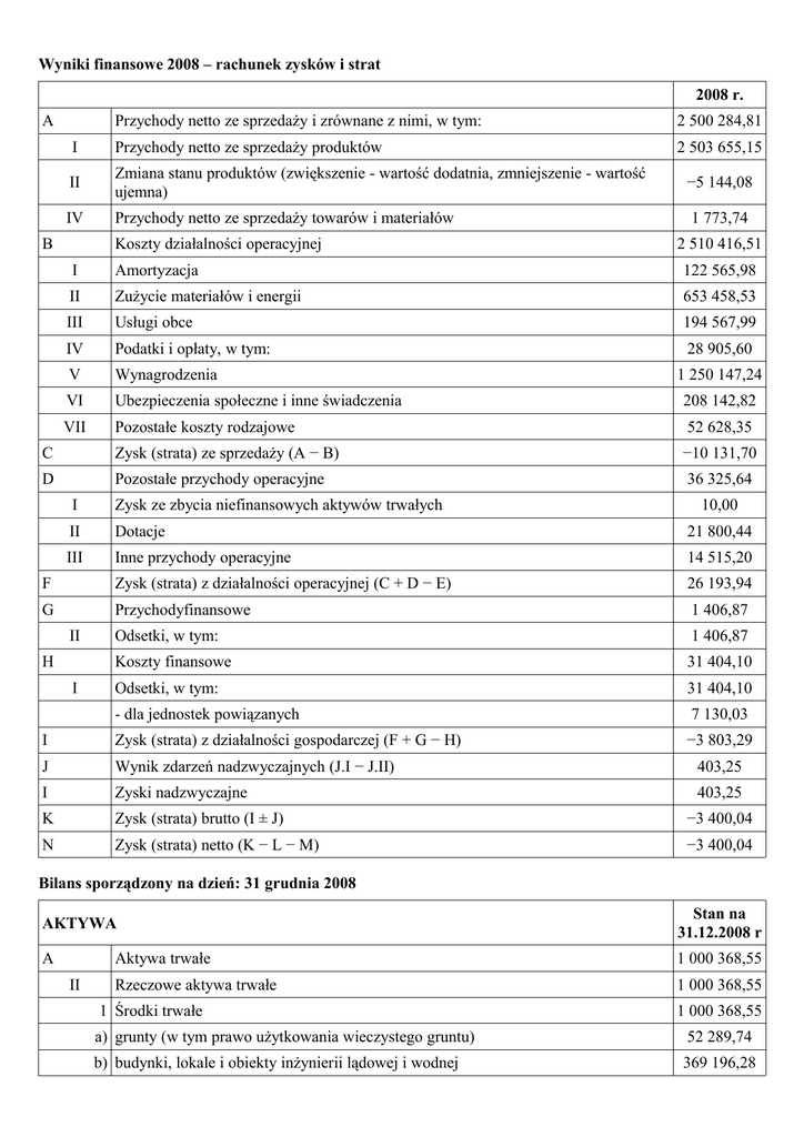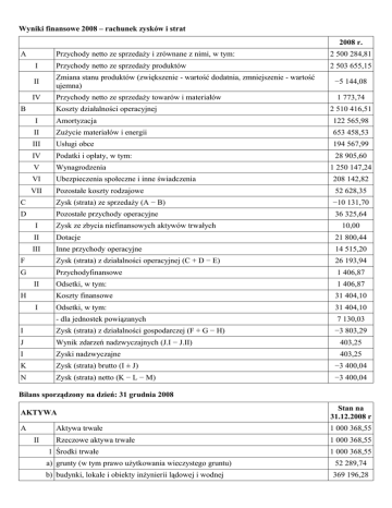 Wyniki finansowe 2008 – rachunek zysków i strat 2008 r. A Przychody netto ze sprzedaży i zrównane z nimi, w tym: 2 500 284,81 I Przychody netto ze sprzedaży produktów 2 503 655,15 II Zmiana stanu produktów (zwiększenie - wartość dodatnia, zmniejszenie - wartość ujemna) −5 144,08 IV Przychody netto ze sprzedaży towarów i materiałów 1 773,74 B Koszty działalności operacyjnej 2 510 416,51 I Amortyzacja 122 565,98 II Zużycie materiałów i energii 653 458,53 III Usługi obce 194 567,99 IV Podatki i opłaty, w tym: 28 905,60 V Wynagrodzenia VI Ubezpieczenia społeczne i inne świadczenia 208 142,82 VII Pozostałe koszty rodzajowe 52 628,35 C Zysk (strata) ze sprzedaży (A − B) −10 131,70 D Pozostałe przychody operacyjne 36 325,64 1 250 147,24 I Zysk ze zbycia niefinansowych aktywów trwałych II Dotacje 21 800,44 III Inne przychody operacyjne 14 515,20 F Zysk (strata) z działalności operacyjnej (C + D − E) 26 193,94 G Przychodyfinansowe 1 406,87 Odsetki, w tym: 1 406,87 Koszty finansowe 31 404,10 Odsetki, w tym: 31 404,10 - dla jednostek powiązanych 7 130,03 I Zysk (strata) z działalności gospodarczej (F + G − H) −3 803,29 J Wynik zdarzeń nadzwyczajnych (J.I − J.II) 403,25 I Zyski nadzwyczajne 403,25 K Zysk (strata) brutto (I ± J) −3 400,04 N Zysk (strata) netto (K − L − M) −3 400,04 II H I 10,00 Bilans sporządzony na dzień: 31 grudnia 2008 AKTYWA Stan na 31.12.2008 r A Aktywa trwałe 1 000 368,55 Rzeczowe aktywa trwałe 1 000 368,55 II 1 Środki trwałe 1 000 368,55 a) grunty (w tym prawo użytkowania wieczystego gruntu) 52 289,74 b) budynki, lokale i obiekty inżynierii lądowej i wodnej 369 196,28 c) urządzenia techniczne i maszyny d) środki transportu B Aktywa obrotowe I 578 277,00 145 415,76 Zapasy 7 237,65 1 Materiały 7 237,65 II Należności krótkoterminowe 24 998,50 2 Należności od pozostałych jednostek 24 998,50 a) z tytułu dostawy i usług, o okresie spłaty: 7 961,44 b) - do 12 miesięcy 7 961,44 z tytułu podatków, dotacji, ceł, ubezpieczeń społecznych i zdrowotnych oraz innych świadczeń 5 037,06 c) inne III Inwestycje krótkoterminowe 12 000,00 82 239,97 1 Krótkoterminowe aktywa finansowe 82 239,97 c) środki pieniężne i inne aktywa pieniężne 82 239,97 IV - środki pieniężne w kasie i na rachunkach 80 958,37 - inne aktywa pieniężne 1 281,60 Krótkoterminowe rozliczenia międzyokresowe 30 939,64 AKTYWA razem (suma poz. A i B) 1 145 784,31 Stan na 31.12.2008 r . PASYWA A 605,53 Kapitał (fundusz) własny 581 932,93 Kapitał (fundusz) podstawowy 950 000,00 VII Zysk (strata) z lat ubiegłych −364 667,03 VIII Zysk (strata) netto −3 400,04 Zobowiązania i rezerwy na zobowiązania 563 851,38 Zobowiązania długoterminowe 380 000,00 I B II III 2 Wobec pozostałych jednostek 380 000,00 a) kredyty i pożyczki 380 000,00 Zobowiązania krótkoterminowe 2 Wobec pozostałych jednostek d) z tytułu dostawy i usług, o okresie wymagalności: - do 12 miesięcy IV 131 561,68 119 897,51 24 063,43 24 063,43 g) z tytułu podatków, ceł, ubezpieczeń i innych świadczeń 63 406,14 h) z tytułu wynagrodzeń 30 299,94 i) inne 2 128,00 3 Fundusze specjalne 11 664,17 Rozliczenia międzyokresowe 2 Inne rozliczenia międzyokresowe - długoterminowe 52 289,70 52 289,70 52 289,70 PASYWA razem (suma poz. A i B) 1 145 784,31