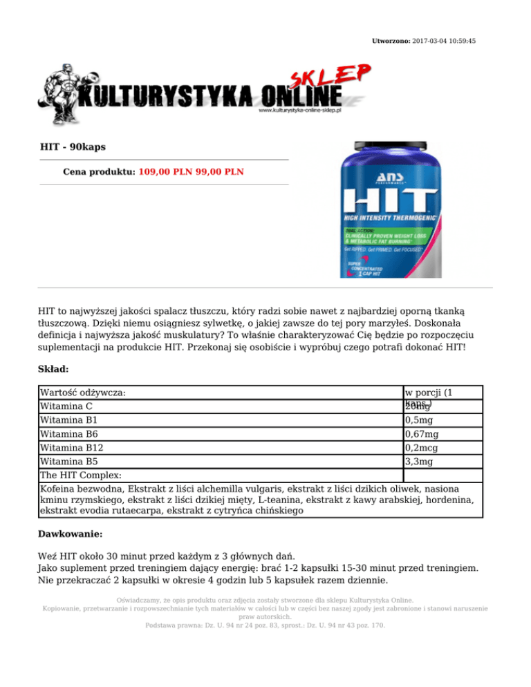 Utworzono: 2017-03-04 10:59:45 HIT - 90kaps Cena produktu: 109,00 PLN 99,00 PLN HIT to najwyższej jakości spalacz tłuszczu, który radzi sobie nawet z najbardziej oporną tkanką tłuszczową. Dzięki niemu osiągniesz sylwetkę, o jakiej zawsze do tej pory marzyłeś. Doskonała definicja i najwyższa jakość muskulatury? To właśnie charakteryzować Cię będzie po rozpoczęciu suplementacji na produkcie HIT. Przekonaj się osobiście i wypróbuj czego potrafi dokonać HIT! Skład: Wartość odżywcza: Witamina C w porcji (1 kaps.) 20mg Witamina B1 0,5mg Witamina B6 0,67mg Witamina B12 0,2mcg Witamina B5 3,3mg The HIT Complex: Kofeina bezwodna, Ekstrakt z liści alchemilla vulgaris, ekstrakt z liści dzikich oliwek, nasiona kminu rzymskiego, ekstrakt z liści dzikiej mięty, L-teanina, ekstrakt z kawy arabskiej, hordenina, ekstrakt evodia rutaecarpa, ekstrakt z cytryńca chińskiego Dawkowanie: Weź HIT około 30 minut przed każdym z 3 głównych dań. Jako suplement przed treningiem dający energię: brać 1-2 kapsułki 15-30 minut przed treningiem. Nie przekraczać 2 kapsułki w okresie 4 godzin lub 5 kapsułek razem dziennie. Oświadczamy, że opis produktu oraz zdjęcia zostały stworzone dla sklepu Kulturystyka Online. Kopiowanie, przetwarzanie i rozpowszechnianie tych materiałów w całości lub w części bez naszej zgody jest zabronione i stanowi naruszenie praw autorskich. Podstawa prawna: Dz. U. 94 nr 24 poz. 83, sprost.: Dz. U. 94 nr 43 poz. 170. Adres: http://www.ko.sklep.pl/ Telefon: kom. 782 010 880 Email: [email protected]