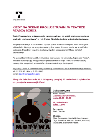 KIEDY NA SCENIE KRÓLUJE TUWIM, W TEATRZE RZĄDZĄ DZIECI. Teatr Powszechny w Warszawie zaprasza dzieci ze szkół podstawowych na spektakl „Lokomotywa” w reż. Piotra Cieplaka i udział w teatralnej zabawie. Jaką tajemnicę kryje w sobie teatr? Tysiące pokoi, osiemset zakrętów, tuzin rekwizytów i miliony ludzi. Do tego nie wszystko widać gołym okiem. Czasem trzeba się schylić albo podejrzeć. Przejdźmy wspólnie ten labirynt pełen niespodzianek! Macie ochotę? Zapraszamy! Po spektaklach 28 marca i 15, 16 kwietnia zapraszamy na warsztaty „Tajemnice Teatru”, podczas których grupy mogą zwiedzić przestrzenie naszego Teatru w formie wesołej zabawy. Dla wszystkich uczestników „dyplom teatralnego detektywa”! Aby wziąć udział w zabawie należy wcześniej skontaktować się z Biurem Obsługi Widzów: tel.: 22 818 48 19 (w g. 9.00-16.00) e-mail: bow@powszechny. com Bilety dla dzieci w cenie 30 zł. Dla grupy powyżej 20 osób dwóch opiekunów otrzymuje darmowe wejściówki. Lokomotywa Julian Tuwim Zapraszamy 28 marca, godz.11.00 i 13.00 15, 16 kwietnia, godz. 12.00 Reżyseria Piotr Cieplak Obsada Eliza Borowska, Maria Robaszkiewicz, Olga Sawicka, Mariusz Benoit, Andrzej Mastalerz, Sławomir Pacek Kiedy wszyscy domownicy idą już spać, budzą się Oni – małe istoty zamieszkujące nasze mieszkania. Dla nich łyżka do butów to zjeżdżalnia, a wieszak na ubrania to cel dalekiej wyprawy. Marzą, śmieją się, kłócą, smucą i… bawią w teatr. Mądry, dowcipny spektakl Piotra Cieplaka jest w całości oparty na najpopularniejszych wierszach Juliana Tuwima. W brawurowym wykonaniu znane wiersze – Lokomotywa, Pan Hilary, Ptasie radio czy Zosia Samosia - zyskują nowe, zaskakujące brzmienie. Więcej informacji na stronie: http://www.powszechny.com Informacja i rezerwacje: Biuro Obsługi Widzów tel.: 22 818 48 19 (w g. 9.00-16.00) e-mail: [email protected] Kasa biletowa Teatru tel.: 22 818 25 16 e-mail: [email protected] www.powszechny.com