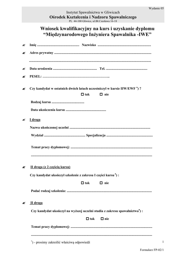 Wydanie 05 Instytut Spawalnictwa w Gliwicach Ośrodek Kształcenia i Nadzoru Spawalniczego PL 44-100 Gliwice, ul.Bł.Czesława 16-18 Wniosek kwalifikacyjny na kurs i uzyskanie dyplomu “Międzynarodowego Inżyniera Spawalnika -IWE” Imię ................................................. Nazwisko .............................................................. Adres prywatny ................................................................................................................. .............................................................................................................................................. Data urodzenia ................................................... Tel. ................................................ PESEL: ………………………………………………….. Czy kandydat w ostatnich dwóch latach uczestniczył w kursie IIW/EWF ∗) ? tak nie Rodzaj kursu ...................................... Data ukończenia kursu ............................................... I droga Nazwa ukończonej uczelni .............................................................................................. Wydział ................................................ Specjalizacja ...................................................... Temat pracy dyplomowej: ............................................................................................... ............................................................................................................................................. II droga (z 2 częścią kursu) Czy kandydat ukończył szkolenie z zakresu I części kursu ∗) : tak nie Podać rodzaj szkolenia: ................................................................................................... II droga Czy kandydat ukończył na wyższej uczelni studia z zakresu spawalnictwa∗) : tak nie Temat pracy dyplomowej: ............................................................................................... ............................................................................................................................................. ∗ ) - prosimy zakreślić właściwą odpowiedź 1 Formularz FP-02/1 Wydanie 05 Instytut Spawalnictwa w Gliwicach Ośrodek Kształcenia i Nadzoru Spawalniczego PL 44-100 Gliwice, ul.Bł.Czesława 16-18 Czy kandydat ukończył na wyższej uczelni studia podyplomowe z zakresu spawalnictwa – min. 350 godz. ∗) : tak nie Temat pracy podyplomowej: ........................................................................................... ............................................................................................................................................. Data ...................................... Podpis kandydata ................................................ Aktualne miejsce i okres zatrudnienia Pieczęć firmowa .......................................................................................... .......................................................................................... Czy kandydat w ramach pełnienia swoich obowiązków na stanowisku spawalniczym działał w ramach swoich kompetencji i ich nie przekroczył∗): tak Data ............................................... nie Podpis i pieczątka pracodawcy .......................................................... Do wniosku prosimy dołączyć: - kopię dyplomu (I i II droga) - kopię ostatniej strony indeksu z wpisanym tematem pracy dyplomowej (I i II droga) - kopię świadectwa szkolenia spawalniczego (II droga, z 2 częścią kursu) - kopię świadectwa studiów podyplomowych (II droga) ∗ ) - prosimy zakreślić właściwą odpowiedź 2 Formularz FP-02/1