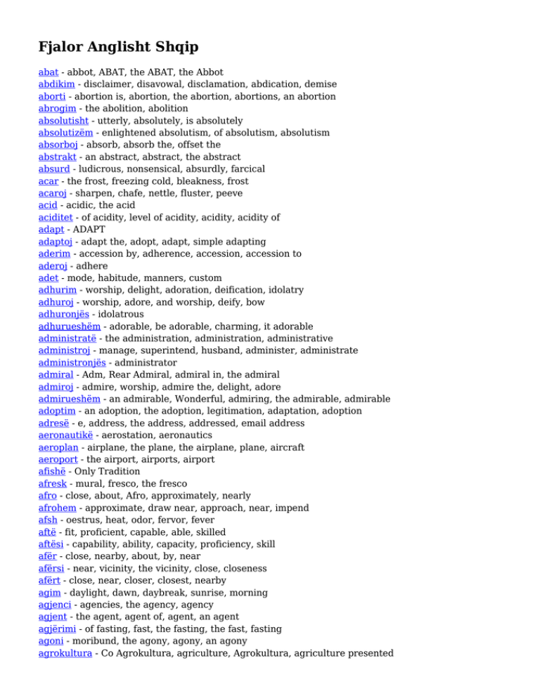 Fjalor Anglisht Shqip abat - abbot, ABAT, the ABAT, the Abbot abdikim - disclaimer, disavowal, disclamation, abdication, demise aborti - abortion is, abortion, the abortion, abortions, an abortion abrogim - the abolition, abolition absolutisht - utterly, absolutely, is absolutely absolutizëm - enlightened absolutism, of absolutism, absolutism absorboj - absorb, absorb the, offset the abstrakt - an abstract, abstract, the abstract absurd - ludicrous, nonsensical, absurdly, farcical acar - the frost, freezing cold, bleakness, frost acaroj - sharpen, chafe, nettle, fluster, peeve acid - acidic, the acid aciditet - of acidity, level of acidity, acidity, acidity of adapt - ADAPT adaptoj - adapt the, adopt, adapt, simple adapting aderim - accession by, adherence, accession, accession to aderoj - adhere adet - mode, habitude, manners, custom adhurim - worship, delight, adoration, deification, idolatry adhuroj - worship, adore, and worship, deify, bow adhuronjës - idolatrous adhurueshëm - adorable, be adorable, charming, it adorable administratë - the administration, administration, administrative administroj - manage, superintend, husband, administer, administrate administronjës - administrator admiral - Adm, Rear Admiral, admiral in, the admiral admiroj - admire, worship, admire the, delight, adore admirueshëm - an admirable, Wonderful, admiring, the admirable, admirable adoptim - an adoption, the adoption, legitimation, adaptation, adoption adresë - e, address, the address, addressed, email address aeronautikë - aerostation, aeronautics aeroplan - airplane, the plane, the airplane, plane, aircraft aeroport - the airport, airports, airport afishë - Only Tradition afresk - mural, fresco, the fresco afro - close, about, Afro, approximately, nearly afrohem - approximate, draw near, approach, near, impend afsh - oestrus, heat, odor, fervor, fever aftë - fit, proficient, capable, able, skilled aftësi - capability, ability, capacity, proficiency, skill afër - close, nearby, about, by, near afërsi - near, vicinity, the vicinity, close, closeness afërt - close, near, closer, closest, nearby agim - daylight, dawn, daybreak, sunrise, morning agjenci - agencies, the agency, agency agjent - the agent, agent of, agent, an agent agjërimi - of fasting, fast, the fasting, the fast, fasting agoni - moribund, the agony, agony, an agony agrokultura - Co Agrokultura, agriculture, Agrokultura, agriculture presented ahur - stable, cots, cot, cowshed, Cribs ai - it, one, that, him, he ajo - it, what, that, she ajros - ventilates the, ventilate, ventilates, it ventilates akademia - academics, academies, the academy, academia, academy aksident - crash, accident, casualty, the accident, wreck akt - an act, act, act of, action, acts aktivitet - activities, business, event, activity, swing aktivizohem - activate aktor - player, stakeholder, an actor, actors, actor aktori - actor, star, the actor akull - ice, the ice alfabeti - script, the alphabet, alphabet alkohol - of alcohol, drinking alcohol, alcohol, alcohol there alpinizëm - the mountaineering, mountaineering, mountain climbing, climbing ambasadat - embassy, the embassies, embassies amfiteatër - bowl, circus, amphitheater, the amphitheater amtar - native, maternal analiza - analyzes, tests, the analysis, analysis of, analysis anatomia - the anatomy, Anatomy of, anatomy, dissection, Anatomia andaj - so, hence, therefore, thus andej - from there, away, there, thence anekënd - throughout, around, across, around the, throughout the anestezi - the anesthesia, anesthesia, anesthetics, analgesia, anesthetic anethum - hyphen ankesë - a complaint, an appeal, appeal, complaint, grievance ankohem - grouse, moan, whine, complain, growl ankth - nightmare, distress, anguish, anxiety, jitters anonim - anonymous, Anonim, the anonymous, Us, named ansambël - ensemble, ensemble of, the ensemble antidoti - antidote to, antidote antik - Antik, antique, the ancient, antic, ancient antikitet - the antiquity, ancient times, ancient, antiquity the, antiquity antropologjia - anthropology, the anthropology, anthropologies, Systemz anulloj - invalidate it, cancel, invalidate, cancel my anë - part, side, through, hand, by anëtar - a member of, member, member of, members, a member apartament - the apartment, apartment, flat apo - or, or the, and ar - gold, of gold ardhshëm - next, the future, prospective, future, upcoming arenë - theater, arena, an arena, scaffold, the arena argjend - of silver, and silver, up silver, silver argjendi - the silver, of silver, silver argjendtë - a silver, silver, the silver, silvery argjilë - earthenware, pug, Pug The, clay argëtim - recreation, entertainment, pastime, amusement, fun ari - gold, of gold, bear, the gold, golden arkeologjia - archeology, Archaeology, archeology is, the archeology arkeologjik - archeological, archeology, the archaeological, archaeological site, archaeological arkitektura - architectural, architectures, the architecture, architecture arkitekturor - architectural structure, architectural, architecture, an architectural structure, The architectural arkitekturë - architectural, architectorial, architecture, architecture of arkëtar - checker, cashier, treasurer, booking clerk, paymaster armik - hostile, the enemy, an enemy, foe, enemy arnoj - vamp, cobble, doctor, mend, patch aromë - aroma, odor, fragrance, scent, flavor arrij - reach, catch, achieve, overtake, arrive arritje - arrival, accomplishment, achievement, success, attainment arrë - walnut, the nut, nit, nut arsim - the education, educational, educated, education arsye - reason, why, cause, reasons, therefore art - the art, workmanship, arts, art The arteria - artery arti - the art, arts, of art, art artificial - the artificial, synthetical, bait, false artikull - the article, item, article, item has artisti - the artist, artist, artists, entertainer artistik - artistic, an artistic, feature, the artistic, art artizan - artisan, handicraftsman, art