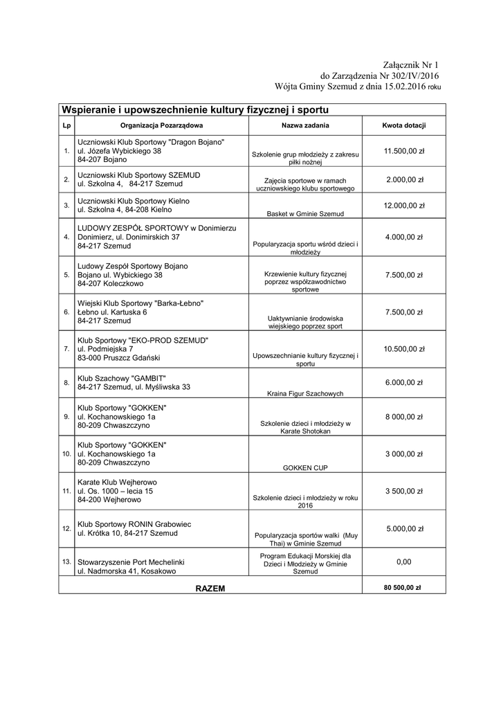Załącznik Nr 1 do Zarządzenia Nr 302/IV/2016 Wójta Gminy Szemud z dnia 15.02.2016 roku Wspieranie i upowszechnienie kultury fizycznej i sportu Lp 1. 2. Organizacja Pozarządowa Uczniowski Klub Sportowy "Dragon Bojano" ul. Józefa Wybickiego 38 84-207 Bojano Uczniowski Klub Sportowy SZEMUD ul. Szkolna 4, 84-217 Szemud 3. Uczniowski Klub Sportowy Kielno ul. Szkolna 4, 84-208 Kielno 4. LUDOWY ZESPÓŁ SPORTOWY w Donimierzu Donimierz, ul. Donimirskich 37 84-217 Szemud 5. Ludowy Zespół Sportowy Bojano Bojano ul. Wybickiego 38 84-207 Koleczkowo 6. Wiejski Klub Sportowy "Barka-Łebno" Łebno ul. Kartuska 6 84-217 Szemud 7. Klub Sportowy "EKO-PROD SZEMUD" ul. Podmiejska 7 83-000 Pruszcz Gdański 8. Klub Szachowy "GAMBIT" 84-217 Szemud, ul. Myśliwska 33 9. Klub Sportowy "GOKKEN" ul. Kochanowskiego 1a 80-209 Chwaszczyno Zajęcia sportowe w ramach uczniowskiego klubu sportowego Basket w Gminie Szemud Popularyzacja sportu wśród dzieci i młodzieży Krzewienie kultury fizycznej poprzez współzawodnictwo sportowe Uaktywnianie środowiska wiejskiego poprzez sport Upowszechnianie kultury fizycznej i sportu Szkolenie dzieci i młodzieży w Karate Shotokan Klub Sportowy "GOKKEN" 80-209 Chwaszczyno GOKKEN CUP Karate Klub Wejherowo 11. ul. Os. 1000 – lecia 15 Szkolenie dzieci i młodzieży w roku 2016 84-200 Wejherowo Klub Sportowy RONIN Grabowiec ul. Krótka 10, 84-217 Szemud Popularyzacja sportów walki (Muy Thai) w Gminie Szemud 13. Stowarzyszenie Port Mechelinki ul. Nadmorska 41, Kosakowo Szkolenie grup młodzieży z zakresu piłki nożnej Kraina Figur Szachowych 10. ul. Kochanowskiego 1a 12. Nazwa zadania RAZEM Program Edukacji Morskiej dla Dzieci i Młodzieży w Gminie Szemud Kwota dotacji 11.500,00 zł 2.000,00 zł 12.000,00 zł 4.000,00 zł 7.500,00 zł 7.500,00 zł 10.500,00 zł 6.000,00 zł 8 000,00 zł 3 000,00 zł 3 500,00 zł 5.000,00 zł 0,00 80 500,00 zł