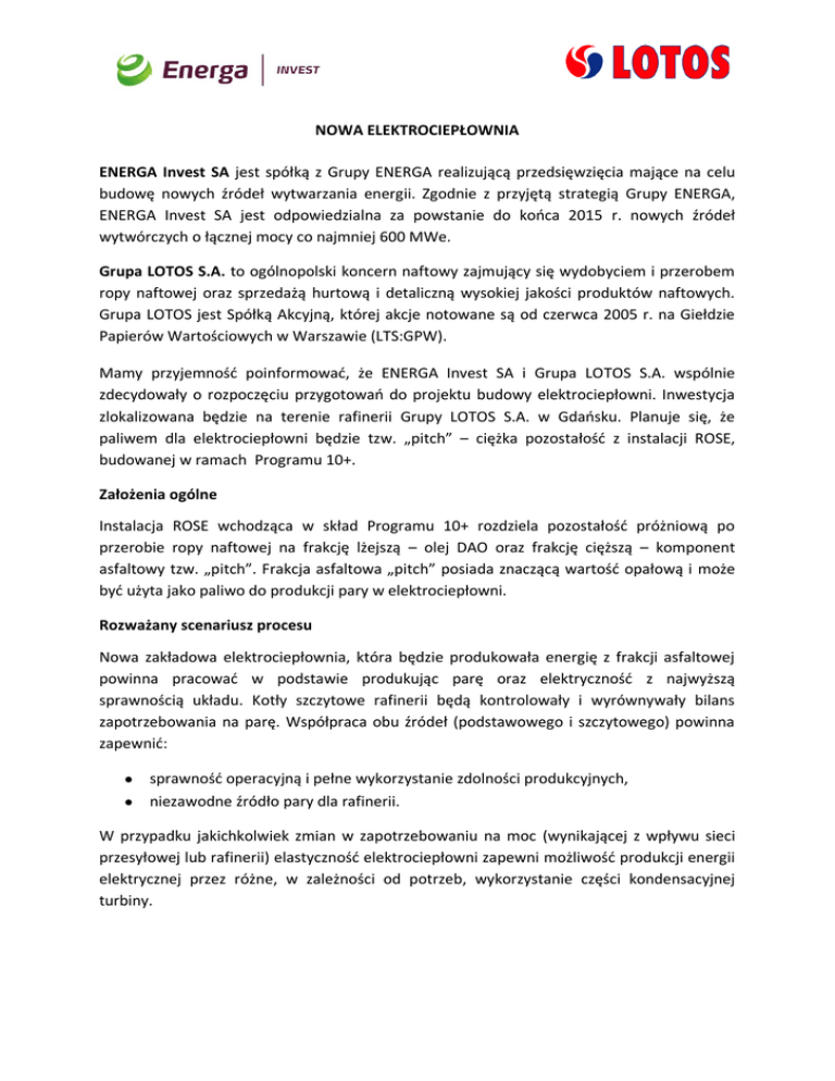 NOWA ELEKTROCIEPŁOWNIA ENERGA Invest SA jest spółką z Grupy ENERGA realizującą przedsięwzięcia mające na celu budowę nowych źródeł wytwarzania energii. Zgodnie z przyjętą strategią Grupy ENERGA, ENERGA Invest SA jest odpowiedzialna za powstanie do kooca 2015 r. nowych źródeł wytwórczych o łącznej mocy co najmniej 600 MWe. Grupa LOTOS S.A. to ogólnopolski koncern naftowy zajmujący się wydobyciem i przerobem ropy naftowej oraz sprzedażą hurtową i detaliczną wysokiej jakości produktów naftowych. Grupa LOTOS jest Spółką Akcyjną, której akcje notowane są od czerwca 2005 r. na Giełdzie Papierów Wartościowych w Warszawie (LTS:GPW). Mamy przyjemnośd poinformowad, że ENERGA Invest SA i Grupa LOTOS S.A. wspólnie zdecydowały o rozpoczęciu przygotowao do projektu budowy elektrociepłowni. Inwestycja zlokalizowana będzie na terenie rafinerii Grupy LOTOS S.A. w Gdaosku. Planuje się, że paliwem dla elektrociepłowni będzie tzw. „pitch” – ciężka pozostałośd z instalacji ROSE, budowanej w ramach Programu 10+. Założenia ogólne Instalacja ROSE wchodząca w skład Programu 10+ rozdziela pozostałośd próżniową po przerobie ropy naftowej na frakcję lżejszą – olej DAO oraz frakcję cięższą – komponent asfaltowy tzw. „pitch”. Frakcja asfaltowa „pitch” posiada znaczącą wartośd opałową i może byd użyta jako paliwo do produkcji pary w elektrociepłowni. Rozważany scenariusz procesu Nowa zakładowa elektrociepłownia, która będzie produkowała energię z frakcji asfaltowej powinna pracowad w podstawie produkując parę oraz elektrycznośd z najwyższą sprawnością układu. Kotły szczytowe rafinerii będą kontrolowały i wyrównywały bilans zapotrzebowania na parę. Współpraca obu źródeł (podstawowego i szczytowego) powinna zapewnid: sprawnośd operacyjną i pełne wykorzystanie zdolności produkcyjnych, niezawodne źródło pary dla rafinerii. W przypadku jakichkolwiek zmian w zapotrzebowaniu na moc (wynikającej z wpływu sieci przesyłowej lub rafinerii) elastycznośd elektrociepłowni zapewni możliwośd produkcji energii elektrycznej przez różne, w zależności od potrzeb, wykorzystanie części kondensacyjnej turbiny. Uwarunkowania środowiskowe Elektrociepłownia będzie spełniała normy emisji spalin obowiązujące od 2016: emisja NOx nie przekraczająca 100 mg/Nm3, emisja SO2 nie przekraczająca 150 mg/Nm3, emisja pyłów nie przekraczająca 20 mg/Nm3. Harmonogram Wstępny harmonogram realizacji projektu budowy elektrociepłowni przewiduje następujące daty kluczowe: Wybór dostawcy projektu bazowego - pierwszy kwartał 2011 Uruchomienie elektrociepłowni - drugi kwartał 2015 Dodatkowe informacje Firmy zainteresowane projektem prosimy o odpowiedź na poniższe pytania: 1. W czym specjalizuje się Paostwa firma: dostawa technologii/licencji, wykonawstwo projektu bazowego, generalne wykonawstwo? 2. Jakie referencje w energetyce z użyciem podobnego paliwa posiada Paostwa firma? Czy jest możliwe złożenie wizyt referencyjnych? 3. Prosimy o wskazanie proponowanej technologii razem ze schematem blokowym. 4. Jak wyglądał harmonogram podobnych projektów wdrożonych przez Paostwa dotychczas? 5. Jaka powierzchnia jest w przybliżeniu potrzebna do ulokowania elektrociepłowni. Odpowiedzi na powyższe pytania prosimy kierowad, listownie lub za pomocą poczty elektronicznej do Pani Beaty Sys do dnia 15 września 2010 (email: [email protected]). Beata Sys Grupa LOTOS S.A. Biuro SA Elbląska 135 80-718 Gdańsk Więcej szczegółowych informacje na temat elektrociepłowni zostanie przekazana po podpisaniu oświadczenia o zachowaniu poufności.