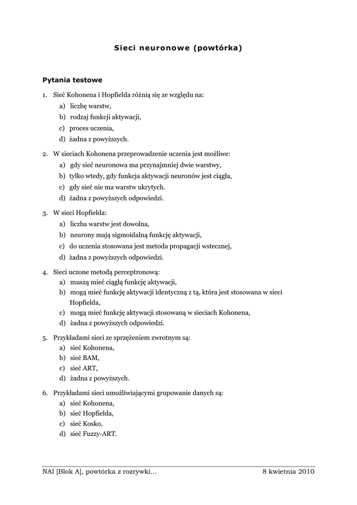 Sieci neuronowe (powtórka) Pytania testowe 1. Sieć Kohonena i Hopfielda różnią się ze względu na: a) liczbę warstw, b) rodzaj funkcji aktywacji, c) proces uczenia, d) żadna z powyższych. 2. W sieciach Kohonena przeprowadzenie uczenia jest możliwe: a) gdy sieć neuronowa ma przynajmniej dwie warstwy, b) tylko wtedy, gdy funkcja aktywacji neuronów jest ciągła, c) gdy sieć nie ma warstw ukrytych. d) żadna z powyższych odpowiedzi. 3. W sieci Hopfielda: a) liczba warstw jest dowolna, b) neurony mają sigmoidalną funkcję aktywacji, c) do uczenia stosowana jest metoda propagacji wstecznej, d) żadna z powyższych odpowiedzi. 4. Sieci uczone metodą perceptronową: a) muszą mieć ciągłą funkcję aktywacji, b) mogą mieć funkcję aktywacji identyczną z tą, która jest stosowana w sieci Hopfielda, c) mogą mieć funkcję aktywacji stosowaną w sieciach Kohonena, d) żadna z powyższych odpowiedzi. 5. Przykładami sieci ze sprzężeniem zwrotnym są: a) sieć Kohonena, b) sieć BAM, c) sieć ART, d) żadna z powyższych. 6. Przykładami sieci umożliwiającymi grupowanie danych są: a) sieć Kohonena, b) sieć Hopfielda, c) sieć Kosko, d) sieć Fuzzy-ART. NAI [Blok A], powtórka z rozrywki... 8 kwietnia 2010 Ćwiczenie 1 Czy neuron z rysunku 2 jest częścią sieci Hopfielda czy Kohonena? Jeśli moŜe być elementem składowym sieci Hopfielda, to co moŜna o nim dodatkowo powiedzieć? W jakim przypadku stanowiłby element składowy sieci Kohonena? 3 0 f 9 Rysunek 1 Ćwiczenie 2 Wypisz po trzy cechy stanowiące podobieństwa i róŜnice wymienionych poniŜej sieci. Uwzględnij budowę, sposób uruchomienia, proces uczenia. sieci podobieństwa róŜnice jednowarstwowa vs. Hopfielda wielowarstwowa vs. Kohonena NAI [Blok A], powtórka z rozrywki... 8 kwietnia 2010