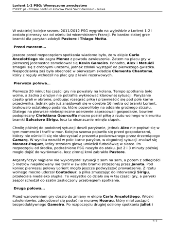 Lorient 1-2 PSG: Wymęczone zwycięstwo PSGFC.pl - Polskie centrum kibiców Paris Saint-Germain - News W ostatniej kolejce sezonu 2011/2012 PSG wygrało na wyjeździe z Lorient 1-2 i zostało pierwszy raz od ośmiu lat wicemistrzem Francji. Po bardzo słabej grze bramki dla paryżan zdobyli Pastore i Thiago Motta. Przed meczem… Jeszcze przed rozpoczęciem spotkania wiadomo było, że w ekipie Carlo Ancelottiego nie zagra Menez z powodu zawieszenia. Zatem na placu gry w pierwszej jedenastce zameldował się Kevin Gameiro. Ponadto, Alex i Matuidi zmagali się z drobnymi urazami, jednak zdołali wystąpić od pierwszego gwizdka. Niespodzianką zaś była obecność w pierwszym składzie Clementa Chantoma, który z reguły wchodził na plac gry z ławki rezerwowych. Pierwsza połowa… Pierwsze 20 minut tej części gry nie powalały na kolana. Tempo spotkania było wolne, a żadna z drużyn nie potrafiła wykreować klarownej sytuacji. Paryżanie często grali w obronie, próbując rozegrać piłkę i przemieścić się pod pole karne przeciwnika. Jednak gdy już znajdowali się w obrębie 16 metra od bramki Lorient, brakowało ostatniego podania, które pozwoliłoby na oddanie groźnego strzału. Dlatego na pierwsze niebezpieczne uderzenie zapracowali gospodarze, bowiem podopieczny Christiana Gourcuffa mocno posłał piłkę z rzutu wolnego w kierunku bramki Salvatore Sirigu, lecz ta nieznacznie minęła słupek. Chwilę później do podobnej sytuacji doszli paryżanie, jednak Alex nie popisał się w tym momencie i trafił w mur. Kolejna szansa pojawiła się przed gospodarzami, którzy nie ośmielili się nie skorzystać z prezentu podarowanego przez drzemiącego Camarę. W wyniku wrzutki w pole karne paryżan, w dogodnej sytuacji znalazł się Monnet-Paquet, który strzałem głową umieścił futbolówkę w siatce. Po rozpoczęciu od środka, podrażnione PSG ruszyło do ataku. Już 2 i 3 minuty później mogło dojść do wyrównania, lecz zimnej krwi zabrakło Pastore. Argentyńczyk najpierw nie wykorzystał sytuacji z sam na sam, a potem z odległości 5 metrów niepilnowany nie trafił w światło bramki strzeżonej przez Janota. Pod koniec pierwszej połowy Lorient mogło jeszcze podwyższyć prowadzenie. Z rzutu wolnego mocno uderzał Coutadeur, a piłka zmuszając do interwencji Sirigu, przeleciała niedaleko słupka. To wszystko co działo się w tej części gry, a paryski zespół schodził do szatni zaskoczony przebiegiem spotkania. Druga połowa… Przed wznowieniem gry doszło do zmiany w ekipie Carlo Ancelottiego. Włoski szkoleniowiec zdecydował się posłać na murawę Hoarau, który miał zastąpić bezproduktywnego Gameiro. Po rozpoczęciu drugiej odsłony spotkania Jallet i 1/3 Lorient 1-2 PSG: Wymęczone zwycięstwo PSGFC.pl - Polskie centrum kibiców Paris Saint-Germain - News spółka zaczęli grać agresywniej i częściej gościli na połowie Lorient. I tak po jednej z akcji kapitana, PSG doprowadziło do wyrównania. Górną piłkę w pole karne otrzymał Pastore, który spróbował strzału z główki. Słupek! Dobitka partnera z zespołu, Janot broni, futbolówka znów trafia do El Flaco, a ten spokojnie wykańcza akcję. 1-1. To zezłościło ambitnie grających gospodarzy szukających punktów w tym meczu. Parę chwil później sprawy w swoje ręce wziął Campbell. Spróbował strzału z dystansu, który po rykoszecie niebezpiecznie wylądował tuż za poprzeczką PSG. Następnie miał miejsce jeden z wielu momentów, kiedy goście nie potrafili wyjść z własnej obrony. Jednak przy kolejnej wycieczce na połowę rywali doszło do rzutu rożnego dla drużyny ze stolicy Francji. Wykonawcą nie mógł być nikt inny, jak Nene. Brazylijczyk doskonale dośrodkował na czyhającego w polu karnym Thiago Mottę, a Włoch wygrywając walkę z obrońcą, skierował piłkę do bramki przeciwników, tym samym dając prowadzenie swojej ekipie! Na tablicy widniał już wynik 1-2 dla wicelidera rozgrywek. Jeszcze w 85 minucie meczu rezultat mógł ulec zmianie dzięki główkującemu Bodmerowi, lecz niewiele zabrakło, ponieważ strzał Francuza ledwo minął bramkę Janota. Do końca spotkania żadna z obu drużyn nie zdołała wypracować sobie dogodnej sytuacji i wynik nie zmienił się, a paryżanie wywieźli 3 punkty z Lorient. Następnie przyszła pora na wyczekiwanie wiadomości z Auxerre, gdzie liderujące Montpellier walczyło o mistrzostwo Ligue 1. Niestety mimo prowadzenia ostatniej drużyny ligi, John Utaka najpierw doprowadził do wyrównania, a później dobił gospodarzy, ustalając wynik spotkania na 1-2 dla Montpellier, które świętuje zdobycie mistrzostwa Francji. Podsumowanie… Na szczęście ten mecz już za nami… Co prawda Paris Saint-Germain wygrało z walczącym o utrzymanie Lorient, ale należy przyznać, że w bardzo kiepskim stylu. To znaczy… bez stylu. Ciężko dostrzec pozytywy po dzisiejszej grze podopiecznych Carlo Ancelottiego, ponieważ dziś wyraźnie się nie kleiła. Paryżanie zagrali bez pomysłu, bezskutecznie próbując wydostać się spod wysokiego pressingu rywali. Środkowi pomocnicy nie rozgrywali dziś dobrych zawodów. Lecz kogóż można wyróżnić? Jeśli chodzi o taktykę, to nie sprawdziło się schodzenie defensywnych pomocników do boku obrony w celu zrobienia przewagi na skrzydle, ponieważ najczęściej liczba podań kończyła się na dwóch, może trzech, po czym piłkę przejmowali rywale. Na brawa nie zasługuje z pewnością Camara, który „asystował” przy bramce dla gospodarzy. Ponadto reszta obrońców również się nie popisała, podobnie jak zawodnicy ofensywni. Kiedy paryżanie znajdowali się już dalej niż bliżej swojej bramki, wtedy robiło się coraz ciaśniej i rzadko potrafili stworzyć coś konstruktywnego. 2/3 Lorient 1-2 PSG: Wymęczone zwycięstwo PSGFC.pl - Polskie centrum kibiców Paris Saint-Germain - News Widoczny był brak Meneza, który poszarpałby z przodu w swoim stylu.