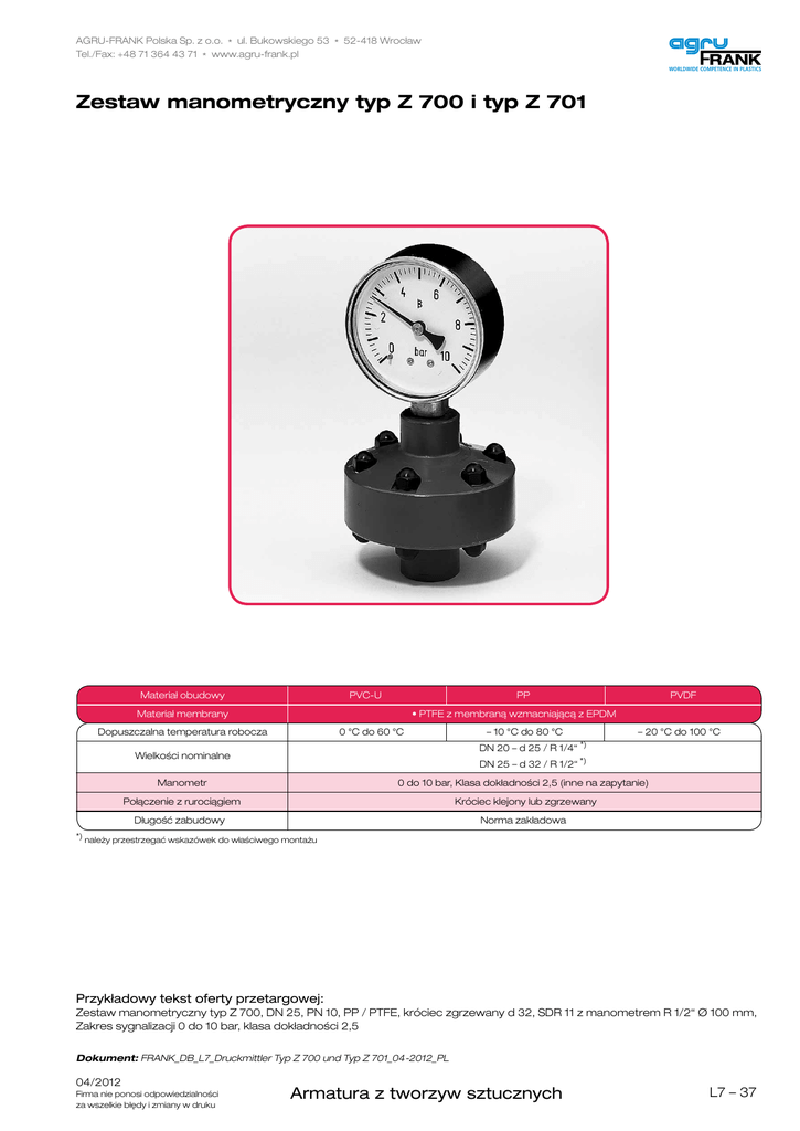 AGRU-FRANK Polska Sp. z o.o. * ul. Bukowskiego 53 * 52-418 Wrocław Tel./Fax: +48 71 364 43 71 * www.agru-frank.pl WORLDWIDE COMPETENCE IN PLASTICS Zestaw manometryczny typ Z 700 i typ Z 701 Materiał obudowy PVC-U Materiał membrany Dopuszczalna temperatura robocza PP • PTFE z membraną wzmacniającą z EPDM 0 °C do 60 °C Manometr – 10 °C do 80 °C – 20 °C do 100 °C DN 20 – d 25 / R 1/4“ *) Wielkości nominalne PVDF DN 25 – d 32 / R 1/2“ *) 0 do 10 bar, Klasa dokładności 2,5 (inne na zapytanie) Połączenie z rurociągiem Króciec klejony lub zgrzewany Długość zabudowy Norma zakładowa *) należy przestrzegać wskazówek do właściwego montażu Przykładowy tekst oferty przetargowej: Zestaw manometryczny typ Z 700, DN 25, PN 10, PP / PTFE, króciec zgrzewany d 32, SDR 11 z manometrem R 1/2“ Ø 100 mm, Zakres sygnalizacji 0 do 10 bar, klasa dokładności 2,5 Dokument: FRANK_DB_L7_Druckmittler Typ Z 700 und Typ Z 701_04-2012_PL 04/2012 Firma nie ponosi odpowiedzialności za wszelkie błędy i zmiany w druku Armatura z tworzyw sztucznych L7 – 37 WORLDWIDE COMPETENCE IN PLASTICS Zestaw manometryczny Z 700 i typ Z 701 Nr. Nazwa Dm Ilość Materiał 1 Dolna część 1 PVC-U, PP, PVDF 2 Górna część 1 PVC-U, PP, PVDF 3Membrana *) 1 PTFE **) 4 Uszczelka manometru 1 FKM 5 Manometr 1 PC / Mosiądz 6 Sześciokątna nasadka ochronna 6 PA 7Śruba sześciokątna, podkładka, nakrętka6 A2 - 1.4301 (SUS 304) H *) części zużywalne lub zalecane części zamienne **) z membraną wzmacniającą z EPDM Wymiary i masy A Wymiary w mm da h D Masa w kg / szt. DmH dg *)PVC-U A PP PVDF 25 15 72 71 63 129 R 1/4“ 300270320 32 22 100 90 100 210 R 1/2“ 550 480 780 h *) należy przestrzegać wskazówek do właściwego montażu, na życzenie zestaw manometryczne w dostawie także z mufą klejoną lub króćcem zgrzewanym. Ø da dg ØD Opis Wskazówki do właściwego montażu Zestawy manometryczne są stosowane do mierzenia ciśnienia mediów neutralnych i agresywnych. Manometr jest oddzielony hermetycznie od medium przez zintegrowaną w zestawie manometrycznym membranę z powłoką PTFE (manometr nie jest zagrożony korozją ). Przekazywanie ciśnienia pomiędzy membraną i komorą pomiarową manometru następuje za pomocą roztworu buforowego. Dzięki zasadzie działania membrany o dużej powierzchni z roztworem buforowym można osiągnąć zależnie od wybranego manometru wspaniałe dokładności pomiaru. Zestawy manometryczne Z 700 są przewidziane do łączenia z rurociągiem poprzez klejenie lub zgrzewanie elektrooporowe. Przy stosowaniu gwintu wewnętrznego do połączenia z rurociągiem należy pracować wyłącznie z gwintem walcowym bez taśmy PTFE, konopi lub innych środków uszczelniania gwintu lub przejść. Do uszczelnienia przyłącza rurowego należy stosować tylko odpowiednie płaskie pierścienie uszczelniające. W celu zabezpieczenia manometru i ułatwienia konserwacji zalecamy zamontowanie 2-drogowego zaworu kulowego typ 21 pomiędzy rurociągiem i zestawem manometrycznym. Zależnie od przypadku stosowania zawór kulowy jest otwierany tylko przy odpowiedniej kontroli ciśnienia w instalacji. Przy pomocy zaworu kulowego można bez problemu prowadzić konserwację zestawu manometrycznego także przy instalacji pod ciśnieniem. Cechy charakterystyczne wszystkie części stykające się z medium wykonane z tworzyw sztucznych manometr jest oddzielony hermetycznie od medium membraną praktycznie nie wymaga konserwacji nadaje się do stosowania wszystkich dostępnych w handlu manometrów i presostatów z R 1/4“ lub R 1/2“ Dostępne zakresy wskazań manometru: Uwaga: Zestaw manometryczny jako typ Z 701 dostępny bez manometru i płynu buforowego. L7 – 38 • 0 – 0,6 • 0 – 4 • 0 – 1 • 0 – 6 • 0 – 1,6 • 0 – 10 • 0 – 2,5 Inne manometry na zamówienie. Armatura z tworzyw sztucznych 04/2012 Firma nie ponosi odpowiedzialności za wszelkie błędy i zmiany w druku