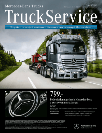 nr 3/2015 Oferta ważna do 31.12.2015 r. lub do wyczerpania zapasów 799,- Podświetlona gwiazda Mercedes-Benz z zestawem montażowym B6 683 0036 Nowy Actros Błyszczący detal: dzięki naciśnięciu przycisku możesz podświetlić widniejącą na masce gwiazdę Mercedes-Benz. Dane techniczne: Zakres dostawy: Oświetlenie LED o mocy 1,9 W z soczewkami rozpraszającymi. Zestaw instalacyjny składa się z gwiazdy z diodami LED, włącznika, okablowania i elementów montażowych. Propozycja skierowana do przedsiębiorców. Wszystkie podane ceny są cenami sugerowanymi netto w PLN. Części dostępne są w Autoryzowanych Serwisach Mercedes-Benz na terenie Polski, uczestniczących w akcji, do dnia 31.12.2015 roku lub do wyczerpania zapasów. Niniejsza propozycja nie stanowi oferty w rozumieniu prawa, a wszelkie zawarte w niej dane mają charakter wyłącznie informacyjny. Ostateczną ofertę przedstawia Doradca Serwisowy Autoryzowanego Serwisu Mercedes-Benz Trucks. Zdjęcia zamieszczone w gazetce są zdjęciami poglądowymi i mogą różnić się w zależności od numeru katalogowego danej grupy produktowej. Prosimy o konsultację z Doradcą Serwisowym w celu dobrania właściwej części do konkretnego pojazdu. Wszystkie teksty, zdjęcia, ilustracje oraz grafiki podlegają ochronie zgodnie z prawem autorskim i innym ustawom o ochronie własności intelektualnej. Wszystkie znaki oraz marki umieszczone w prezentacji są prawnie chronionymi znakami towarowymi Daimler AG. Bezpieczeństwo w podróży od 250,- 330,- Osłony lamp przednich Owiewka okien bocznych B6 601 0146250,Actros B6 753 0027 Nowy Actros, Antos, Arocs B6 601 0147250,Actros B6 601 0150599,Actros 33,Zestaw montażowy B6 601 0148 Actros B6 601 0149 Actros Najlepsza ochrona: osłony zabezpieczą lampy przednie i przeciwmgielne przed uszkodzeniami i koniecznością napraw. W razie konieczności czyszczenia można je łatwo odgiąć. Materiał: Szkło akrylowe. Zakres dostawy: B6 753 0028 Nowy Actros, Antos, Arocs Jazda bez przeciągów: owiewki okien bocznych zapobiegają wwiewaniu powietrza do kabiny w czasie jazdy z otwartym oknem. Doskonałe spasowanie zapobiega przedostawaniu się odgłosów wiatru w ruchu. Ze specjalnym otworem na lusterko do spoglądania w dół po stronie pasażera. Materiał: Szkło akrylowe o grubości 3 mm. Kolor: ostępne w wersji przyciemnianej D i standardowej. Zakres dostawy: Zestaw na stronę kierowcy i pasażera wraz z kompletem montażowym. Zestaw na stronę kierowcy i pasażera wraz z kompletem montażowym. 120,- 249,- Zamykany korek wlewu paliwa AdBlue® Zamykany korek wlewu paliwa A 000 470 44 05 Nowy Actros, Actros, Antos, Arocs Doskonała ochrona: dzięki zamykanemu korkowi. Łatwy w użyciu – jeden klucz. Zakres dostawy: Korek wlewu paliwa AdBlue® dostarczany jest z dwoma kluczykami oznaczonymi kolorami. Propozycja skierowana do przedsiębiorców. Wszystkie podane ceny są cenami sugerowanymi netto w PLN. Części dostępne są w Autoryzowanych Serwisach Mercedes-Benz na terenie Polski, uczestniczących w akcji, do dnia 31.12.2015 roku lub do wyczerpania zapasów. Niniejsza propozycja nie stanowi oferty w rozumieniu prawa, a wszelkie zawarte w niej dane mają charakter wyłącznie informacyjny. Ostateczną ofertę przedstawia Doradca Serwisowy Autoryzowanego Serwisu Mercedes-Benz Trucks. Zdjęcia zamieszczone w gazetce są zdjęciami poglądowymi i mogą różnić się w zależności od numeru katalogowego danej grupy produktowej. Prosimy o konsultację z Doradcą Serwisowym w celu dobrania właściwej części do konkretnego pojazdu. Wszystkie teksty, zdjęcia, ilustracje oraz grafiki podlegają ochronie zgodnie z prawem autorskim i innym ustawom o ochronie własności intelektualnej. Wszystkie znaki oraz marki umieszczone w prezentacji są prawnie chronionymi znakami towarowymi Daimler AG. A 000 760 36 05 Nowy Actros, Actros, Antos, Arocs A 000 760 43 05 Nowy Actros, Actros, Antos, Arocs Doskonała ochrona: dzięki zamykanemu korkowi. Komfort w trasie 39,- 220,- Poduszka pod plecy Poduszka pneumatyczna pod plecy B6 753 0120 Nowy Actros, Actros, Antos, Arocs Poduszka pod plecy to komfort i prawdziwe odprężenie odcinka lędźwiowego kręgosłupa. Mocowanie: oduszka wyposażona w dwa zatrzaski P do mocowania pomiędzy poduszką siedzenia i oparciem. B6 753 0140 Nowy Actros, Actros, Antos, Arocs Poduszka pod plecy to komfort i prawdziwe odprężenie odcinka lędźwiowego kręgosłupa. Niezależna pneumatyczna regulacja. Mocowanie: Poduszkę wyposażono w dwa zatrzaski do mocowania pomiędzy poduszką siedzenia i oparciem. od 133,- 39,- Poduszka pod kark Składane pudełko SoloStar B6 753 0125 Nowy Actros, Actros, Antos, Arocs 133,- B6 753 0142144,Nowy Actros, Actros, Antos, Arocs Poduszka pod kark zaprojektowana do wszystkich foteli ze zintegrowanymi i zdejmowalnymi zagłówkami, aby służyły relaksowi. Można ją także wykorzystywać jako dodatkowe podkładki do zagłówków. Materiał: Tkanina. B6 626 0110 Nowy Actros, Actros, Antos, Arocs Wszechstronne zastosowanie: Składane pudełko można wykorzystywać np. do przechowywania schłodzonych napojów albo podgrzanego jedzenia. Świetne wykorzystanie przestrzeni pod fotelem pasażera. Materiał: Styropian. Wymiary: (Szer. x dł. x wys.) 300 x 500 x 200 mm. Zalety produktu: Trwałe pudełko o małej wadze, które można myć. Uwaga: udełko o właściwościach termoizolacyjnych, P zaprojektowane tak, by mieściło się w przestrzeni pod fotelem pasażera w systemie kabiny SoloStar; można je również włożyć w inną przestrzeń bagażową w pojeździe. 199,- 130,- Torba sportowa z kosmetyczką pod prysznic Okulary przeciwsłoneczne B6 787 1226 Propozycja skierowana do przedsiębiorców. Wszystkie podane ceny są cenami sugerowanymi netto w PLN. Części dostępne są w Autoryzowanych Serwisach Mercedes-Benz na terenie Polski, uczestniczących w akcji, do dnia 31.12.2015 roku lub do wyczerpania zapasów. Niniejsza propozycja nie stanow