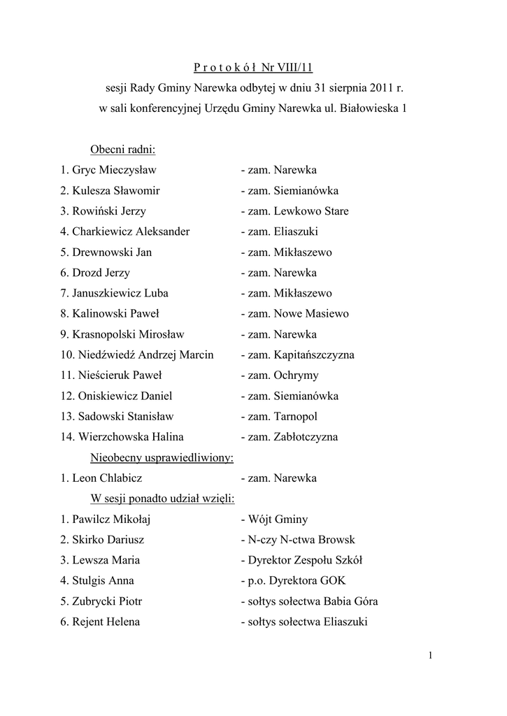 P r o t o k ó ł Nr VIII/11 sesji Rady Gminy Narewka odbytej w dniu 31 sierpnia 2011 r. w sali konferencyjnej Urzędu Gminy Narewka ul. Białowieska 1 Obecni radni: 1. Gryc Mieczysław - zam. Narewka 2. Kulesza Sławomir - zam. Siemianówka 3. Rowiński Jerzy - zam. Lewkowo Stare 4. Charkiewicz Aleksander - zam. Eliaszuki 5. Drewnowski Jan - zam. Mikłaszewo 6. Drozd Jerzy - zam. Narewka 7. Januszkiewicz Luba - zam. Mikłaszewo 8. Kalinowski Paweł - zam. Nowe Masiewo 9. Krasnopolski Mirosław - zam. Narewka 10. Niedźwiedź Andrzej Marcin - zam. Kapitańszczyzna 11. Nieścieruk Paweł - zam. Ochrymy 12. Oniskiewicz Daniel - zam. Siemianówka 13. Sadowski Stanisław - zam. Tarnopol 14. Wierzchowska Halina - zam. Zabłotczyzna Nieobecny usprawiedliwiony: 1. Leon Chlabicz - zam. Narewka W sesji ponadto udział wzięli: 1. Pawilcz Mikołaj - Wójt Gminy 2. Skirko Dariusz - N-czy N-ctwa Browsk 3. Lewsza Maria - Dyrektor Zespołu Szkół 4. Stulgis Anna - p.o. Dyrektora GOK 5. Zubrycki Piotr - sołtys sołectwa Babia Góra 6. Rejent Helena - sołtys sołectwa Eliaszuki 1 7. Kiczkaluk Włodzimierz - sołtys sołectwa Grodzisk 8. Saczko Olimpia - sołtys sołectwa Guszczewina 9. Dobrzyński Mirosław - sołtys sołectwa Janowo 10. Wojciechowski Jan - sołtys sołectwa Leśna 11. Ciełuszecki Jan - sołtys sołectwa Lewkowo Nowe 12. Bondaruk Eugeniusz - sołtys sołectwa Lewkowo Stare 13. Filinowicz Alina - sołtys sołectwa Stare Masiewo 14. Marczuk Jan - sołtys sołectwa Nowe Masiewo 15. Łuksza Helena - sołtys sołectwa Michnówka 16. Trusiewicz Mirosława - sołtys sołectwa Mikłaszewo 17. Korolczuk Maria - sołtys sołectwa Nowa Łuka 18. Opolska Elżbieta - sołtys sołectwa Narewka 19. Karpiuk Waldemar - sołtys sołectwa Ochrymy 20. Łuksza Zenaida - sołtys sołectwa Olchówka 21. Wróblewski Aleksy - sołtys sołectwa Planta 22. Suchodoła Witalis - sołtys sołectwa Podlewkowie 23. Kajdewicz Krzysztof - sołtys sołectwa Skupowo 24. Witkowski Leszek - sołtys sołectwa Tarnopol 25. Wierzchowska Halina - sołtys sołectwa Zabłotczyzna 26. Maksymiuk Zdzisława - Honorowy Obywatel Gminy Narewka 27. Rybak Piotr - przedstawiciel PSP w Hajnówce Obrady VIII sesji Rady Gminy otworzył o godz. 10,00 Przewodniczący Rady Gminy Pan Mieczysław Gryc, który im przewodniczył do chwili przekazania przewodnictwa obrad dla Wiceprzewodniczącego Rady Gminy Pana Jerzego Rowińskiego. Po powitaniu zebranych i stwierdzeniu prawomocności obrad /w sesji w chwili otwarcia uczestniczyło 14 radnych, co stanowi quorum do podejmowania prawomocnych uchwał/ przewodniczący Rady Gminy przedstawił porządek 2 obrad VIII sesji. Do przedstawionego porządku dziennego radni żadnych uwag ani propozycji jego zmiany nie zgłosili. Porządek obrad VIII sesji Rady Gminy przedstawia się następująco: 1. Wręczenie Aktu nadania tytułu Honorowego Obywatela Gminy Narewka. 2. Wręczenie nagród laureatom konkursu na „najestetyczniej urządzoną posesję i zagrodę”. 3. Przyjęcie protokołu z VII sesji Rady Gminy. 4. Wnioski i interpelacje radnych. 5. Informacja o realizacji budżetu gminy w I półroczu 2011 r. 6. Stan ochrony p. pożarowej na terenie gminy i potrzeby OSP. 7. Zaopiniowanie wniosku Nadleśnictwa Browsk o uznanie za las ochronny. 8. Oświata na terenie gminy – funkcjonowanie, potrzeby i założenia. 9. Uchwalenie statutu gminy. 10. Zmiany w budżecie gminy na 2011 r. 11. Zmiana Wieloletniej Prognozy Finansowej Gminy Narewka na lata 2011 – 2025. 12. Powzięcie uchwał w sprawach: - przeznaczenia do sprzedaży nieruchomości, - przystąpienia do opracowania zmiany studium uwarunkowań i kierunków zagospodarowania przestrzennego Gminy Narewka, - przystąpienia do sporządzenia miejscowego planu zagospodarowania przestrzennego. 13. Sprawozdanie z działalności Wójta Gminy w okresie między VII a VIII sesją Rady Gminy. 14. Odpowiedzi na wnioski i interpelacje radnych. 15. Wolne wnioski. 3 Do punktu 1 - wręczenie Aktu nadania tytułu Honorowego Obywatela Gminy Narewka. Zabierając głos w tym punkcie porządku obrad Pan Mikołaj Pawilcz – Wójt Gminy poinformował, iż wystąpił z wnioskiem do Kapituły o nadanie Pani Zdzisławie Stanisławie Maksymiuk tytułu Honorowego Obywatela Gminy Narewka i odczytał treść wniosku wraz z uzasadnieniem. Kapituła pozytywnie wniosek zaopiniowała i wystąpiła do Rady Gminy o nadanie tytułu. Rada Gminy nadała Pani Zdzisławie Stanisławie Maksymiuk tytuł Honorowego Obywatela Gminy Narewka. Pan Wójt z Panem Przewodniczącym Rady Gminy wręczyli Pani Zdzisławie Maksymiuk Akt Nadania Tytułu oraz medal i pogratulowali tytułu. Pani Zdzisława Stanisława Maksymiuk podziękowała za przyznanie tytułu i stwierdziła, iż jest „ogromnie zadowolona i zaszczycona”. Poinformowała, iż jej kontakt z Narewką jest od 15 lat i spotyka się tu z dużą sympatią. Stwierdziła, iż duże zasługi, w tym, że BS Brańsk przejął BS w Narewce miał samorząd bankowy i Pan Wójt. Mówiła, iż obecny oddział BS jest nieporównywalną placówką w stosunku do poprzedniego banku. Podziękowała Pani Dyrektor Oddziału BS za organizację i pracę banku. Stwierdziła, iż z Gminy Narewka można brać przykład. Podziękowała Kapitule, Panu Wójtowi i radnym za nadanie tytułu. Wyraziła nadzieję, że dalsza współpraca z Gminą Narewka nie będzie gorsza niż do tej pory. Pan Mikołaj Pawilcz – Wójt Gminy stwierdził, iż przyznanie Pani Zdzisławie Stanisławie Maksymiuk tytuł Honorowego Obywatela Gminy Narewka to skromny sposób podziękowania za to co Pani Maksymiuk zrobiła dla społeczności Gminy Narewka. Do punktu 2 - wręczenie nagród laureatom konkursu na „najestetyczniej urządzoną posesję i zagrodę”. Przewodniczący obrad udzielił głosu Przewodniczącemu Komisji 4 konkursowej Panu Andrzejowi Marcinowi Niedźwiedź w celu poinformowania o wynikach konkursu na „najestetyczniej urządzoną posesję i zagrodę”. Zabierając gło