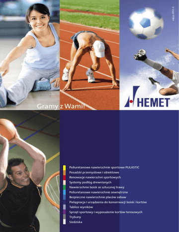 edycja 2011.1 Gramy z Wami! Poliuretanowe nawierzchnie sportowe PULASTIC Posadzki przemysłowe i obiektowe Renowacje nawierzchni sportowych Systemy podłóg drewnianych Nawierzchnie boisk ze sztucznej trawy Poliuretanowe nawierzchnie zewnętrzne Bezpieczne nawierzchnie placów zabaw Pielęgnacja i urządzenia do konserwacji boisk i kortów Tablice wyników Sprzęt sportowy i wyposażenie kortów tenisowych Trybuny Siedziska Doświadczenie i kompetencja Szanowni Państwo Hemet Sp. z o.o. istnieje od 1988 r. W zakres wchodzi działalności projektowanie, naszej firmy wyposażanie obiektów sportowych w sprzęt i posadzki sportowe, budowa boisk zewnętrznych ze sztucznej trawy lub poliuretanu, bieżnie lekkoatletyczne, wykonywanie placów zabaw oraz nawierzchni obiektowych. Podczas naszej działalności zrealizowaliśmy ponad 1300 zadań w kraju OFERUJEMY: • Poliuretanowe nawierzchnie sportowe PULASTIC i zagranicą. Bazujemy tylko na produktach • Systemy podłóg drewnianych ROBBINS najwyższej jakości, posiadających certyfi- • Renowacje nawierzchni sportowych katy i atesty. • Nawierzchnie boisk ze sztucznej trawy Stawiamy na solidność, wiarygodność • Poliuretanowe nawierzchnie zewnętrzne oraz profesjonalizm czego dowodem • Bezpieczne nawierzchnie placów zabaw są zdobyte przez naszą firmę nagrody • Pielęgnacja i urządzenia do konserwacji i wyróżnienia. boisk i kortów • Sprzęt sportowy • Wyposażenie kortów tenisowych • Tablice wyników • Trybuny • Siedziska • Posadzki przemysłowe i obiektowe Zapraszamy do współpracy. 2 Prezes firmy Hemet Sp. z o.o. Jerzy Miciuła Poliuretanowe nawierzchnie sportowe PULASTIC Pulastic – nowe linie nawierzchni sportowych Technologia systemów sportowych Ferrum • Bronze • Silver • Gold • Platinum Pulastic została opracowana 45 lat temu, a przez ten czas zainstalowano na świecie Podział nawierzchni Pulastic na cztery ponad 25.000.000 m2 tych nawierzchni. główne linie Ferrum, Bronz, Silver, Gold, Początkowo były to nawierzchnie punk- Platinium z unikalną charakterystyką towo-elastyczne takie jak Pulastic 2000 i jakością pomaga zorientować się w sze- i Pulastic SP oraz mix-elastyczne jak Pu- rokiej gamie oferowanych nawierzchni. lastic DG. W latach dziewięćdziesiątych Podstawową zasadą podziału jest poziom Hemet Sp. z o.o. zaproponował nowe komfortu oczekiwany przez sportowców, rozwiązania: powierzchniowo-elastyczne następnie odporność na obciążenia i od- Pulastic RDT i Pulastic 2000 na konstrukcji bicie piłki. rusztu drewnianego z warstwą elastyczną z granulatu gumowego tzw. „Pulastic RD”. Specjalne wymagania i rozwiązania. Descol – producent nawierzchni Pula- Poza linią „metali szlachetnych” oferujemy stic na bieżąco śledzi tendencje na rynku, również linie: Performance – nawierzch- uważnie słuchając uwag użytkowników nie specjalistyczne, Facelift – renowacja, i właścicieli obiektów. Nowoczesne obiek- Solid – nawierzchnie obiektowe, Custom ty sportowe powinny być wielofunkcyjne – wg życzenia. i tanie w eksploatacji, odpowiednie dla wielu dyscyplin sportowych. Co więcej, Zalety nawierzchni Pulastic: muszą one spełniać warunki do organizo- • bezspoinowa, gładka powierzchnia bez wania wystaw, koncertów czy targów. Hemet Sp. z o.o. oferuje systemy Pu- porów; • spełnienie wymagań EN14904 – znak CE; lastic posiadające znak CE zgodności nor- • trwałość; mami PN/EN14904 dzięki czemu każdy • optymalny komfort sportowy i zapobie- sportowiec zarówno amator jak i zawodowiec, dziecko czy emeryt może znaleźć komfortową nawierzchnię z odpowiedni- ganie kontuzjom; • odpowiednia proporcja pomiędzy tarciem, a poślizgiem; mi dla siebie parametrami sportowymi. • świetne odbicie piłki; Systemy Pulastic posiadają certyfikaty • brak odblasków i czytelność linii; m.in. IHF i FIBA. Dla każdego typu aktyw- • wielofunkcyjność; ności sportowej, czy to zajęć wychowania • odporność na obciążenia statyczne fizycznego w szkole, wyczynowego sportu i dynamiczne; halowego, tenisa na otwartym powietrzu, • odporny na zużycie lakier; fitness czy fizjoterapii – Pulastic oferuje • trwałość kolorów; najlepszą kombinację ochrony zdrowia • tłumienie hałasu; i możliwości sportowych. • szeroka gama kolorów; Podstawowe cechy • łatwa obsługa, utrzymanie w czystości Nawierzchnie Pulastic oferują wysokie tłumienie energii udarowej, wytrzymałość mechaniczną, dobre odbicie piłki, ale i naprawy. 401 417 400 407 307 308 306 305 205 800 106 100 309 504 506 507 LIME GREEN MAY GREEN GREEN OXIDE również niską cenę zakupu i małe koszty eksploatacji. Nawierzchnie Pulastic oferują dodatkowo specyficzne własności: PASTEL BLUE PIGEON BLUE STEEL BLUE TURQUOISE MINT SKY BLUE elastyczność, trwałość, bezspoinowość i jednorodność. SAND BEIGE CAPRI BLUE YELLOW OCHRE STONE GREY AUTUMN BROWN DUSTY GREY RED OXIDE IRON GREY 3 Ferrum Linia Pulastic Ferrum zawiera nawierzchnie płaszczyznowo - elastyczne zaprojektowane przez Hemet Sp. z o.o. w połowie lat dziewięćdziesiątych. Są to systemy oparte na tradycyjnym ruszcie drewnianym na podwójnym legarowaniu. Pulastic RDT Jest systemem legarowanej podłogi sportowej płaszczyznowo elastycznej. Nawierzchnia ta składa się z rusztu drewnianego wykonanego w technologii pojedynczych legarów na specjalnych podkładach elastycznych i tzw. ślepej podłogi zamkniętej płytą rozdzielającą ciężar, na którą wykonuje się wylewkę poliuretanową. Parametry sportowe i techniczne spełniają wszystkie wymagania normy PN/EN 14904 i są zbliżone do właściwości podłóg drewnianych, Trwały, funkcjonalny system o jednakowym odbiciu piłki na całej powierzchni predysponuje do koszykówki. Posiada ona jednak wszelkie zalety eksploatacyjne i estetyczne podłogi poliuretanowej bezspoinowej (łatwe utrzymanie czystości, łatwe naprawy, możliwość wielokrot