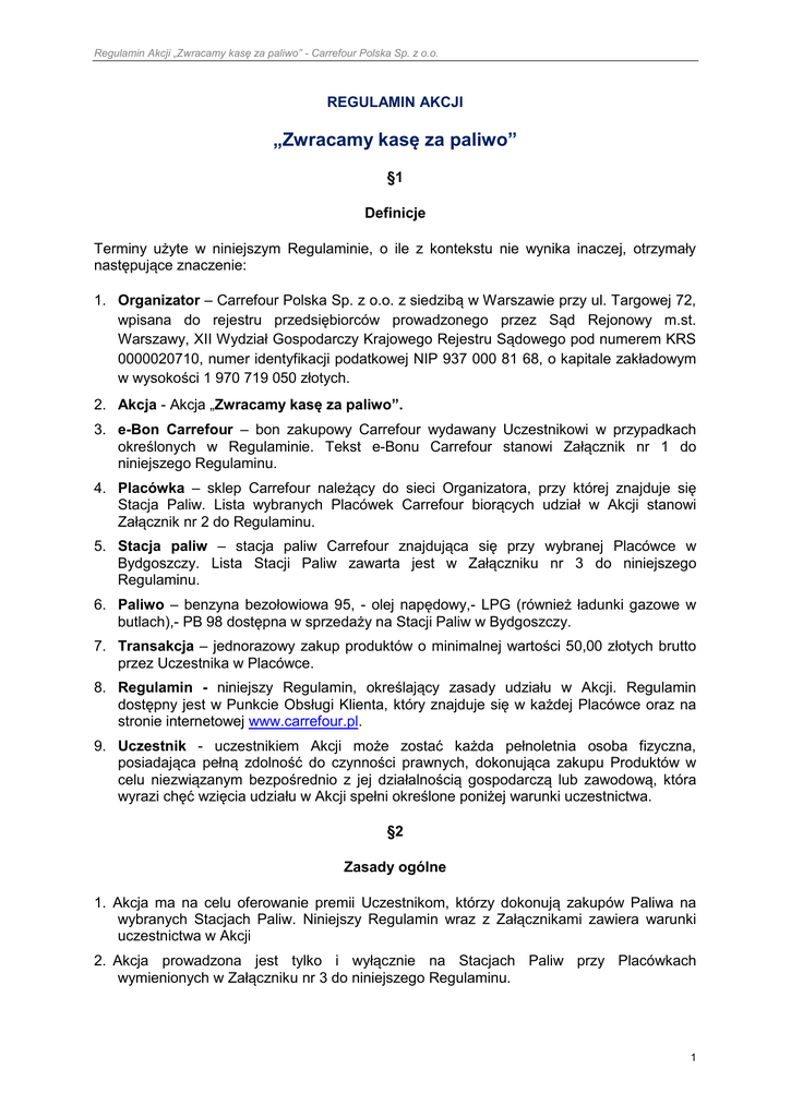 Regulamin Akcji „Zwracamy kasę za paliwo” - Carrefour Polska Sp. z o.o. REGULAMIN AKCJI „Zwracamy kasę za paliwo” §1 Definicje Terminy użyte w niniejszym Regulaminie, o ile z kontekstu nie wynika inaczej, otrzymały następujące znaczenie: 1. Organizator – Carrefour Polska Sp. z o.o. z siedzibą w Warszawie przy ul. Targowej 72, wpisana do rejestru przedsiębiorców prowadzonego przez Sąd Rejonowy m.st. Warszawy, XII Wydział Gospodarczy Krajowego Rejestru Sądowego pod numerem KRS 0000020710, numer identyfikacji podatkowej NIP 937 000 81 68, o kapitale zakładowym w wysokości 1 970 719 050 złotych. 2. Akcja - Akcja „Zwracamy kasę za paliwo”. 3. e-Bon Carrefour – bon zakupowy Carrefour wydawany Uczestnikowi w przypadkach określonych w Regulaminie. Tekst e-Bonu Carrefour stanowi Załącznik nr 1 do niniejszego Regulaminu. 4. Placówka – sklep Carrefour należący do sieci Organizatora, przy której znajduje się Stacja Paliw. Lista wybranych Placówek Carrefour biorących udział w Akcji stanowi Załącznik nr 2 do Regulaminu. 5. Stacja paliw – stacja paliw Carrefour znajdująca się przy wybranej Placówce w Bydgoszczy. Lista Stacji Paliw zawarta jest w Załączniku nr 3 do niniejszego Regulaminu. 6. Paliwo – benzyna bezołowiowa 95, - olej napędowy,- LPG (również ładunki gazowe w butlach),- PB 98 dostępna w sprzedaży na Stacji Paliw w Bydgoszczy. 7. Transakcja – jednorazowy zakup produktów o minimalnej wartości 50,00 złotych brutto przez Uczestnika w Placówce. 8. Regulamin - niniejszy Regulamin, określający zasady udziału w Akcji. Regulamin dostępny jest w Punkcie Obsługi Klienta, który znajduje się w każdej Placówce oraz na stronie internetowej www.carrefour.pl. 9. Uczestnik - uczestnikiem Akcji może zostać każda pełnoletnia osoba fizyczna, posiadająca pełną zdolność do czynności prawnych, dokonująca zakupu Produktów w celu niezwiązanym bezpośrednio z jej działalnością gospodarczą lub zawodową, która wyrazi chęć wzięcia udziału w Akcji spełni określone poniżej warunki uczestnictwa. §2 Zasady ogólne 1. Akcja ma na celu oferowanie premii Uczestnikom, którzy dokonują zakupów Paliwa na wybranych Stacjach Paliw. Niniejszy Regulamin wraz z Załącznikami zawiera warunki uczestnictwa w Akcji 2. Akcja prowadzona jest tylko i wyłącznie na Stacjach Paliw przy Placówkach wymienionych w Załączniku nr 3 do niniejszego Regulaminu. 1 Regulamin Akcji „Zwracamy kasę za paliwo” - Carrefour Polska Sp. z o.o. 3. Akcja obowiązuje codziennie od 24.02.2016 roku do 30.04.2016 roku na Stacji Paliw przy Placówce zgodnie z Załącznikiem nr 2 i 3 do niniejszego Regulaminu. 4. Akcja łączy się z innymi akcjami i promocjami przeprowadzanymi w Placówkach. W żadnym przypadku wartość przyznanych łącznie Uczestnikowi bonów, w tym e-Bonów oraz bonów Carrefour, które mogą zostać przyznane Uczestnikowi na podstawie innych Akcji w których bierze udział, obowiązujących w tym samym czasie w Placówkach, nie może przekroczyć łącznie kwoty 760 złotych do jednego paragonu. §3 Warunki otrzymania e-Bonu płatniczego Carrefour 1. Każdemu Uczestnikowi przysługuje jednorazowo prawo do otrzymania e-Bonu za zakup Paliwa na zasadach określonych w niniejszym Regulaminie. 2. Warunkiem otrzymania e-Bonu jest nabycie przez Uczestnika Paliwa na wybranej Stacji Paliw o wartości równej lub przewyższającej 100,00 złotych brutto, w okresie obowiązywania Akcji. 3. Wartość otrzymanego e-Bonu wynosić będzie do 5% wartości transakcji zakupu Paliwa. 4. Wartość otrzymanego e-Bonu uzależniona jest od ostatecznej kwoty figurującej na paragonie fiskalnym potwierdzającym dokonane przez Uczestnika zakupu Paliwa, po uwzględnieniu wszystkich wykorzystanych przez Uczestnika rabatów. 5. Maksymalna wartość otrzymanego do jednej transakcji e- Bonu wynosi 25,00 złotych brutto tj. przy zakupie Paliwa o wartości równej bądź przekraczającej 500,01 zł brutto będą wydawane e-Bony Carrefour wartości 25,00 zł brutto. 6. e-Bony będą wydawane w Punkcie Kasowym Stacji Paliw przez kasjera tylko i wyłącznie po dokonaniu zapłaty za Paliwo przez Uczestnika. 7. e-Bon nie będzie wydawany w innym dniu niż dzień nabycia Paliwa oraz tylko i wyłącznie bezpośrednio po dokonaniu przez Uczestnika zapłaty za Paliwo na Stacji Paliw. 8. Po wydaniu e-Bonu kasjer dokona na paragonie fiskalnym adnotacji o treści ”Bon wydany”. Wydanie kolejnego e-Bonu na podstawie paragonu, na którym znajduje się taka adnotacja nie będzie możliwe 9. Uczestnik może wziąć dział w Akcji tylko jeden raz dziennie. Organizator zastrzega sobie prawo do odmowy wydania e-Bonu w przypadku, gdy Uczestnik wielokrotnie dokonuje nabycia Paliwa w tym samym dniu podczas trwania Akcji. §4 e-Bon i jego realizacja 1. e-Bon jest bonem na okaziciela, uprawniającymi okaziciela e-Bonu do częściowej lub całkowitej zapłaty za zakupione produkty oferowane do sprzedaży w Placówkach. 2. e-Bon Carrefour podlega realizacji wyłącznie w terminie na nim podanym. 3. e-Bon Carrefour podlega realizacji tylko i wyłącznie w Placówce na nim podanej. 4. Możliwość realizacji e-Bonu w terminie jego ważności uwarunkowana jest dokonaniem przez Uczestnika jednorazowej Transakcji w danej Placówce za minimalną wartość 50,00 złotych brutto, po uwzględnieniu wszystkich wykorzystanych przez Uczestnika rabatów. 2 Regulamin Akcji „Zwracamy kasę za paliwo” - Carrefour Polska Sp. z o.o. 5. W przypadku, gdy wartość jednorazowej transakcji w Placówce będzie niższa niż wartość 50,00 złotych brutto e-Bon nie będzie realizowany. 6. e-Bony nie mogą być przedmiotem obrotu gospodarczego. 7. W przypadku utraty, zniszczenia lub uszkodzenia e-Bonu po jego wydaniu, duplikaty nie będą wydawane, a okazicielowi e-Bonu nie przysługują jakiekolwiek roszczenia z tego tytułu. 8. e-Bon nie podlega wymianie ani zwrotowi. §5 Reklamacje 1. Każdemu Uczestniko