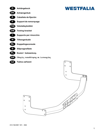 D Anhängebock DK Anhængerbuk E Caballete de fijación F Support de remorquage FIN Vetolaiteyksikkö GB Towing bracket I Supporto per rimorchio N Tilhengerbukk NL S Koppelingsconsole Släpvagnsfäste PL Kozioł holowniczy. GR ‹å®ã¥ªÿ ½ŒõŒæ¢½®÷®ÿ ¦ € ¯ 𪯽Œ¾¼ã¥¦ÿ CZ Tažna zařizeni 313 152 691 101 - 002 1 D Anbauanweisung Anhängebock Westfalia-Bestell-Nr.: Typ: EG-Genehmigungszeichen nach Richtlinie 94/20/EG: 313 152 313 140 Ausf. B e13 00-0428 Verwendungsbereich: Mercedes-Benz: 208 (D) - 216 (D); 308 (D) - 316 (D); (Sprinter ab 1995) und VW LT 28...35; Kastenwagen und Bus mit Radstand 3000 mm bis 3,5t zulässiges Gesamtgewicht Amtliche Typenbezeichnung nach EG-Typgenehmigung: Mercedes Benz: Typ A, B, E, F 901. - 903. und VW: 2DXOAE und 2DM Technische Daten : Der geprüfte D-Wert beträgt 17,82 kN. Dieser entspricht zum Beispiel einer Anhängelast von 3000 kg und einem zulässigen Gesamtgewicht von 4600 kg. Maßgebend sind jedoch die Angaben des Fahrzeugbriefes / Fahrzeugscheines. Der geprüfte D - Wert darf nicht überschritten werden. Die zulässige Stützlast darf 120 kg nicht überschreiten. An den Anhängerbock darf eine Kupplungskugel mit Halterung oder eine Bolzenkupplung montiert werden. Bei Montage der Bolzenkupplung sind die Freiraummaße nach Anlage1 der Unfallverhütungsvorschrift "Fahrzeuge" ( VGB 12 ) einzuhalten. Der Anhängebock darf nur zum Ziehen von Anhängern mit entsprechender Zugkugelkupplung verwendet werden. Muß durch den Anbau des Anhängebockes die Abschleppöse entfernt werden, dient der Anhängebock als Ersatz hierfür, sofern die zulässige Anhängelast nicht überschritten wird und der Abschleppvorgang auf verkehrsüblichen Straßen erfolgt. Hinweis 1 : Der Anhängebock ist ein Sicherheitsteil und darf nur von Fachpersonal montiert werden. Sofern Ersatzteile erforderlich werden, dürfen auch diese nur von Fachpersonal am unbeschädigten Originalteil verbaut werden. Jegliche Änderung bzw. Umbauten an dem Anhängebock sind unzulässig. Sie führen überdies zum Erlöschen der Betriebserlaubnis. Hinweis 2 : Isoliermasse bzw. Unterbodenschutz am Kfz. - falls vorhanden - im Bereich der Anlagefläche des Anhängebockes entfernen. Blanke Karosseriestellen mit Rostschutzfarbe streichen. Hinweis 3 : Bei Fahrt mit Anhänger sind die Fahrthinweise in der Betriebsanleitung des Fahrzeugherstelleres zu beachten. Hinweis 4 : An diesem Anhängerbock sind folgende Teile wahlweise anbaubar. 1.) Kugelplatte Typ: 329 050 / 329 100 / 329 101 (Normallage des Kugelmittelpunktes) / 329 059 2.) Kugelplatte Typ: 329 061 / 329 062 (ca. 40mm tiefer wie 329 050) 3.) Kugelplatte Typ: 329 042 (Allrad) 4.) Bolzenkupplung Typ: 243 U 115 EL Kugelplatte und selbsttätige Bolzenkupplung dürfen auch in Verbindung mit einem Kupplungsschnellwechselsystem montiert werden. 2 Lieferumfang des Anhängebockes: Pos. 1 2 3 4 5 6 7 8 9 10 11 12 13 14 Bezeichnung Anhängebock Stütze Gegenlage Lasche Distanzrohr Sechskantschraube M12x1,5x100, Festigkeitsklasse 10.9 Sechskantschraube M10x90, Festigkeitsklasse 10.9 Sechskantschraube M10x35, Festigkeitsklasse 10.9 Sechskantschraube M10x30, Festigkeitsklasse 10.9 Bundmutter M10, Festigkeitsklasse 10 Sechskantmutter M10, Festigkeitsklasse 10 Sechskantmutter M12x1,5, Festigkeitsklasse 10 Scheibe 13x24x2,5 Anbauanweisung Anzahl 1 2 2 2 4 8 4 4 4 2 8 8 16 1 Lieferbare Ersatzteilumfänge des Anhängebockes Ersatzteil-Nr. Bezeichnung 913 152 650 001 VPE - Befestigungsteile (Pos. 3-14) Anbauanweisung: 1.) Abschleppöse abschrauben. Abschleppöse entfällt. Ersatzrad aus Halterung entnehmen . Auspuffanlage soweit erforderlich aushängen/demontieren. 2.) Anhängebock 1 unter das Kfz. halten und bei "a" mit den fahrzeugseitig vorhandenen Bohrungen zur Deckung bringen.Sechskantschrauben M12 mit Scheibe 13 bei "a" einsetzen, Gegenlagen 3 beilegen und mit Scheiben 13 und Sicherungsmuttern M12 lose verschrauben. 3.) Stützen 2 (linke und rechte beachten) bei "b" an dem Anhängebock 1 anhalten, Sechskantschrauben M10x30 einsetzen und mit Sicherungsmuttern M10 lose verschrauben. 4.) Stützen 2 ausrichten und an die Fahrzeuglängsträger (innen) anlegen. Dabei Maß 75mm beachten (siehe Schnitt A-A). Fahrzeuglängsträger (innen) bei "c" anzeichnen. Stützen 2 bei "b" demontieren. 5.) Fahrzeuglängsträger (innen) bei "c" ankörnen. Fahrzeuglängsträger-inneren und aüßeren Steg- ø10,5mm bohren. (Hierbei auf Winkligkeit achten) Äußeren Steg der Fahrzeuglängsträger auf ø18,5mm aufbohren. Bohrungen entgraten (siehe Schnitt A-A). 6.) Stützen 2 bei "b" montieren. Sechskantschrauben M10x90 bei "c" einsetzen, Distanzen 5 bei "c" (von außen) einsetzen, Laschen 4 bei "c" beilegen und mit Sicherungsmuttern M10 verschrauben. 7.) Anhängebock ausrichten und Sechskantschrauben / Sechskantmuttern festziehen. 8.) Kugelplatte bei "f" mit Sechskantschrauben M10x35 und Bundmuttern M10 und bei "e" mit Sechskantschrauben M10x35 an den Anhängebock 1 anschrauben. 9.) Es werden Schrauben M12 / Muttern M12 der Festigkeitsklasse10 verwendet Es werden Schrauben M10 / Muttern M10 der Festigkeitsklasse 10 verwendet. Anzugsdrehmomente: Schrauben M12 - Festigkeitsklasse 10.9 ➔ 95 Nm +5% Schrauben M10 - Festigkeitsklasse 10.9 ➔ 55 Nm +5% 3 Die vom Fahrzeughersteller serienmäßig genehmigten Befestigungspunkte sind eingehalten. Nationale Richtlinien über die Anbauabnahmen sind zu beachten. Diese Montage- und Betriebsanleitung ist den Kfz. - Papieren beizufügen. Dieser Anhängebock einschließlich aller Montageteile wiegt ca. 18,5kg. Bitte berücksichtigen Sie, daß sich das Leergewicht Ihres Kfz. nach Montage des Anhägebockes um diesen Betrag erhöht. Hinweis: Bei Anbau dieser Anhängevorrichtung an ein in der Schweiz zugelassenes Fahrzeug: Der beiliegende Anhängelast-Aufkleber ist an der Anhängevorrichtung an gut sichtbarer Stelle anzubringen. Diese Angabe der Anhängelast bezieht sich auf die Anhängevorrichtung, die zulässige Anhängelast des Fahr