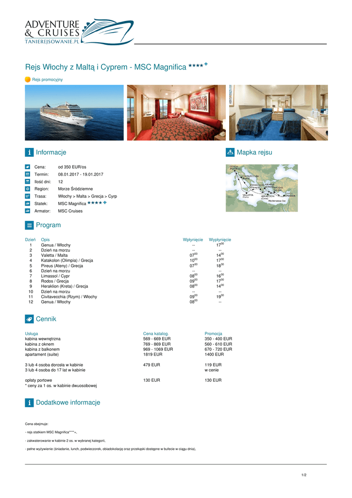 Rejs Włochy z Maltą i Cyprem - MSC Magnifica Rejs promocyjny Informacje Cena: od 350 EUR/os Termin: 08.01.2017 - 19.01.2017 Ilość dni: 12 Region: Morze Śródziemne Trasa: Włochy > Malta > Grecja > Cyrp Statek: MSC Magnifica Armator: MSC Cruises Mapka rejsu Program Dzień 1 2 3 4 5 6 7 8 9 10 11 12 Opis Genua / Włochy Dzień na morzu Valetta / Malta Katakolon (Olimpia) / Grecja Pireus (Ateny) / Grecja Dzień na morzu Limassol / Cypr Rodos / Grecja Heraklion (Kreta) / Grecja Dzień na morzu Civitavecchia (Rzym) / Włochy Genua / Włochy Wpłynięcie --0700 1000 0730 -0800 0900 0800 -0900 0800 Wypłynięcie 1700 -1400 1700 1830 -1600 1700 1400 -1900 -- Cennik Usługa kabina wewnętrzna kabina z oknem kabina z balkonem apartament (suite) Cena katalog. 569 - 669 EUR 769 - 869 EUR 969 - 1069 EUR 1819 EUR Promocja 350 - 400 EUR 560 - 610 EUR 670 - 720 EUR 1400 EUR 3 lub 4 osoba dorosła w kabinie 3 lub 4 osoba do 17 lat w kabinie 479 EUR 119 EUR w cenie opłaty portowe * ceny za 1 os. w kabinie dwuosobowej 130 EUR 130 EUR Dodatkowe informacje Cena obejmuje: - rejs statkiem MSC Magnifica****+, - zakwaterowanie w kabinie 2 os. w wybranej kategorii, - pełne wyżywienie (śniadanie, lunch, podwieczorek, obiadokolację oraz przekąski dostępne w bufecie w ciągu dnia), 1/2 - napoje kawa, herbata, woda dostępne w restauracji bufetowej, - korzystanie z basenu, siłowni oraz urządzeń sportowo – rekreacyjnych, - serwis kabinowy i bagażowy podczas wejścia i zejścia ze statku, - udział we wszystkich imprezach organizowanych na statku (widowiska w teatrze, animacje, koncerty). Cena nie obejmuje: - opłat portowych, - ubezpieczenia KL, NW i bagażu, - kosztów dojazdu do portu, - wycieczek fakultatywnych zamawianych na pokładzie statku, - korzystania z punktów usługowych (pralnia, fotograf, SPA itp.), - Turystycznego Funduszu Gwarancyjnego (2,50 EUR/rejs/os.), - obowiązkowych napiwków dla załogi - osoba dorosła: 9 EUR/dzień, dzieci 3-13 lat: 4,5 EUR/dzień. All Inclusive (opcjonalnie) Istnieje możliwość wykupienia formuły all inclusive na czas trwania rejsu. Pakiet obejmuje napoje alkoholowe i bezalkoholowe dostępne we wszystkich barach bez ograniczeń. Napoje objęte pakietem: piwo, wino, napoje gazowane, likiery, koktajle, wódka, koniak, whisky itp. Koszt pakietu: 26 EUR/dzień osoba dorosła i 12 EUR/dzień dziecko. Formuła all inclusive obowiązkowa jest na czas całego rejsu dla wszystkich osób podróżujących w jednej kabinie. 2/2 Powered by TCPDF (www.tcpdf.org)