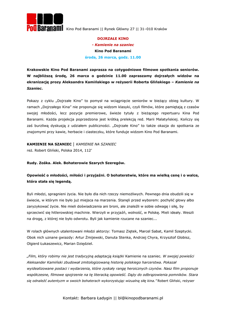 Kino Pod Baranami || Rynek Główny 27 || 31–010 Kraków DOJRZAŁE KINO - Kamienie na szaniec Kino Pod Baranami środa, 26 marca, godz. 11.00 Krakowskie Kino Pod Baranami zaprasza na cotygodniowe filmowe spotkania seniorów. W najbliższą środę, 26 marca o godzinie 11.00 zapraszamy dojrzałych widzów na ekranizację prozy Aleksandra Kamińskiego w reżyserii Roberta Glińskiego – Kamienie na Szaniec. Pokazy z cyklu „Dojrzałe Kino” to pomysł na wciągnięcie seniorów w bieżący obieg kultury. W ramach „Dojrzałego Kina” nie proponuje się widzom klasyki, czyli filmów, które pamiętają z czasów swojej młodości, lecz pozycje premierowe, świeże tytuły z bieżącego repertuaru Kina Pod Baranami. Każda projekcja poprzedzona jest krótką prelekcją red. Marii Malatyńskiej. Kończy się zaś burzliwą dyskusją z udziałem publiczności. „Dojrzałe Kino” to także okazja do spotkania ze znajomymi przy kawie, herbacie i ciasteczku, które funduje widzom Kino Pod Baranami. KAMIENIE NA SZANIEC │ KAMIENIE NA SZANIEC reż. Robert Gliński, Polska 2014, 112’ Rudy. Zośka. Alek. Bohaterowie Szarych Szeregów. Opowieść o młodości, miłości i przyjaźni. O bohaterstwie, które ma wielką cenę i o walce, która stała się legendą. Byli młodzi, spragnieni życia. Nie było dla nich rzeczy niemożliwych. Pewnego dnia obudzili się w świecie, w którym nie było już miejsca na marzenia. Stanęli przed wyborem: pochylić głowy albo zaryzykować życie. Nie mieli doświadczenia ani broni, ale znaleźli w sobie odwagę i siłę, by sprzeciwić się hitlerowskiej machinie. Wierzyli w przyjaźń, wolność, w Polskę. Mieli ideały. Weszli na drogę, z której nie było odwrotu. Byli jak kamienie rzucane na szaniec... W rolach głównych utalentowani młodzi aktorzy: Tomasz Ziętek, Marcel Sabat, Kamil Szeptycki. Obok nich uznane gwiazdy: Artur Żmijewski, Danuta Stenka, Andrzej Chyra, Krzysztof Globisz, Olgierd Łukaszewicz, Marian Dziędziel. „Film, który robimy nie jest tradycyjną adaptacją książki Kamienie na szaniec. W swojej powieści Aleksander Kamiński zbudował zmitologizowaną historię polskiego harcerstwa. Pokazał wyidealizowane postaci i wydarzenia, które zyskały rangę heroicznych czynów. Nasz film proponuje współczesne, filmowe spojrzenie na tę literacką opowieść. Dąży do odbrązowienia pomników. Stara się odnaleźć autentyzm w swoich bohaterach wykorzystując wizualną siłę kina.” Robert Gliński, reżyser Kontakt: Barbara Ładygin || [email protected] Kino Pod Baranami || Rynek Główny 27 || 31–010 Kraków Spotkania Dojrzałego Kina odbywają się co środę, w okolicach godziny 11.00. Uczestnicy cyklu prowadzą blog z recenzjami obejrzanych filmów: www.dojrzalekino.pl. BILETY dla seniorów: tylko 12 zł Dojrzałe kino, jak dojrzałe wino – to pełnia smaku! PARTNERZY: Kontakt: Barbara Ładygin || [email protected]