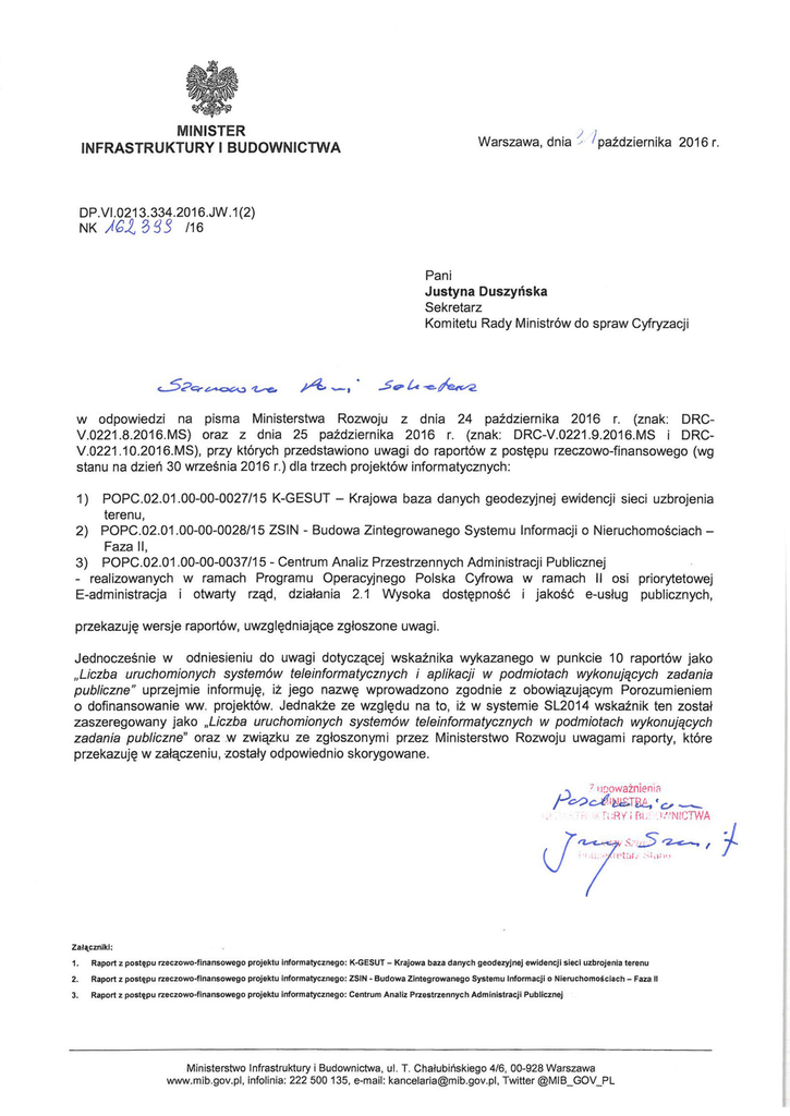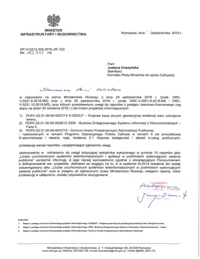 MINISTER INFRASTRUKTURY I BUDOWNICTWA Warszawa, dnia października 2016 r. DP.VI.0213.334.2016. JW. 1(2) n k ^ S S 5 /16 Pani Justyna Duszyńska Sekretarz Komitetu Rady Ministrów do spraw Cyfryzacji w odpowiedzi na pisma Ministerstwa Rozwoju z dnia 24 października 2016 r. (znak: DRCV.0221.8.2016.MS) oraz z dnia 25 października 2016 r. (znak: DRC-V.0221.9.2016.MS i DRCV.0221.10.2016.MS), przy których przedstawiono uwagi do raportów z postępu rzeczowo-finansowego (wg stanu na dzień 30 września 2016 r.) dla trzech projektów informatycznych: 1) POPC.02.01.00-00-0027/15 K-GESUT - Krajowa baza danych geodezyjnej ewidencji sieci uzbrojenia terenu, 2) POPC.02.01.00-00-0028/15 ZSIN - Budowa Zintegrowanego Systemu Informacji o Nieruchomościach Faza II, 3) POPC.02.01.00-00-0037/15 - Centrum Analiz Przestrzennych Administracji Publicznej - realizowanych w ramach Programu Operacyjnego Polska Cyfrowa w ramach II osi priorytetowej E-administracja i otwarty rząd, działania 2.1 Wysoka dostępność i jakość e-usług publicznych, przekazuję wersje raportów, uwzględniające zgłoszone uwagi. Jednocześnie w odniesieniu do uwagi dotyczącej wskaźnika wykazanego w punkcie 10 raportów jako „Liczba uruchomionych systemów teleinformatycznych i aplikacji w podmiotach wykonujących zadania publiczne" uprzejmie informuję, iż jego nazwę wprowadzono zgodnie z obowiązującym Porozumieniem o dofinansowanie ww. projektów. Jednakże ze względu na to, iż w systemie SL2014 wskaźnik ten został zaszeregowany jako „Liczba uruchomionych systemów teleinformatycznych w podmiotach wykonujących zadania publiczne" oraz w związku ze zgłoszonymi przez Ministerstwo Rozwoju uwagami raporty, które przekazuję w załączeniu, zostały odpowiednio skorygowane. 7 upoważnienia /-JcO^y&T&Ł, <cs - r u R / J B i , .»/'NICTWA i.łf.- •'-•<<!; Załączniki: 1. Raport z postępu rzeczowo-finansowego projektu informatycznego: K-GESUT - Krajowa baza danych geodezyjnej ewidencji sieci uzbrojenia terenu 2. Raport z postępu rzeczowo-finansowego projektu informatycznego: ZSIN - Budowa Zintegrowanego Systemu Informacji o Nieruchomościach - Faza ii 3. Raport z postępu rzeczowo-finansowego projektu informatycznego: Centrum Analiz Przestrzennych Administracji Publicznej Ministerstwo Infrastruktury i Budownictwa, ul. T. Chałubińskiego 4/6, 00-928 Warszawa www.mib.gov.pl, infolinia: 222 500 135, e-mail: [email protected], Twitter @MIB_GOV_PL