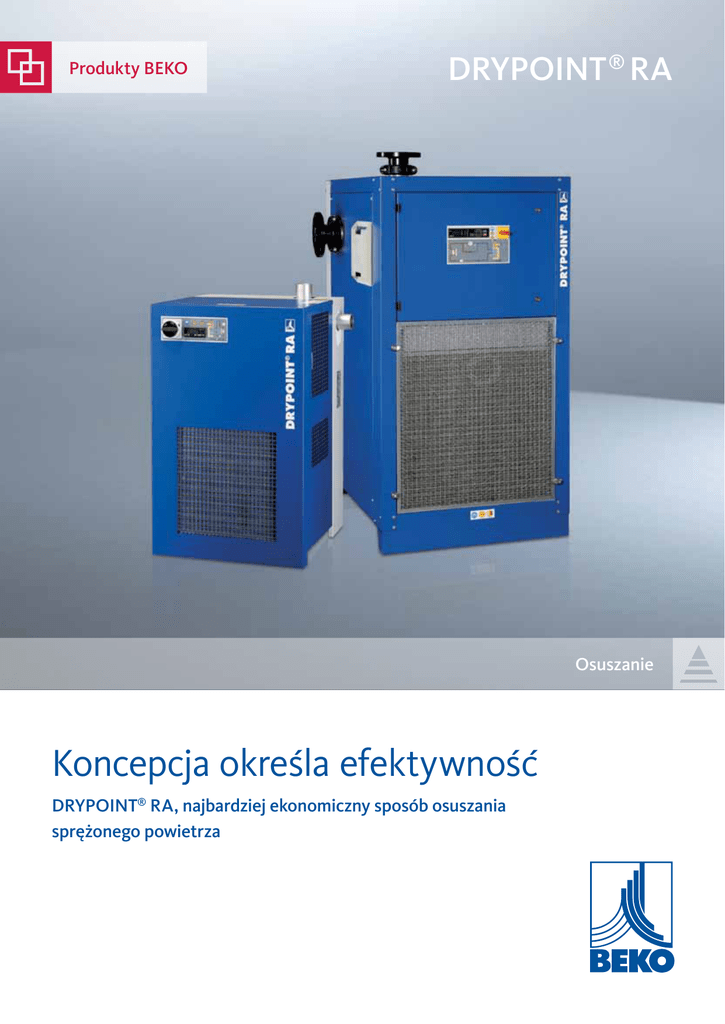 Produkty Beko DRYPOInt ® RA Osuszanie Koncepcja określa efektywność DRYPOINT® RA, najbardziej ekonomiczny sposób osuszania sprężonego powietrza Produkty BEKO | osuszanie | DRYPOINT® RA DRYPOINT® RA: Inwestycja, która się opłaca O efektywności kosztowej osuszaczy ziębniczych nie decydują koszty inwestycyjne, a koszty operacyjne. Biorąc pod uwagę pięcioletni okres eksploatacyjny zaledwie 20-30% kosztów całkowitych to czyste koszty inwestycyjne. Jednocześnie 70-80% to bieżące koszty operacyjne. Na koszty te składają się koszty energii elektrycznej, opory przepływu w systemie i straty sprężonego powietrza przez nieszczelności. Spadki ciśnienia w punktach krytycznych muszą być wyrównane zwiększonym poborem mocy sprężarki, co z kolei skutkuje większym zapotrzebowaniem na energię. Dzięki DRYPOINT® RA, powyższe koszty operacyjne można zmniejszyć prawie o połowę, biorąc pod uwagę okres pięciu lat. Obliczenie amatyzacji kosztów osuszaczy ziębnichych nowej generacji pokazuje, że inwestycja zwraca się w ciągu zaledwie sześciu miesięcy. Przekonująco ekonomiczne Całkowite koszty osuszacza DRYPOINT® RA w porównaniu do tradycyjnego osuszacza* Osuszacz tradycyjny Koszty inwestycyjne 0 10 20 Koszty eksploatacyjne 30 40 50 60 70 80 90 100 60 70 80 90 100 DRYPOINT® RA Koszty Koszty inwestycyjne eksploatacyjne 0 10 20 30 40 50 Koszty (w %) > Koszty zakupu Koszty eksploatacyjne Zapotrzebowanie na energię elektryczną * obliczone dla Strata ciśnienia pięcioletniego okresu użytkowania Nieszczelności (na drenie) 2 wilgotne sprężone powietrze osuszone sprężone powietrze 1 układ ziębniczy 2 3 kondensat 4 Osuszanie zgodnie z zasadą efektywności: Zasada działania DRYPOINT® RA W osuszaczu DRYPOINT® RA, osuszanie sprężonego powietrza odbywa się poprzez optymalną wymianę ciepła za pomocą przepływu przeciwprądowego nad powierzchnią ziębniczą; powietrze przepływa nieustannie w dół, bez turbulencji. Ten przestrzenny przeciwprądowy wymiennik ciepła, który zawiera wymiennik typu „powietrze/powietrze” oraz „powietrze/układ ziębniczy”, oziębia powietrze do temperatury +3°C. Wielkość wymiennika ciepła pozwala nie tylko na szczególnie efektywne chłodzenie, ale również zmniejsza opór przepływu do absolutnego minimum. Przy wejściu do osuszacza ciepłe, nasycone wilgocią sprężone powietrze jest wstępnie schładzane w wymienniku ciepła „powietrze/powietrze” (1). W ten sposób zmniejsza się wymagana wydajność chłodzenia czynnika ziębniczego w dolnym wymienniku ciepła typu „powietrze / układ ziębniczy” (2), a system staje się bardziej energooszczędny. 3 Siła grawitacji podtrzymuje separację kropel na wyjątkowo wysokim poziomie niemalże 99%. W obszernym osadniku kondensatu prędkość przepływu znacznie się zmniejsza, co zabezpiecza przed ponownym porwaniem już oddzielonych kropli przez strumień powietrza (3). Nagromadzony kondensat jest odprowadzany z DRYPOINT® RA przez elektronicznie sterowany dren kondensatu BEKOMAT® bez strat sprężonego powietrza. Kondensat może być bezpiecznie uzdatniany za pomocą systemów separacji, takich jak ÖWAMAT® -system separacji woda-olej, albo BEKOSPLIT® - urządzenie rozdzielające emulsje (4). Przed opuszczeniem osuszacza DRYPOINT®, osuszone i zimne sprężone powietrze jest ponownie ogrzewane w wymienniku ciepła „powietrze / powietrze”. Podczas tego procesu względna wilgotność powietrza zostaje znacznie zmniejszona, a wstępne ochładzenie powietrza wpływajacego do osuszacza pozwala na zaoszczędzenie nawet do 60% energii chłodzenia (1). Produkty BEKO | osuszanie | DRYPOINT® RA Inteligentna konstrukcja, skuteczna kontrola, energooszczędne komponenty Wysoce efektywna konstrukcja zapewnia niezawodne i ekonomiczne działanie. Jej główne zalety to pionowe ustawienie wymiennika ciepła z przepływem kondensatu z góry na dół (najlepsze rozwiązanie, zgodne z prawami fizyki), demister ze stali nierdzewnej do dokładnej separacji skroplin oraz obszerny osadnik kondensatu zabezpieczający przed ponownym porwaniem kondensatu. przejmuje nadzór nad sterowanym poziomem spustem kondensatu, włączając w to wskazanie wszelkich komunikatów serwisowych. W przypadku sterowania typu DMC24, Zaawansowany System Drenażowy (ADS) zapisuje stan spustu kondensatu i aktywuje odpowiedni alarm. Nawet funkcja testu drenu może być uruchomiona przez panel sterujący. Dzięki wyeliminowaniu niepotrzebnych zmian kierunku przepływu sprężonego powietrza, osuszacz DRYPOINT® RA jest szczególnie energoszczędny. Dodatkowymi zaletami są: stale niski punkt rosy, prawie 99 % separacja kropel, brak strat sprężonego powietrza, niewielkie wymagania dotyczące konserwacji i niskie koszty eksploatacyjne. Zoptymalizowana koncepcja kompresji Od modelu DRYPOINT® RA 1080 wzwyż, tradycyjne sprężarki tłokowe zostały zastąpione sprężarkami spiralnymi (scroll compressors). Pozwoliło to na znaczne zmniejszenie wibracji podczas pracy, obniżenie poziomu hałasu oraz znaczną redukcję zużycia energii. Centralne sterowanie procesu osuszania i odprowadzania kondensatu Osuszacz ziębniczy DRYPOINT® RA został zaprojektowany przy założeniu, że urządzenie do odprowadzania kondensatu – BEKOMAT® - jest jego standardowym wyposażeniem. Oprócz funkcjonalnej kontroli osuszacza, system sterowania DMC18 Przyjazny dla środowiska, łatwy w utrzymaniu Przyjazne dla środowiska środki ziębnicze: R134a (do modelu RA 135) i R407C (od modelu RA 190) cechuje szczególnie korzystna wartość GWP (Global Warming Potential) oraz przyjazność warstwie ozonowej. Co więcej, dzięki inteligentnej konstrukcji konserwacja osuszacza DRYPOINT® RA jest szybka, prosta i opłacalna. DMC 18 Sterownik DMC 18 (DRYPOINT® RA 20 do RA 960): >trzycyfrowy wyświetlacz > wyświetla ciśnieniowy punkt rosy (°C lub °F) >kontrola BEKOMAT®u przez DMC18 > alarm w przypadku awarii BEKOMA