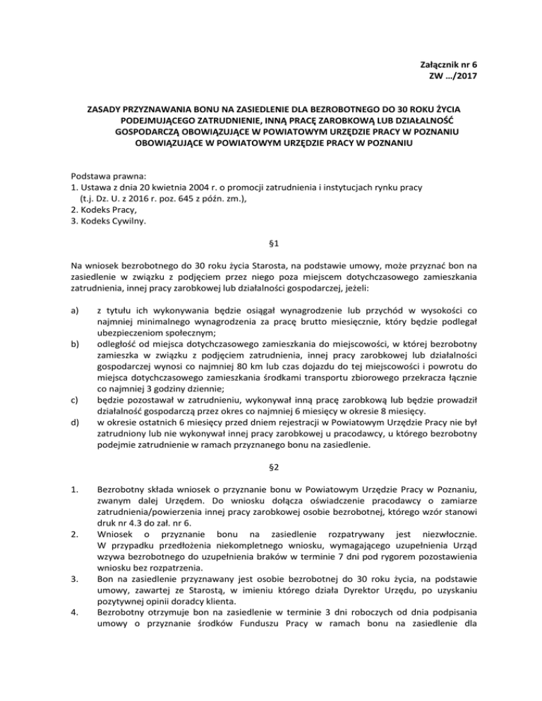 Załącznik nr 6 ZW …/2017 ZASADY PRZYZNAWANIA BONU NA ZASIEDLENIE DLA BEZROBOTNEGO DO 30 ROKU ŻYCIA PODEJMUJĄCEGO ZATRUDNIENIE, INNĄ PRACĘ ZAROBKOWĄ LUB DZIAŁALNOŚĆ GOSPODARCZĄ OBOWIĄZUJĄCE W POWIATOWYM URZĘDZIE PRACY W POZNANIU OBOWIĄZUJĄCE W POWIATOWYM URZĘDZIE PRACY W POZNANIU Podstawa prawna: 1. Ustawa z dnia 20 kwietnia 2004 r. o promocji zatrudnienia i instytucjach rynku pracy (t.j. Dz. U. z 2016 r. poz. 645 z późn. zm.), 2. Kodeks Pracy, 3. Kodeks Cywilny. §1 Na wniosek bezrobotnego do 30 roku życia Starosta, na podstawie umowy, może przyznać bon na zasiedlenie w związku z podjęciem przez niego poza miejscem dotychczasowego zamieszkania zatrudnienia, innej pracy zarobkowej lub działalności gospodarczej, jeżeli: a) b) c) d) z tytułu ich wykonywania będzie osiągał wynagrodzenie lub przychód w wysokości co najmniej minimalnego wynagrodzenia za pracę brutto miesięcznie, który będzie podlegał ubezpieczeniom społecznym; odległość od miejsca dotychczasowego zamieszkania do miejscowości, w której bezrobotny zamieszka w związku z podjęciem zatrudnienia, innej pracy zarobkowej lub działalności gospodarczej wynosi co najmniej 80 km lub czas dojazdu do tej miejscowości i powrotu do miejsca dotychczasowego zamieszkania środkami transportu zbiorowego przekracza łącznie co najmniej 3 godziny dziennie; będzie pozostawał w zatrudnieniu, wykonywał inną pracę zarobkową lub będzie prowadził działalność gospodarczą przez okres co najmniej 6 miesięcy w okresie 8 miesięcy. w okresie ostatnich 6 miesięcy przed dniem rejestracji w Powiatowym Urzędzie Pracy nie był zatrudniony lub nie wykonywał innej pracy zarobkowej u pracodawcy, u którego bezrobotny podejmie zatrudnienie w ramach przyznanego bonu na zasiedlenie. §2 1. 2. 3. 4. Bezrobotny składa wniosek o przyznanie bonu w Powiatowym Urzędzie Pracy w Poznaniu, zwanym dalej Urzędem. Do wniosku dołącza oświadczenie pracodawcy o zamiarze zatrudnienia/powierzenia innej pracy zarobkowej osobie bezrobotnej, którego wzór stanowi druk nr 4.3 do zał. nr 6. Wniosek o przyznanie bonu na zasiedlenie rozpatrywany jest niezwłocznie. W przypadku przedłożenia niekompletnego wniosku, wymagającego uzupełnienia Urząd wzywa bezrobotnego do uzupełnienia braków w terminie 7 dni pod rygorem pozostawienia wniosku bez rozpatrzenia. Bon na zasiedlenie przyznawany jest osobie bezrobotnej do 30 roku życia, na podstawie umowy, zawartej ze Starostą, w imieniu którego działa Dyrektor Urzędu, po uzyskaniu pozytywnej opinii doradcy klienta. Bezrobotny otrzymuje bon na zasiedlenie w terminie 3 dni roboczych od dnia podpisania umowy o przyznanie środków Funduszu Pracy w ramach bonu na zasiedlenie dla 5. 6. bezrobotnego do 30 roku życia podejmującego zatrudnienie, inną pracę zarobkową lub działalność gospodarczą. Środki finansowe w ramach bonu na zasiedlenie, w wysokości określonej w umowie, nie wyższe jednak niż 200% przeciętnego wynagrodzenia za pracę, wypłacane są niezwłocznie jednorazowo na wskazany przez bezrobotnego rachunek bankowy, najpóźniej w terminie 7 dni od dnia otrzymania bonu na zasiedlenie. Ostatecznym warunkiem zawarcia umowy o której mowa w pkt 4 jest dysponowanie przez Urząd środkami Funduszu Pracy. §3 Obowiązki bezrobotnego: 1. Po otrzymaniu bonu na zasiedlenie bezrobotny jest obowiązany w terminie: a) do 30 dni od dnia otrzymania bonu na zasiedlenie dostarczyć do Urzędu dokument potwierdzający podjęcie zatrudnienia, innej pracy zarobkowej lub działalności gospodarczej i oświadczenie o spełnieniu warunku, o którym mowa w §1 lit. b niniejszych zasad; do 7 dni, od dnia utraty zatrudnienia, innej pracy zarobkowej lub zaprzestania wykonywania działalności gospodarczej, przedstawić w Urzędzie pisemne oświadczenie o utracie zatrudnienia, innej pracy zarobkowej lub zaprzestaniu wykonywania działalności gospodarczej; do 7 dni, od dnia podjęcia nowego zatrudnienia, innej pracy zarobkowej lub działalności gospodarczej, przedstawić w Urzędzie pisemne oświadczenie o podjęciu nowego zatrudnienia, innej pracy zarobkowej lub działalności gospodarczej oraz oświadczenie o spełnieniu warunku, o którym mowa w §1 lit. b niniejszych zasad; do 8 miesięcy od dnia otrzymania bonu na zasiedlenie udokumentować pozostawanie w zatrudnieniu, wykonywanie innej pracy zarobkowej lub prowadzenie działalności gospodarczej przez okres 6 miesięcy. Środki przyznane w ramach bonu na zasiedlenie przeznacza się na pokrycie kosztów zamieszkania związanych z podjęciem zatrudnienia, innej pracy zarobkowej lub działalności. Bezrobotny nie ma obowiązku przedstawienia dokumentów potwierdzających wydatkowanie przyznanej kwoty. Dokumentami potwierdzającymi podjęcie zatrudnienia, innej pracy zarobkowej lub działalności gospodarczej są: b) c) d) 2. 3. a) w przypadku zatrudnienia, innej pracy zarobkowej: - kserokopia (potwierdzona za zgodność z oryginałem) umowy o pracę lub umowy o wykonywanie innej pracy zarobkowej; - imienne raporty ZUS RCA za okres 6 miesięcy zatrudnienia, wykonywania innej pracy zarobkowej; - kserokopie (potwierdzone za zgodność z oryginałem) list płac z potwierdzeniem odbioru wynagrodzenia przez zatrudnionego lub zaświadczenie pracodawcy o zatrudnieniu, wykonywaniu innej pracy zarobkowej z adnotacją o wysokości osiąganego wynagrodzenia w poszczególnych miesiącach zatrudnienia, wykonywania innej pracy zarobkowej; b) w przypadku prowadzenia działalności gospodarczej: - kserokopie (potwierdzone za zgodność z oryginałem) deklaracji zgłaszającej do ubezpieczeń ZUS ZUA; - kserokopie (potwierdzone za zgodność z oryginałem) deklaracji ZUS DRA za poszczególne miesiące prowadzenia działalności gospodarczej wraz z kserokopiami dowodów wpłaty; - kserokopie (potwierdzone za zgodność z oryginałem) dokumentów potwierdzających przychód, w zależności od wybranej formy opodatkowania (opodatkowanie na zasad