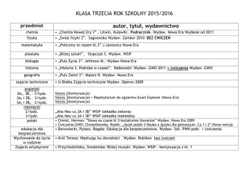 KLASA TRZECIA ROK SZKOLNY 2015/2016 przedmiot chemia fizyka matematyka autor, tytuł, wydawnictwo • „Chemia Nowej Ery 3” , Litwin, Kulawik:. Podręcznik. Wydaw. Nowa Era Wydanie od 2011 • „Świat fizyki 3”. Sagnowska Wydaw. Zamkor 2010 BEZ ĆWICZEŃ • „Policzmy to razem kl.3” J.Janowicz Nowa Era plastyka • „Bliżej sztuki”, Stopczyk S. Wydaw. WSiP biologia • „Puls Życia 3”. Jefimow M.: Wydaw Nowa Era historia • „Historia 3. Podróże w czasie”. Małkowski: Wydaw. GWO 2011 + ćwiczenia Wydaw. GWO geografia zajęcia techniczne angielski 3A1, 3B1 - 3/tydz. 3A2 i 3B2 – 3/tydz. 3A3 i 3B3 – 2/tydz. niemiecki 2/tydz. 3/tydz. polski edukacja dla bezpieczeństwa Wychowanie do życia w rodzinie Zajęcia artystyczne • „Puls Ziemi 3”. Malarz R. Wydaw. Nowa Era • U.Białka Zajęcia techniczne Wydaw. Operon 2009 Voices 2(kontynuacja) Voices 3(kontynuacja) + Repetytorium do egzaminu Exam Explorer (Nowa Era) Voices 2(kontynuacja) „Aha Neu cz.3A i 3B” WSiP (okładka zielona) „Aha Neu cz.3A i 3B” WSiP (okładka niebieska) • Chmiel, Herman: ”Słowa na czasie kl.3-kształcenie literackie” Wydaw, Nowa Era 2009 • Ćwiczenia GWO: Chwastkowska, Rożek: „Język polski 3 Nauka o języku dla gimnazjum. Cz.1 i 2”.Nowa wersja • Borowiecki, Pytasz, Regała: Edukacja dla bezpieczeństwa. Wydaw. Szk. PWN podr. + ćwiczenia • Król Teresa: Wędrując ku dorosłości . Wydaw. Rubikon bez ćwiczeń • Przychodzińska, Smoleńska: Bliżej muzyki. Wydaw. WSIP - kontynuacja z kl. 1