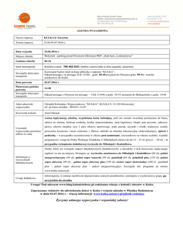 AGENDA WYJAZDOWA Nazwa imprezy KULKA k/ Szczytna Termin imprezy 25.06-05.07.2016 r. Data wyjazdu 25.06.2016 r. Miejsce zbiórki Białystok - parking przed Dworcem Głównym PKP , obok baru „Lokomotywa” Godzina zbiórki 05:10 Dane konwojenta Karolina Lustyk: 796 462 019 ( telefon czynny tylko w dniu wyjazdu i powrotu) Szczegóły dotyczące transportu Konwojent będzie miał zieloną tabliczkę z napisem “KULKA”. Odjazd pociągu ( nr pociągu TLK 18104 – godz. 05:40 przyjazd do Olsztyna godz. 09:11; transfer autokarowy do Kulki. Data powrotu 05.07.2016 r. Planowana godzina powrotu Szczegóły dotyczące transportu 14:48 Odjazd pociągu z Olsztyna (nr pociągu – TLK 51104) o godz. 10:53; przyjazd do Białegostoku o godz. 14:48 Adres placówki wypoczynku Ośrodek Kolonijno- Wypoczynkowy “KULKA”, KULKA 9, 12-120 Dźwierzuty tel. do biura ośrodka - 089/621-14-07 Kierownik kolonii Józef Zdunek ważną legitymację szkolną, wypełnioną kartę kolonijną, jeśli nie została wcześniej przekazana do biura, odzież na zmianę, bieliznę osobistą, kurtkę nieprzemakalną, strój kąpielowy, klapki pod prysznic, nakrycie Uczestnik wypoczynku powinien zabrać ze sobą: głowy, obuwie miękkie oraz 2 pary obuwia sportowego, mały plecak, ręczniki i środki toaletowe, środek przeciwko komarom i krem ochronny z filtrem, tabletki na chorobę lokomocyjną (indywidualnie), śpiwór i poduszkę – w przypadku uczestniczenia w obozie pod namiotami:, kieszonkowe na własne wydatki, wydatki programowe: wstęp do Parku Wodnego Tropikana w Mikołajkach (dzieci do lat 12 – 15 zł, powyż. – 30 zł) – w przypadku wykupienia dodatkowej wycieczki do Mikołajek i Kadzidłowa. Osoby, które nie wykupiły imprez fakultatywnych (dodatkowych), a chciałyby z nich skorzystać, będą mogły zapłacić za nie na miejscu. Dostępne są: wycieczka autokarowa do Mikołajek i Kadzidłowa (89 zł), pakiet Informacja o wycieczkach fakultatywnych antygrawitacyjny (99 zł), pakiet super tancerki (99 zł), paintball (69 zł), paintball plus (159 zł), pakiet super aktywny (99 zł) , pakiet super aktywny plus (199 zł), zestaw super ekstremalny (399 zł - paintball plus + pakiet super aktywny plus + pakiet antygrawitacyjny). Szczegóły dot. programu na stronie www.kulka.mazury.pl. Uwagi dodatkowe Informujemy, iż istnieje możliwość deponowania cennych przedmiotów i pieniędzy u wychowawcy grupy po przyjeździe do ośrodka Uwaga! Pod adresem www.blog.kolonieiobozy.pl codzienna relacja z kolonii i obozów w Kulce. Zapraszamy rodziców do odwiedzenia dzieci w Kulce i wzięcia udziału w Pikniku Rodzinnym w dniu 03.07.2016 r. - więcej informacji: www.kulka.mazury.pl/piknik-rodzinny Życzymy udanego wypoczynku i wspaniałej zabawy!
