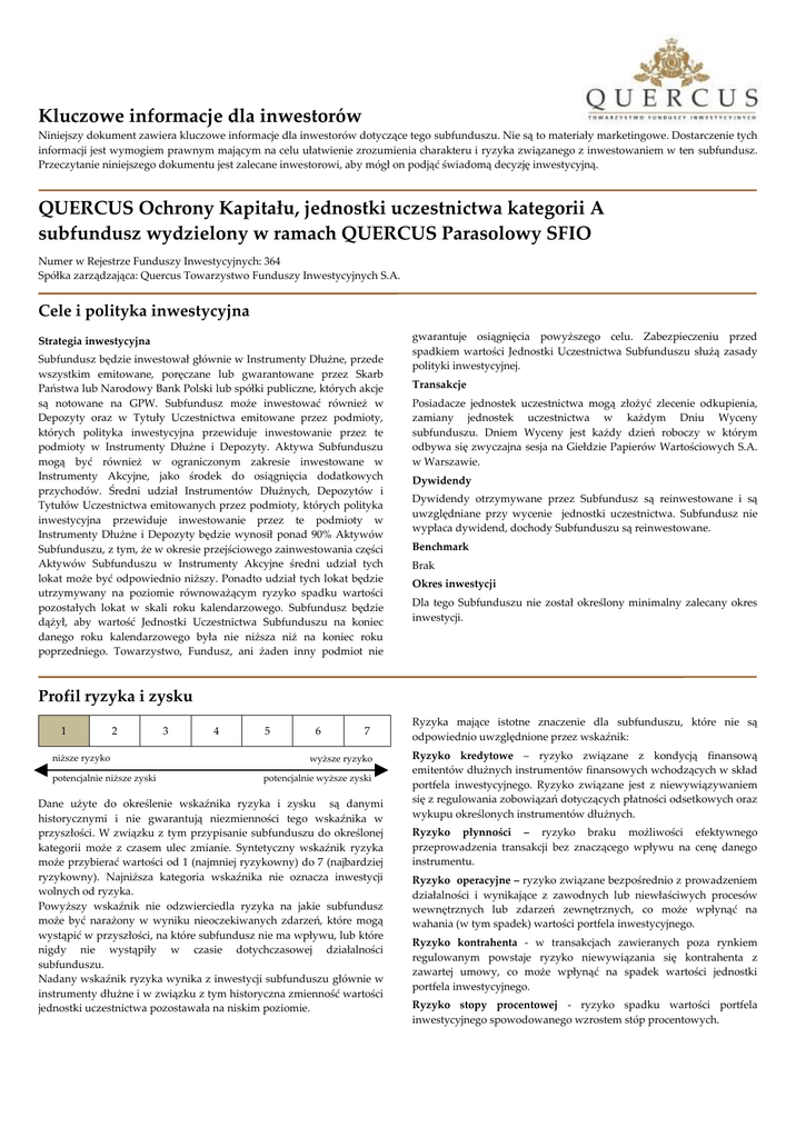 Kluczowe informacje dla inwestorów Niniejszy dokument zawiera kluczowe informacje dla inwestorów dotyczące tego subfunduszu. Nie są to materiały marketingowe. Dostarczenie tych informacji jest wymogiem prawnym mającym na celu ułatwienie zrozumienia charakteru i ryzyka związanego z inwestowaniem w ten subfundusz. Przeczytanie niniejszego dokumentu jest zalecane inwestorowi, aby mógł on podjąć świadomą decyzję inwestycyjną. QUERCUS Ochrony Kapitału, jednostki uczestnictwa kategorii A subfundusz wydzielony w ramach QUERCUS Parasolowy SFIO Numer w Rejestrze Funduszy Inwestycyjnych: 364 Spółka zarządzająca: Quercus Towarzystwo Funduszy Inwestycyjnych S.A. Cele i polityka inwestycyjna Strategia inwestycyjna Subfundusz będzie inwestował głównie w Instrumenty Dłużne, przede wszystkim emitowane, poręczane lub gwarantowane przez Skarb Państwa lub Narodowy Bank Polski lub spółki publiczne, których akcje są notowane na GPW. Subfundusz może inwestować również w Depozyty oraz w Tytuły Uczestnictwa emitowane przez podmioty, których polityka inwestycyjna przewiduje inwestowanie przez te podmioty w Instrumenty Dłużne i Depozyty. Aktywa Subfunduszu mogą być również w ograniczonym zakresie inwestowane w Instrumenty Akcyjne, jako środek do osiągnięcia dodatkowych przychodów. Średni udział Instrumentów Dłużnych, Depozytów i Tytułów Uczestnictwa emitowanych przez podmioty, których polityka inwestycyjna przewiduje inwestowanie przez te podmioty w Instrumenty Dłużne i Depozyty będzie wynosił ponad 90% Aktywów Subfunduszu, z tym, że w okresie przejściowego zainwestowania części Aktywów Subfunduszu w Instrumenty Akcyjne średni udział tych lokat może być odpowiednio niższy. Ponadto udział tych lokat będzie utrzymywany na poziomie równoważącym ryzyko spadku wartości pozostałych lokat w skali roku kalendarzowego. Subfundusz będzie dążył, aby wartość Jednostki Uczestnictwa Subfunduszu na koniec danego roku kalendarzowego była nie niższa niż na koniec roku poprzedniego. Towarzystwo, Fundusz, ani żaden inny podmiot nie gwarantuje osiągnięcia powyższego celu. Zabezpieczeniu przed spadkiem wartości Jednostki Uczestnictwa Subfunduszu służą zasady polityki inwestycyjnej. Transakcje Posiadacze jednostek uczestnictwa mogą złożyć zlecenie odkupienia, zamiany jednostek uczestnictwa w każdym Dniu Wyceny subfunduszu. Dniem Wyceny jest każdy dzień roboczy w którym odbywa się zwyczajna sesja na Giełdzie Papierów Wartościowych S.A. w Warszawie. Dywidendy Dywidendy otrzymywane przez Subfundusz są reinwestowane i są uwzględniane przy wycenie jednostki uczestnictwa. Subfundusz nie wypłaca dywidend, dochody Subfunduszu są reinwestowane. Benchmark Brak Okres inwestycji Dla tego Subfunduszu nie został określony minimalny zalecany okres inwestycji. Profil ryzyka i zysku 1 2 niższe ryzyko potencjalnie niższe zyski 3 4 5 6 7 wyższe ryzyko potencjalnie wyższe zyski Dane użyte do określenie wskaźnika ryzyka i zysku są danymi historycznymi i nie gwarantują niezmienności tego wskaźnika w przyszłości. W związku z tym przypisanie subfunduszu do określonej kategorii może z czasem ulec zmianie. Syntetyczny wskaźnik ryzyka może przybierać wartości od 1 (najmniej ryzykowny) do 7 (najbardziej ryzykowny). Najniższa kategoria wskaźnika nie oznacza inwestycji wolnych od ryzyka. Powyższy wskaźnik nie odzwierciedla ryzyka na jakie subfundusz może być narażony w wyniku nieoczekiwanych zdarzeń, które mogą wystąpić w przyszłości, na które subfundusz nie ma wpływu, lub które nigdy nie wystąpiły w czasie dotychczasowej działalności subfunduszu. Nadany wskaźnik ryzyka wynika z inwestycji subfunduszu głównie w instrumenty dłużne i w związku z tym historyczna zmienność wartości jednostki uczestnictwa pozostawała na niskim poziomie. Ryzyka mające istotne znaczenie dla subfunduszu, które nie są odpowiednio uwzględnione przez wskaźnik: Ryzyko kredytowe – ryzyko związane z kondycją finansową emitentów dłużnych instrumentów finansowych wchodzących w skład portfela inwestycyjnego. Ryzyko związane jest z niewywiązywaniem się z regulowania zobowiązań dotyczących płatności odsetkowych oraz wykupu określonych instrumentów dłużnych. Ryzyko płynności – ryzyko braku możliwości efektywnego przeprowadzenia transakcji bez znaczącego wpływu na cenę danego instrumentu. Ryzyko operacyjne – ryzyko związane bezpośrednio z prowadzeniem działalności i wynikające z zawodnych lub niewłaściwych procesów wewnętrznych lub zdarzeń zewnętrznych, co może wpłynąć na wahania (w tym spadek) wartości portfela inwestycyjnego. Ryzyko kontrahenta - w transakcjach zawieranych poza rynkiem regulowanym powstaje ryzyko niewywiązania się kontrahenta z zawartej umowy, co może wpłynąć na spadek wartości jednostki portfela inwestycyjnego. Ryzyko stopy procentowej - ryzyko spadku wartości portfela inwestycyjnego spowodowanego wzrostem stóp procentowych. Kluczowe informacje dla inwestorów - QUERCUS Ochrony Kapitału Opłaty Opłaty za nabycie i umorzenie jednostek uczestnictwa: Opłata za nabycie 1,5% Opłata za umorzenie brak Jest to maksymalna kwota, jaka może zostać pobrana z Państwa środków przed ich zainwestowaniem. Opłaty pobierane z subfunduszu w ciągu roku: Opłaty bieżące (za 2015 r.) 1,05% Opłaty pobierane z subfunduszu w określonych warunkach szczególnych: 10% rocznie od wszystkich zysków osiągniętych przez subfundusz, których wysokość przekroczyła poziom referencyjny obowiązujący dla tych opłat – poziomem referencyjnym jest zmiana wartości jednostki uczestnictwa równa 0% w skali roku Opłata za wyniki subfunduszu (za 2015 r.) Opłaty za nabycie i umorzenie podane zostały w maksymalnej wysokości. W niektórych przypadkach inwestor może płacić niższe opłaty. Dla roku kończącego się w grudniu 2015 r. wartość liczbowa określająca wysoko