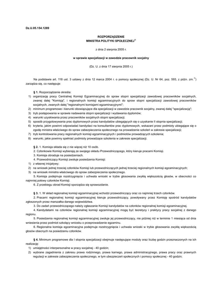 Dz.U.05.154.1289 ROZPORZĄDZENIE 1) MINISTRA POLITYKI SPOŁECZNEJ z dnia 2 sierpnia 2005 r. w sprawie specjalizacji w zawodzie pracownik socjalny (Dz. U. z dnia 17 sierpnia 2005 r.) 2) Na podstawie art. 118 ust. 3 ustawy z dnia 12 marca 2004 r. o pomocy społecznej (Dz. U. Nr 64, poz. 593, z późn. zm. ) zarządza się, co następuje: § 1. Rozporządzenie określa: 1) organizację pracy Centralnej Komisji Egzaminacyjnej do spraw stopni specjalizacji zawodowej pracowników socjalnych, zwanej dalej "Komisją", i regionalnych komisji egzaminacyjnych do spraw stopni specjalizacji zawodowej pracowników socjalnych, zwanych dalej "regionalnymi komisjami egzaminacyjnymi"; 2) minimum programowe i kierunki obowiązujące dla specjalizacji w zawodzie pracownik socjalny, zwanej dalej "specjalizacją"; 3) tryb postępowania w sprawie nadawania stopni specjalizacji i wydawania dyplomów; 4) warunki uzyskiwania przez pracowników socjalnych stopni specjalizacji; 5) sposób przygotowywania prac dyplomowych przez kandydatów ubiegających się o uzyskanie II stopnia specjalizacji; 6) kryteria, jakim powinni odpowiadać kandydaci na konsultantów prac dyplomowych, wskazani przez podmioty ubiegające się o zgodę ministra właściwego do spraw zabezpieczenia społecznego na prowadzenie szkoleń w zakresie specjalizacji; 7) tryb kontrolowania pracy regionalnych komisji egzaminacyjnych i podmiotów prowadzących szkolenia; 8) warunki, jakie powinny spełniać podmioty prowadzące szkolenia w zakresie specjalizacji. § 2. 1. Komisja składa się z nie więcej niż 10 osób. 2. Członkowie Komisji wybierają ze swojego składu Przewodniczącego, który kieruje pracami Komisji. 3. Komisja obraduje na posiedzeniach. 4. Przewodniczący Komisji zwołuje posiedzenia Komisji: 1) z własnej inicjatywy; 2) na wniosek jednej trzeciej członków Komisji lub przewodniczących jednej trzeciej regionalnych komisji egzaminacyjnych; 3) na wniosek ministra właściwego do spraw zabezpieczenia społecznego. 5. Komisja podejmuje rozstrzygnięcia i uchwala wnioski w trybie głosowania zwykłą większością głosów, w obecności co najmniej połowy członków Komisji. 6. Z przebiegu obrad Komisji sporządza się sprawozdanie. § 3. 1. W skład regionalnej komisji egzaminacyjnej wchodzi przewodniczący oraz co najmniej trzech członków. 2. Pracami regionalnej komisji egzaminacyjnej kieruje przewodniczący, powoływany przez Komisję spośród kandydatów zgłoszonych przez marszałka danego województwa. 3. Do zadań przewodniczącego należy zgłaszanie Komisji kandydatów na członków regionalnej komisji egzaminacyjnej. 4. Kandydatami na członków regionalnej komisji egzaminacyjnej mogą być teoretycy i praktycy pracy socjalnej z danego regionu. 5. Posiedzenia regionalnej komisji egzaminacyjnej zwołuje jej przewodniczący, nie później niż w terminie 1 miesiąca od dnia wniesienia przez podmiot szkolący wniosku o przeprowadzenie egzaminu. 6. Regionalna komisja egzaminacyjna podejmuje rozstrzygnięcia i uchwala wnioski w trybie głosowania zwykłą większością głosów obecnych na posiedzeniu członków. § 4. Minimum programowe dla I stopnia specjalizacji obejmuje następujące moduły oraz liczbę godzin przeznaczonych na ich realizację: 1) umiejętności interpersonalne w pracy socjalnej - 40 godzin; 2) wybrane zagadnienia z zakresu prawa rodzinnego, prawa karnego, prawa administracyjnego, prawa pracy oraz prawnych regulacji w zakresie zabezpieczenia społecznego, w tym ubezpieczeń społecznych i pomocy społecznej - 40 godzin; 3) doskonalenie metod i technik pracy socjalnej: a) z osobą - 40 godzin, b) z rodziną i grupą - 40 godzin, c) ze środowiskiem lokalnym - 20 godzin; 4) metody oraz techniki tworzenia i oceny projektów socjalnych - 20 godzin; 5) metody i techniki oceny w pracy socjalnej - 10 godzin. § 5. 1. Minimum programowe dla II stopnia specjalizacji obejmuje następujące moduły oraz liczbę godzin przeznaczonych na ich realizację: 1) w zakresie przygotowania ogólnego: a) system prawny i organizacyjny pomocy społecznej w wybranych państwach, w szczególności w państwach członkowskich Unii Europejskiej - 20 godzin, b) praca w zespole - zespołowe rozwiązywanie problemów i konfliktów - 20 godzin, c) projekt socjalny - metodyka projektowania, promocja organizacji i działań socjalnych oraz metody ewaluacji - 20 godzin, d) interwencja kryzysowa - podstawy teoretyczne metody i podstawowe umiejętności jej stosowania w pracy socjalnej - 20 godzin, e) problem wypalenia zawodowego - psychologiczne i społeczne skutki oraz metody przeciwdziałania - 10 godzin, f) superwizja w pomocy społecznej - podstawy teoretyczne i modele stosowane w praktyce - 20 godzin, g) funkcje i zadania organizacji pozarządowych, ze szczególnym uwzględnieniem działających w pomocy społecznej - 10 godzin, h) pracownik socjalny jako animator środowiska lokalnego - 10 godzin; 2) w zakresie przygotowania specjalistycznego, dostosowanego merytorycznie do kierunków pracy socjalnej, o których mowa w ust. 2 i 3: a) interdyscyplinarna charakterystyka problemu - podstawowe wiadomości o aspektach socjologicznych, psychologicznych, medycznych i ekonomicznych - 50 godzin, b) metody pracy socjalnej, z uwzględnieniem działań profilaktycznych - 30 godzin, c) instytucje i organizacje wsparcia społecznego - 20 godzin, d) projekt socjalny - przygotowanie i próba wdrożenia w trakcie specjalizacji - 10 godzin. 2. W zakresie przygotowania specjalistycznego ustala się następujące kierunki pracy socjalnej: 1) z dziećmi; 2) z osobami starszymi; 3) z osobami bezrobotnymi; 4) z osobami z zaburzeniami psychicznymi; 5) z osobami upośledzonymi umysłowo; 6) z osobami będącymi ofiarami przemocy; 7) z osobami niepełnosprawnymi fizycznie; 8) z osobami uzależnionymi, w szczególności od alkoholu i narkotyków; 9) z osobami bezdomnymi wychodzącymi z bezdomności oraz rodzinami tych osób; 10) z cudzoziemcami, ze szczeg