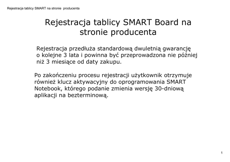 Rejestracja tablicy SMART na stronie producenta Rejestracja tablicy SMART Board na stronie producenta Rejestracja przedłuża standardową dwuletnią gwarancję o kolejne 3 lata i powinna być przeprowadzona nie później niż 3 miesiące od daty zakupu. Po zakończeniu procesu rejestracji użytkownik otrzymuje również klucz aktywacyjny do oprogramowania SMART Notebook, którego podanie zmienia wersję 30dniową aplikacji na bezterminową. 1 Rejestracja tablicy SMART na stronie producenta W celu przeprowadzenia skutecznej rejestracji potrzebujemy: • komputer z dostępem do Internetu, • numer fabryczny tablicy. Numer fabryczny tablicy znajduje się na naklejce z boku w prawej dolnej części tablicy. naklejka z numerem seryjnym 2 Rejestracja tablicy SMART na stronie producenta Uruchamiamy przeglądarkę internetową i wpisujemy http://www.smarttech.com/us/Product+Registration lub klikamy w poniższy link (co powinno automatycznie uruchomić przeglądarkę i wczytać właściwą stronę) 3 Rejestracja tablicy SMART na stronie producenta Na otwartej stronie klikamy w link Continue 4 Rejestracja tablicy SMART na stronie producenta Na kolejnej stronie wpisujemy w okienko numer seryjny naszej tablicy i klikamy w przycisk Validate. Po zaakceptowaniu numeru przez system wybieramy przycisk Next. SB640H1000000 5 Rejestracja tablicy SMART na stronie producenta Wypełniam wyświetlony formularz imię nazwisko wybieramy z rozwijanej listy naszą funkcję w instytucji nazwa instytucji wybieramy z rozwijanej listy typ instytucji adres instytucji c.d. adresu instytucji miasto nie dotyczy kod pocztowy 6 Rejestracja tablicy SMART na stronie producenta kraj numer telefonu numer wewnętrzny adres email UWAGA na ten adres zostanie wysłane potwierdzenie rejestracji zaznaczamy opcję Yes – tak lub No – nie w zależności czy chcemy otrzymwać dodatkowe informacje na swój adres email nie dotyczy po wypełnieniu formularza naciskamy przycisk Next 7 Rejestracja tablicy SMART na stronie producenta Po zakończeniu rejestracji wyświetla się komunikat SB640H1000000 8 Rejestracja tablicy SMART na stronie producenta Wzór informacji o rejestracji tablicy wysyłany na adres email klucz aktywacyjny do oprogramowania SAMRT Notebook UWAGA Jeden klucz aktywacyjny do oprogramowania SAMRT Notebook może być używany przy wszystkich instalacjach aplikacji w danej instytucji. 9