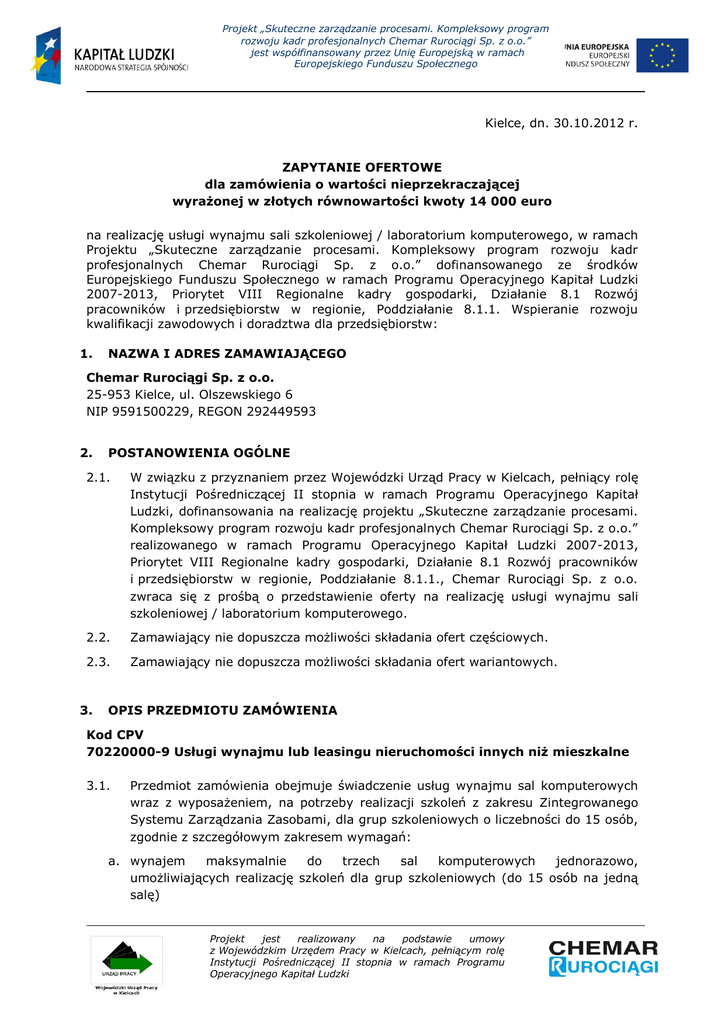Projekt „Skuteczne zarządzanie procesami. Kompleksowy program rozwoju kadr profesjonalnych Chemar Rurociągi Sp. z o.o.” jest współfinansowany przez Unię Europejską w ramach Europejskiego Funduszu Społecznego Kielce, dn. 30.10.2012 r. ZAPYTANIE OFERTOWE dla zamówienia o wartości nieprzekraczającej wyrażonej w złotych równowartości kwoty 14 000 euro na realizację usługi wynajmu sali szkoleniowej / laboratorium komputerowego, w ramach Projektu „Skuteczne zarządzanie procesami. Kompleksowy program rozwoju kadr profesjonalnych Chemar Rurociągi Sp. z o.o.” dofinansowanego ze środków Europejskiego Funduszu Społecznego w ramach Programu Operacyjnego Kapitał Ludzki 2007-2013, Priorytet VIII Regionalne kadry gospodarki, Działanie 8.1 Rozwój pracowników i przedsiębiorstw w regionie, Poddziałanie 8.1.1. Wspieranie rozwoju kwalifikacji zawodowych i doradztwa dla przedsiębiorstw: 1. NAZWA I ADRES ZAMAWIAJĄCEGO Chemar Rurociągi Sp. z o.o. 25-953 Kielce, ul. Olszewskiego 6 NIP 9591500229, REGON 292449593 2. POSTANOWIENIA OGÓLNE 2.1. W związku z przyznaniem przez Wojewódzki Urząd Pracy w Kielcach, pełniący rolę Instytucji Pośredniczącej II stopnia w ramach Programu Operacyjnego Kapitał Ludzki, dofinansowania na realizację projektu „Skuteczne zarządzanie procesami. Kompleksowy program rozwoju kadr profesjonalnych Chemar Rurociągi Sp. z o.o.” realizowanego w ramach Programu Operacyjnego Kapitał Ludzki 2007-2013, Priorytet VIII Regionalne kadry gospodarki, Działanie 8.1 Rozwój pracowników i przedsiębiorstw w regionie, Poddziałanie 8.1.1., Chemar Rurociągi Sp. z o.o. zwraca się z prośbą o przedstawienie oferty na realizację usługi wynajmu sali szkoleniowej / laboratorium komputerowego. 2.2. Zamawiający nie dopuszcza możliwości składania ofert częściowych. 2.3. Zamawiający nie dopuszcza możliwości składania ofert wariantowych. 3. OPIS PRZEDMIOTU ZAMÓWIENIA Kod CPV 70220000-9 Usługi wynajmu lub leasingu nieruchomości innych niż mieszkalne 3.1. Przedmiot zamówienia obejmuje świadczenie usług wynajmu sal komputerowych wraz z wyposażeniem, na potrzeby realizacji szkoleń z zakresu Zintegrowanego Systemu Zarządzania Zasobami, dla grup szkoleniowych o liczebności do 15 osób, zgodnie z szczegółowym zakresem wymagań: a. wynajem maksymalnie do trzech sal komputerowych jednorazowo, umożliwiających realizację szkoleń dla grup szkoleniowych (do 15 osób na jedną salę) Projekt jest realizowany na podstawie umowy z Wojewódzkim Urzędem Pracy w Kielcach, pełniącym rolę Instytucji Pośredniczącej II stopnia w ramach Programu Operacyjnego Kapitał Ludzki Projekt „Skuteczne zarządzanie procesami. Kompleksowy program rozwoju kadr profesjonalnych Chemar Rurociągi Sp. z o.o.” jest współfinansowany przez Unię Europejską w ramach Europejskiego Funduszu Społecznego b. każda z sal komputerowych musi być wyposażona w min. 3 stanowiska komputerowe oraz w stoliki lub krzesła z blatami, sprzęt audiowizualny (rzutnik, ekran, laptop) i inne dodatkowe elementy jak flipchart (dopuszcza się sprzęt audiowizualny mobilny) c. czas wynajmu sal: 8 godzin lekcyjnych szkolenia w ciągu jednego dnia, w godzinach od 8.00/9.00 do 16.00/17.00, w tym dwie przerwy techniczne max. do 30 minut d. wynajem zgodnie z szczegółowym poniższym harmonogramem realizacji szkoleń: L.p. 2012 r. 9 10 11 2013 r. 12 1 1. Obieg dokumentów 3 4 2. Sprzedaż 3 3 3. Zakupy i gospodarka materiałowa 4. Planowanie i sterowanie produkcji 2 2 5. Finanse i księgowość 6 4 6. Zarządzanie projektami 7. Business intelligence 2 2 8. Zarządzanie personelem 4 2 3.2. 4. Temat szkolenia 3 2 4 5 6 3 3 3 2 3 3 3 3 3 2 2 4 2 2 4 3 2 2 2 2 2 1 Szkolenia winny odbywać się w Kielcach, w max. odległości 5 km od siedziby Spółki Chemar Rurociągi Sp. z o.o., ul. Olszewskiego 6. WYMOGI FORMALNE OFERTY 4.1. O udzielenie zamówienia mogą ubiegać się Oferenci, którzy: 4.1.1. Posiadają licencję lub stosowne uprawnienia / upoważnienie do instalacji oprogramowania tj. zintegrowanego systemu zarządzania zasobami Gardens– Software. Na potwierdzenie spełniania powyższego warunku Oferent zobowiązany jest do załączenia dokumentów potwierdzających posiadanie stosownych licencji (kopia za zgodność z oryginałem, potwierdzona przez osobę uprawnioną do reprezentacji). 4.2. Oferta powinna być sporządzona w języku polskim, na komputerze lub inną trwałą, czytelną techniką. Projekt jest realizowany na podstawie umowy z Wojewódzkim Urzędem Pracy w Kielcach, pełniącym rolę Instytucji Pośredniczącej II stopnia w ramach Programu Operacyjnego Kapitał Ludzki Projekt „Skuteczne zarządzanie procesami. Kompleksowy program rozwoju kadr profesjonalnych Chemar Rurociągi Sp. z o.o.” jest współfinansowany przez Unię Europejską w ramach Europejskiego Funduszu Społecznego 4.3. Oferta powinna być podpisana reprezentowania Oferenta. przez osobę (osoby) uprawnioną do 4.4. Oferenci ponoszą wszelkie koszty własne związane z przygotowaniem i złożeniem Oferty. 4.5. Ofertę należy umieścić w zamkniętej kopercie w sposób uniemożliwiający odczytanie zawartości bez jej uszkodzenia lub też jej przypadkowe otwarcie. 4.6. Na kopercie należy umieścić dane firmy (nazwiska) i adres Oferenta, co umożliwi zwrot nienaruszonej oferty w przypadku złożenia oferty po terminie lub jej wycofania, oraz napis: „Oferta na świadczenie wynajmu sal komputerowych wraz z wyposażeniem na potrzeby realizacji szkoleń z zakresu Zintegrowanego Systemu Zarządzania Zasobami, w ramach projektu dofinansowanego z funduszy Unii Europejskiej – nie otwierać do dnia 7 listopada 2012 r. do godziny 12.00” 4.7. 5. Wzór formularza ofertowego stanowi załącznik nr 1 do niniejszego zapytania ofertowego. MIEJSCE ORAZ TERMIN SKŁADANIA OFERT Wszystkie oferty w zaklejonych lub zalakowanych kopertach oznaczonych zgodnie z wymogami punktu 4.6., muszą być dostarczone do Biura
