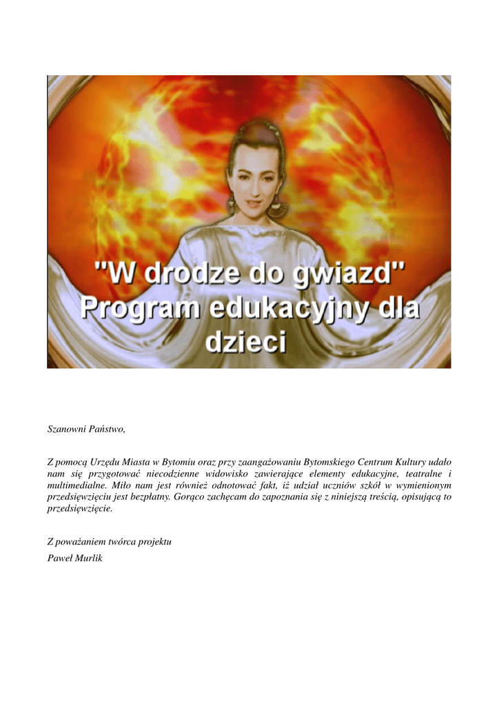 Szanowni Państwo, Z pomocą Urzędu Miasta w Bytomiu oraz przy zaangażowaniu Bytomskiego Centrum Kultury udało nam się przygotować niecodzienne widowisko zawierające elementy edukacyjne, teatralne i multimedialne. Miło nam jest również odnotować fakt, iż udział uczniów szkół w wymienionym przedsięwzięciu jest bezpłatny. Gorąco zachęcam do zapoznania się z niniejszą treścią, opisującą to przedsięwzięcie. Z poważaniem twórca projektu Paweł Murlik Planetarium i Technologie W proponowanym projekcie wiedza będzie przekazywana z zastosowaniem najnowszych technik multimedialnych: projekcje obrazu w systemie 3D, dźwięk przestrzenny 5.1, mini kopuła sferyczna przypominająca planetarium oraz efektowne oświetlenie wzbogacające całość. W przyszłości system będzie rozbudowany o projekcje holograficzne i interfejs do „przebywania wirtualnej rzeczywistości”, dostępny również dla dzieci niepełnosprawnych ruchowo. Każdy z nas pamięta z dzieciństwa lekcje prowadzone oryginalnie i nowatorsko. Zachowujemy w pamięci obraz wybitnych pedagogów, którzy kształtowali nas przez lata. Jednak, co wydaje się nad wyraz interesujące, szczególnie zapamiętujemy również zajęcia prowadzone poza szkołą oraz lekcje z udziałem niecodziennych gości... Projekt łączy ze sobą treści dotyczące nauki o wszechświecie i procesu jego powstawania z namysłem (wielokulturowość socjologicznym w odniesieniu do fizyczności, życia na Ziemi i w całym kosmosie). technik Zastosowanie multimedialnych najnowszych w procesie przekazywania ww. treści ma na celu rozbudzenie potrzeby głębszego poznawania otaczającego nas środowiska, a także zrozumienie istoty życia człowieka. Cały projekt, poprzez interesująco zaprezentowaną wiedzę, ma pobudzać wyobraźnię, kreatywne myślenie, a także prowokować do śmiałych założeń humanistycznych i filozoficznych. Celem przedsięwzięcia jest wzbudzenie w dzieciach chęci do indywidualnego myślenia i wyrażania swoich osobistych opinii, a nie bezrefleksyjnego powtarzania zasłyszanych treści czy „wykutych” na pamięć regułek. Zatem, oprócz ściśle określonych treści edukacyjnych związanych z programem nauczania, w projekcie pojawiają się też elementy ułatwiające dzieciom indywidualne spojrzenie na otaczający nas świat. Rozbudzenie ciekawości w ten sposób zakłada, iż dzieci chętniej będą uczyły się zagadnień związanych z astronomią, a co za tym idzie fizyką, matematyką i chemią, a także z biologią. Dzięki temu projektowi można zachęcić uczniów do kreowania nowych pomysłów dotyczących ich przyszłości: „...może to ja będę astronautą lub naukowcem...”. W ten prosty sposób również u dzieci zachodzi proces dojrzewania do niezwykle istotnych, świadomych decyzji. Interaktywny Teatr dla Dzieci CZĘŚĆ I TECHNIKI MULTIMEDIALNE I INTERAKCJA Przedstawienia teatralne, gdzie zaciera się ścisły podział między aktorem a widzem, nie są już rzadkością. Wiele spektakli przygotowywanych jest w taki sposób, aby czynnie angażować widza do uczestniczenia w widowisku. Przez ostatnią dekadę przeszliśmy również rewolucję teatralną odnośnie stosowania technik multimedialnych na scenie. Nikogo nie dziwią już projekcje podczas przedstawień teatralnych. Niektórzy krytycy sceptycznie odnoszą się do takich zmian, twierdząc, że teatr powinien zachować formę tradycyjną. Obawy te podyktowane są na ogół lękiem przed degradacją kunsztu aktorskiego – głównego katalizatora w budowaniu iluzji scenicznej względem nowoczesnych technologii. Warto odnotować jednak, że to właśnie teatr, przed nadejściem ery „motorem” elektroniki, rozwoju był technik pomagających w budowaniu iluzorycznych światów teatralnego makrokosmosu, w taki sposób, aby widz mógł w pełni poddać się scenicznej iluzji. Istotną rolę odgrywają nie tylko skomplikowane scenografie, ale także warunki oświetleniowe. Początek XIX wieku przynosi oświetlenie gazowe. Pod koniec drugiej dekady, w 1818 roku, jeden z londyńskich teatrów mógł poszczycić się właśnie oświetleniem gazowym z możliwością regulacji jasności świecenia. Natomiast w połowie wieku XIX pojawia się już teatralne oświetlenie elektryczne. Rozwiązania multimedialne nie są niczym nowym. Pierwsza projekcja multimedialna na scenie teatralnej odbyła się już w 1908 roku, a dokonał tego Konstanty Stanisławski. Zatem i dziś, w erze cybernetyki, nie uciekniemy od nowoczesnych rozwiązań w przestrzeni teatralnej. Warto jednak „dozować” środki techniczne w taki sposób, aby sztuka pozostała nadal dziełem człowieka. Specyficznym, szczerym, otwartym na emocje, ale jednocześnie niezwykle wymagającym widzem jest dziecko. Urodzonych w XXI w. nie zaskoczymy już nowoczesnymi rozwiązaniami na scenie. Kilkuletnie dzieci postrzegają rozwiązania technologiczne, które jeszcze kilka lat temu były nowością, jako normalne. Jednak upraszczając nasze przedstawienie wyłącznie do gry aktorskiej (a zatem środka tradycyjnego w teatrze), przykulibyśmy uwagę małego widza najwyżej na kilkanaście minut. Niejednokrotnie przekonałem się, że uwaga tak szczególnego odbiorcy, jakim jest dziecko, ma określone ramy czasowe. Dlatego też postanowiliśmy wszystkie zadania aktorskie ułożyć w taki sposób, aby dziecięca publika cały czas czuła się zaangażowana w przedstawienie, a także miała poczucie realnego wpływu na rozwój wydarzeń. Widowisko nie jest rozgrywane w typowej przestrzeni scenicznej - aktor większość czasu spędza między dziećmi. Ponadto integralną część spektaklu stanowią przygotowane wcześniej projekcje filmowe, będące - obok gry aktorskiej ważnym artystycznym środkiem wyrazu. CZĘŚĆ II EDUKACJA POPRZEZ TEATR Od lat 60. XX wieku znana jest formuła pod nazwą TIE (Theatre in Education). Ideę tę zapoczątkowała formacja Belgrade Theatre w Coventry 
