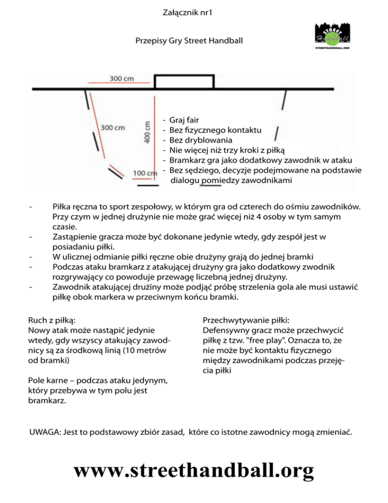 Załącznik nr1 Przepisy Gry Street Handball - - Graj fair Bez fizycznego kontaktu Bez dryblowania Nie więcej niż trzy kroki z piłką Bramkarz gra jako dodatkowy zawodnik w ataku Bez sędziego, decyzje podejmowane na podstawie dialogu pomiedzy zawodnikami Piłka ręczna to sport zespołowy, w którym gra od czterech do ośmiu zawodników. Przy czym w jednej drużynie nie może grać więcej niż 4 osoby w tym samym czasie. Zastąpienie gracza może być dokonane jedynie wtedy, gdy zespół jest w posiadaniu piłki. W ulicznej odmianie piłki ręczne obie drużyny grają do jednej bramki Podczas ataku bramkarz z atakującej drużyny gra jako dodatkowy zwodnik rozgrywający co powoduje przewagę liczebną jednej drużyny. Zawodnik atakującej drużīny może podjąć próbę strzelenia gola ale musi ustawić piłkę obok markera w przeciwnym końcu bramki. Ruch z piłką: Nowy atak może nastąpić jedynie wtedy, gdy wszyscy atakujący zawodnicy są za środkową linią (10 metrów od bramki) Pole karne – podczas ataku jedynym, który przebywa w tym polu jest bramkarz. Przechwytywanie piłki: Defensywny gracz może przechwycić piłkę z tzw. "free play". Oznacza to, że nie może być kontaktu fizycznego między zawodnikami podczas przejęcia piłki UWAGA: Jest to podstawowy zbiór zasad, które co istotne zawodnicy mogą zmieniać. www.streethandball.org