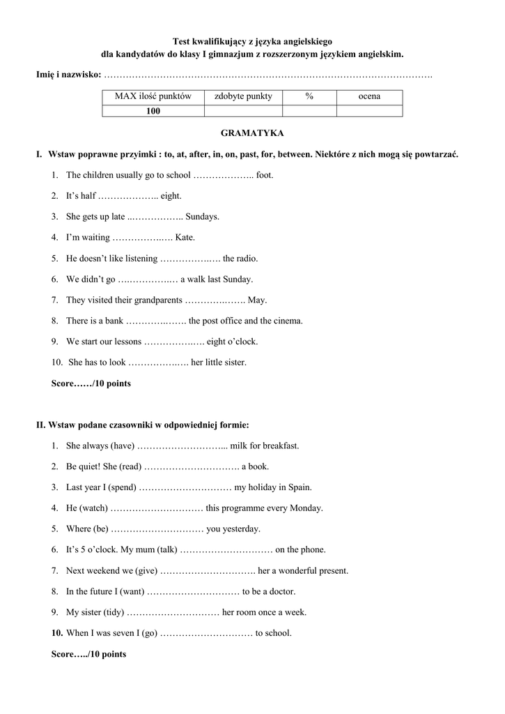 Test kwalifikujący z języka angielskiego dla kandydatów do klasy I gimnazjum z rozszerzonym językiem angielskim. Imię i nazwisko: ……………………………………………………………………………………………. MAX ilość punktów zdobyte punkty % ocena 100 GRAMATYKA I. Wstaw poprawne przyimki : to, at, after, in, on, past, for, between. Niektóre z nich mogą się powtarzać. 1. The children usually go to school ……………….. foot. 2. It’s half ……………….. eight. 3. She gets up late ..…………….. Sundays. 4. I’m waiting …………….…. Kate. 5. He doesn’t like listening …………….…. the radio. 6. We didn’t go ….………….… a walk last Sunday. 7. They visited their grandparents ………….……. May. 8. There is a bank ………….……. the post office and the cinema. 9. We start our lessons …………….…. eight o’clock. 10. She has to look …………….…. her little sister. Score……/10 points II. Wstaw podane czasowniki w odpowiedniej formie: 1. She always (have) ………………………... milk for breakfast. 2. Be quiet! She (read) …………………………. a book. 3. Last year I (spend) ………………………… my holiday in Spain. 4. He (watch) ………………………… this programme every Monday. 5. Where (be) ………………………… you yesterday. 6. It’s 5 o’clock. My mum (talk) ………………………… on the phone. 7. Next weekend we (give) …………………………. her a wonderful present. 8. In the future I (want) ………………………… to be a doctor. 9. My sister (tidy) ………………………… her room once a week. 10. When I was seven I (go) ………………………… to school. Score…../10 points III. Wstaw odpowiednie słowo tłumacząc słowo z nawiasu na język angielski: 1. Have they got (jakieś) ………………………... sisters? 2. Is it (nasz) ………………….…….. dog over there? 3. It is (najcieplejsze) ………………….…….. place in the world. 4. (Nie wolno ci) ………………………… park in this street! 5. (Ile) ......…………………… sugar do you want? 6. You can’t take it! It isn’t (twoje) …………………………! 7. This is (mojego taty) ………………………… new car. 8. She can sing (bardzo dobrze) ………………………… . 9. This tall woman (nie mieszka) ...............…………… in my street. 10. John is sad (ponieważ) .............…………….. he lost his wallet. Score……/10 points SŁOWNICTWO I. Znajdź słowo niepasujące do pozostałych i podkreśl je: 1. August Art History Science 2. church post office street hotel 3. table desk cupboard hair 4. doctor nurse water driver 5. drawing skating basketball swimming 6. July Monday August October 7. week day month clock 8. head nose finger mouse 9. mother niece vet daughter 10. winter spring evening summer Score…../10 points II. Przetłumacz podane słowo w nawiasie na język angielski tak, aby utworzyć poprawne zdania. Pamietaj o odpowiedniej formie: 1. She can’t (mówić) ......…………………… French. 2. Peter can (jeździć) ………………………… a bike. 3. I didn’t (odrobiłam/em) ………………………… my homework last Tuesday. 4. In some schools students must (nosić) ………………………… school uniforms. 5. They like (oglądać) ..………………………. American films. 6. There is (nic) ………………………… in my schoolbag. It is empty. 7. I love summer! The sun (świecić) ....…………………….. a lot and it is hot. 8. Can I have three apples and a (butelka) ………………………… of orange juice, please? 9. I can’t go to the cinema today because I am very (zajęty) ……………………….. . 10. This is the place (gdzie) ………………………… she wanted to live. Score…../10 points REAGOWANIE JĘZYKOWE I. Przeczytaj zdania i napisz jak byś na nie odpowiedział. 1. Are you Ok? ........................................................................................... 2. Where are you from? ............................................................................................... 3. What is the time? ............................................................................................ 4. How can I get to the church? ...................................................................................................... 5. Why are you scared? ............................................................................................... 6. I’m Susan. ............................................................................................. 7. I have got a new CD player. .................................................................................................. 8. I’m thirsty. ........................................................................................ 9. You must do all the homework now. ................................................................................................ 10. ………………………… . The baby is sleeping. Score……/10 points II. Połącz właściwe odpowiedzi. A 1.Thank you for a present. 2. Have a nice day! 3. How are you? 4. What would you like? 5. Can you ride a bike? 6. Where is he from? 7. What is she good at? 8. See you! 9. How much is it? 10. Let`s go to the cinema. Score……/10 points B a. A cup of tea, please. b. Singing and dancing. c. Bye. d. Fine, thanks. And you? e. Fifty pounds, please. f. You`re welcome. g. Good idea! h. Thanks. The same to you. i. Scotland. j. No, I can`t. A B WRITING I. Napisz list do nowego kolegi w Anglii. Uzupełnij wolne miejsca według instrukcji. Dear Tom, My name is ……………………………………….…….. and I come from………………………………..………… (Napisz ile masz lat, jak wyglądasz i czym się interesujesz. Co 