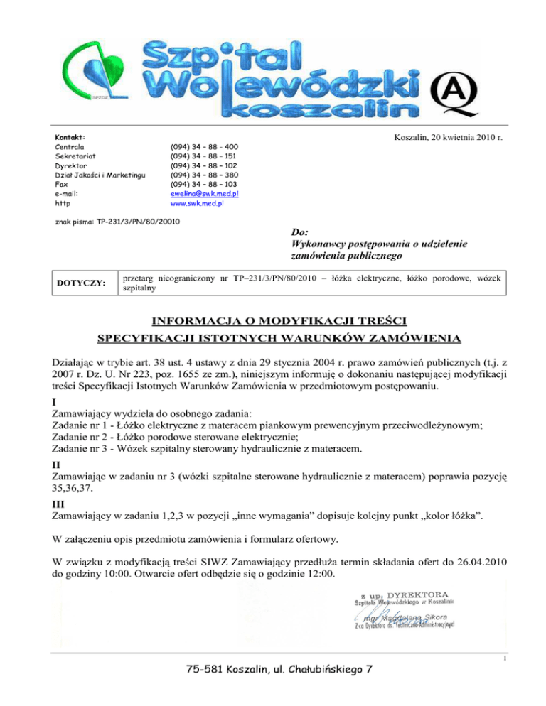 Kontakt: Centrala Sekretariat Dyrektor Dział Jakości i Marketingu Fax e-mail: http Koszalin, 20 kwietnia 2010 r. (094) 34 – 88 - 400 (094) 34 – 88 – 151 (094) 34 – 88 – 102 (094) 34 – 88 – 380 (094) 34 – 88 – 103 [email protected] www.swk.med.pl znak pisma: TP-231/3/PN/80/20010 Do: Wykonawcy postępowania o udzielenie zamówienia publicznego DOTYCZY: przetarg nieograniczony nr TP–231/3/PN/80/2010 – łóŜka elektryczne, łóŜko porodowe, wózek szpitalny INFORMACJA O MODYFIKACJI TREŚCI SPECYFIKACJI ISTOTNYCH WARUNKÓW ZAMÓWIENIA Działając w trybie art. 38 ust. 4 ustawy z dnia 29 stycznia 2004 r. prawo zamówień publicznych (t.j. z 2007 r. Dz. U. Nr 223, poz. 1655 ze zm.), niniejszym informuję o dokonaniu następującej modyfikacji treści Specyfikacji Istotnych Warunków Zamówienia w przedmiotowym postępowaniu. I Zamawiający wydziela do osobnego zadania: Zadanie nr 1 - ŁóŜko elektryczne z materacem piankowym prewencyjnym przeciwodleŜynowym; Zadanie nr 2 - ŁóŜko porodowe sterowane elektrycznie; Zadanie nr 3 - Wózek szpitalny sterowany hydraulicznie z materacem. II Zamawiając w zadaniu nr 3 (wózki szpitalne sterowane hydraulicznie z materacem) poprawia pozycję 35,36,37. III Zamawiający w zadaniu 1,2,3 w pozycji „inne wymagania” dopisuje kolejny punkt „kolor łóŜka”. W załączeniu opis przedmiotu zamówienia i formularz ofertowy. W związku z modyfikacją treści SIWZ Zamawiający przedłuŜa termin składania ofert do 26.04.2010 do godziny 10:00. Otwarcie ofert odbędzie się o godzinie 12:00. 1 75-581 Koszalin, ul. Chałubińskiego 7 ZADANIE NR 1 ŁÓśKO ELEKTRYCZNE Z MATERACEM PIANKOWYM PREWENCYJNYM PRZECIWODLEśYNOWYM Lp. 1 2 3 4 5 6 7 8 9 10 11 12 13 14 15 16 17 18 19 20 Opis przedmiotu zamówienia Długość całkowita bez przedłuŜenia leŜa Długość leŜa pod materac Szerokość leŜa pod materac Szerokość przy całkowicie opuszczonych barierkach Szerokość przy całkowicie podniesionych barierkach Regulacja elektryczna wysokości Wysokość minimalna leŜa mierzona od podłoŜa do górnej płaszczyzny segmentów leŜa bez materaca Wysokość maksymalna leŜa mierzona od podłoŜa do górnej płaszczyzny segmentów leŜa bez materaca Konstrukcja łóŜka wykonana ze stali węglowej lakierowanej proszkowo. LeŜe podzielone na min. 4 segmenty, z czego min. 3 ruchome. Segmenty leŜa wypełnione płytami stalowymi lakierowanymi proszkowo zapewniającymi stabilną podstawę dla materaca oraz bezpieczną resuscytację pacjentki. LeŜe łóŜka wyposaŜone w ogranicznik zlokalizowany w segmencie podudzia zapobiegający zsuwaniu się materaca na szczyt od strony nóg w trakcie unoszenia segmentu oparcia. Elektryczna regulacja segmentu oparcia pleców oraz osobna regulacja oparcia do pozycji krzesła kardiologicznego. Zakres regulacji kąta nachylenia segmentu oparcia pleców w stosunku do poziomu ramy leŜa Elektryczna regulacja segmentu uda Zakres regulacji segmentu uda w stosunku do poziomu ramy leŜa Manualna regulacja segmentu podudziamechanizm zapadkowy ze wspomaganiem spręŜyną min. 3 pozycje do łatwiejszego podniesienia segmentu z nogami pacjentki Zakres regulacji segmentu podudzia w stosunku do poziomu ramy leŜa Elektryczna regulacja pozycji Trendelenburga i anty- Trendelenburga Zakres regulacji pozycji Trendelenburga i anty- Trendelenburga Rama łóŜka wyposaŜona w obustronne wskaźniki kąta nachylenia leŜa z podziałką wyraŜoną w stopniach w zakresie od 0° do 12° osobno do nachylenia Trendelenburga i anty- Trendelenburga Regulacje funkcji sterowanych elektrycznych odbywają się z uŜyciem: - przycisków na panelu centralnym z moŜliwością selektywnej blokady zlokalizowanych pod szczytem łóŜka od strony nóg pacjenta-wszystkie regulacje. - regulacja wysokości kąta nachylenia oparcia, segmentu uda oraz pozycji krzesła kardiologicznego sterowana z paneli wbudowanych w barierki boczne od strony zewnętrznej i wewnętrznej. - moŜliwość elektrycznego ustawienia segmentów leŜa do pozycji krzesła kardiologicznego z wychyleniem do pozycji anty- Trendelenburga, co sprzyja pacjentce w karmieniu i opiece na noworodkiem. - moŜliwość ustawienia segmentów leŜa do Wymóg graniczny/Rozmiar 2250 mm ± 50 mm 2000 mm ± 50 mm 900 mm ± 30 mm Potwierdzenie Producent 900 mm ± 30 mm 1100 mm ± 30 mm TAK 450 mm ± 15 mm 750 mm ± 15 mm TAK TAK TAK min. 0° - 70° TAK min. 0° - 25° TAK min. - 15° - 0° TAK min. - 12° - + 12° TAK TAK 2 75-581 Koszalin, ul. Chałubińskiego 7 pozycji naczyniowej z uniesionymi nogami w sekcji podudzia, co zapewnia rozluźnienie i ulgę u pacjentek w odcinku lędźwiowo-krzyŜowym po przebytych operacjach w obrębie jamy brzusznej i po porodzie. 4 koła o średnicy min. 130 mm z centralną 21 blokadą oraz funkcją jazdy kierunkowej. Funkcja jazdy kierunkowej realizowana poprzez zablokowanie do jazdy na wprost 22 min. jednego koła od strony nóg pacjentki co umoŜliwi przetaczanie łóŜka przez jedną osobę personelu medycznego. Centralny hamulec wszystkich kół 23 umieszczonych od stron szczytu nóg pacjentki Mechaniczna funkcja CPR dostępna z obustronnych dźwigni wyraźnie 24 odróŜniająca się kolorystycznie od innych i oznaczona napisem CPR lub RKO Barierki boczne podwójne, dzielone, poruszające się wraz z segmentami łóŜka, zapewniające ochronę na całej długości leŜa w pozycji leŜącej oraz ochronę w pozycji siedzącej po bokach w trakcie karmienia noworodka przez matkę. Barierki po 25 złoŜeniu chowają się pod leŜe dla zapewnienia łatwego transferu pacjenta zarówno na wózek do transportu w pozycji leŜącej jak i w pozycji siedzącej. Materace styczne są na całej długości po odstawieniu wózka do transportu pacjentki. Konstrukcja barierek bocznych umoŜliwiająca ich składanie rozkładanie przy uŜyciu jednej ręki oraz zabezpiecza 26 pacjentkę przed zaklinowaniem kończyn pod barierkami. Barierki słuŜą dodatkowo jako podparcie prz