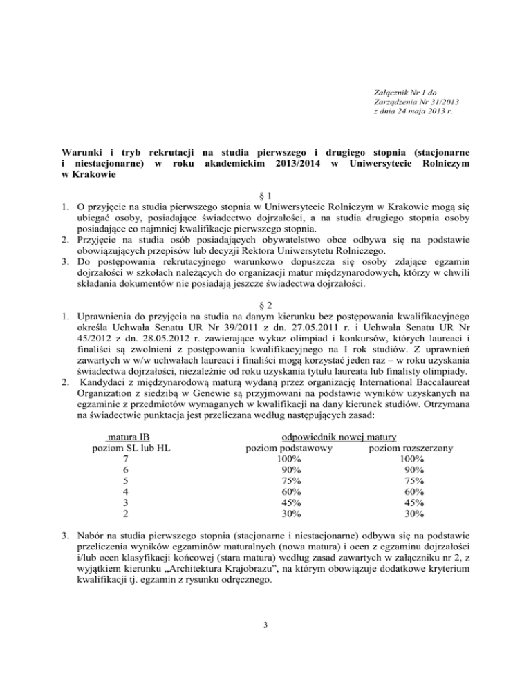 Załącznik Nr 1 do Zarządzenia Nr 31/2013 z dnia 24 maja 2013 r. Warunki i tryb rekrutacji na studia pierwszego i drugiego stopnia (stacjonarne i niestacjonarne) w roku akademickim 2013/2014 w Uniwersytecie Rolniczym w Krakowie §1 1. O przyjęcie na studia pierwszego stopnia w Uniwersytecie Rolniczym w Krakowie mogą się ubiegać osoby, posiadające świadectwo dojrzałości, a na studia drugiego stopnia osoby posiadające co najmniej kwalifikacje pierwszego stopnia. 2. Przyjęcie na studia osób posiadających obywatelstwo obce odbywa się na podstawie obowiązujących przepisów lub decyzji Rektora Uniwersytetu Rolniczego. 3. Do postępowania rekrutacyjnego warunkowo dopuszcza się osoby zdające egzamin dojrzałości w szkołach należących do organizacji matur międzynarodowych, którzy w chwili składania dokumentów nie posiadają jeszcze świadectwa dojrzałości. §2 1. Uprawnienia do przyjęcia na studia na danym kierunku bez postępowania kwalifikacyjnego określa Uchwała Senatu UR Nr 39/2011 z dn. 27.05.2011 r. i Uchwała Senatu UR Nr 45/2012 z dn. 28.05.2012 r. zawierające wykaz olimpiad i konkursów, których laureaci i finaliści są zwolnieni z postępowania kwalifikacyjnego na I rok studiów. Z uprawnień zawartych w w/w uchwałach laureaci i finaliści mogą korzystać jeden raz – w roku uzyskania świadectwa dojrzałości, niezależnie od roku uzyskania tytułu laureata lub finalisty olimpiady. 2. Kandydaci z międzynarodową maturą wydaną przez organizację International Baccalaureat Organization z siedzibą w Genewie są przyjmowani na podstawie wyników uzyskanych na egzaminie z przedmiotów wymaganych w kwalifikacji na dany kierunek studiów. Otrzymana na świadectwie punktacja jest przeliczana według następujących zasad: matura IB poziom SL lub HL 7 6 5 4 3 2 odpowiednik nowej matury poziom podstawowy poziom rozszerzony 100% 100% 90% 90% 75% 75% 60% 60% 45% 45% 30% 30% 3. Nabór na studia pierwszego stopnia (stacjonarne i niestacjonarne) odbywa się na podstawie przeliczenia wyników egzaminów maturalnych (nowa matura) i ocen z egzaminu dojrzałości i/lub ocen klasyfikacji końcowej (stara matura) według zasad zawartych w załączniku nr 2, z wyjątkiem kierunku „Architektura Krajobrazu”, na którym obowiązuje dodatkowe kryterium kwalifikacji tj. egzamin z rysunku odręcznego. 3 4. Nabór na studia drugiego stopnia odbywa się na podstawie rozmowy kwalifikacyjnej i/lub średniej z ocen ze studiów pierwszego stopnia i/lub oceny na dyplomie. §3 1. Limit przyjęć na wszystkie formy studiów określa Senat na wnioski rad wydziałów, na podstawie § 15 pkt. 17 Statutu Uniwersytetu Rolniczego. 2. Senat Uniwersytetu Rolniczego im. Hugona Kołłątaja w Krakowie upoważnia Przewodniczącego Uczelnianej Komisji Rekrutacyjnej do zmiany limitów miejsc, o których mowa w ust. 1 na wniosek przewodniczącego wydziałowej komisji rekrutacyjnej w drodze decyzji. 1. 2. 3. 4. 5. §4 Szczegółowy regulamin postępowania kwalifikacyjnego oraz sposób jego przeprowadzania ustala wydziałowa komisja rekrutacyjna na podstawie zasad zawartych w Uchwale Senatu Nr 45/2012 z dn. 28.05.2012 r., załączniki nr 1, 2, 5. Wydziałowa komisja rekrutacyjna określa kryteria jakie musi spełnić kandydat, aby zostać przyjętym na studia (liczbę punktów i inne) oraz kryteria eliminacji w przypadku, gdy liczba kandydatów, którzy spełnili powyższe wymagania jest większa od limitu przyjęć. Kandydaci na studia, będący osobami niepełnosprawnymi, starający się o przyjęcie na studia w Uniwersytecie Rolniczym na kierunek, na którym obowiązuje egzamin wstępny mogą wystąpić w trybie indywidualnym o przeprowadzenie egzaminu wstępnego w formie dostosowanej do potrzeb wynikających ze stopnia niepełnosprawności kandydata. Decyzje o zmianach w sposobie przeprowadzania egzaminu wstępnego podejmuje przewodniczący wydziałowej komisji rekrutacyjnej. Podstawą decyzji jest przedłożenie aktualnej dokumentacji medycznej potwierdzającej stopień niepełnosprawności kandydata. Wydziałowa komisja rekrutacyjna określa kryteria postępowania rekrutacyjnego oraz zapewnia ich tajność. Przewodniczący wydziałowej komisji rekrutacyjnej organizuje postępowanie rekrutacyjne. §5 1. Rekrutację przeprowadza wydziałowa komisja rekrutacyjna i Uczelniana Komisja Rekrutacyjna. 2. Wydziałowe komisje rekrutacyjne powołują dziekani. 1) W skład komisji wchodzi dziekan (prodziekan), sekretarz oraz inni pracownicy powołani do wykonywania doraźnych zadań. 2) Przedstawiciel wydziałowej rady samorządu studenckiego, wyznaczony imiennie, ma prawo uczestniczyć w pracach komisji w charakterze obserwatora. 3) Dla przeprowadzenia rekrutacji na studia niestacjonarne dziekan może powołać odrębną komisję rekrutacyjną. 4) Sekretarz komisji prowadzi ewidencję kandydatów, sporządza protokoły postępowania kwalifikacyjnego i powiadamia kandydatów o decyzjach komisji rekrutacyjnej. 3. Uczelnianą Komisję Rekrutacyjną powołuje Rektor. 1) W skład komisji wchodzi Prorektor ds. Dydaktycznych i Studenckich i po jednym przedstawicielu nauczycieli akademickich z poszczególnych wydziałów oraz sekretarz. 2) W pracach Komisji uczestniczy przedstawiciel Uczelnianej Rady Samorządu Studentów. 3) Obsługę Uczelnianej Komisji Rekrutacyjnej zapewnia Dział Nauczania. 4 1. 2. 3. 4. §6 Wydziałowa komisja rekrutacyjna podejmuje decyzje w sprawach przyjęcia na studia. Decyzje podpisuje przewodniczący i pozostali członkowie komisji. Od decyzji wydziałowej komisji rekrutacyjnej służy odwołanie do Uczelnianej Komisji Rekrutacyjnej w terminie 14 dni od daty doręczenia decyzji. Uczelniana Komisja Rekrutacyjna rozpatruje odwołania i podejmuje decyzje. Podstawą odwołania może być jedynie naruszenie warunków i trybu rekrutacji na studia. W przypadku rezygnacji kandydata zakwalifikowanego do przyjęcia na studia wydziałowa komisja rekrutacyjna może na zwolnione miejsce pr