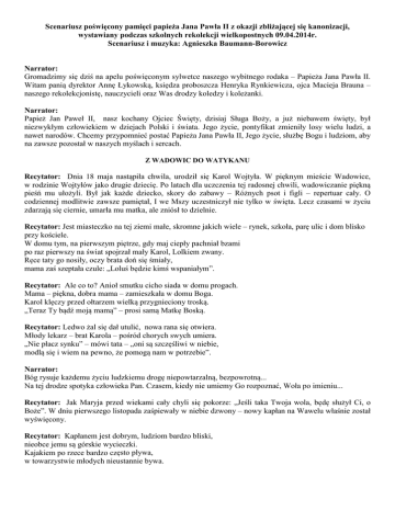 Scenariusz poświęcony pamięci papieża Jana Pawła II z okazji zbliżającej się kanonizacji, wystawiany podczas szkolnych rekolekcji wielkopostnych 09.04.2014r. Scenariusz i muzyka: Agnieszka Baumann-Borowicz Narrator: Gromadzimy się dziś na apelu poświęconym sylwetce naszego wybitnego rodaka – Papieża Jana Pawła II. Witam panią dyrektor Annę Łykowską, księdza proboszcza Henryka Rynkiewicza, ojca Macieja Brauna – naszego rekolekcjonistę, nauczycieli oraz Was drodzy koledzy i koleżanki. Narrator: Papież Jan Paweł II, nasz kochany Ojciec Święty, dzisiaj Sługa Boży, a już niebawem święty, był niezwykłym człowiekiem w dziejach Polski i świata. Jego życie, pontyfikat zmieniły losy wielu ludzi, a nawet narodów. Chcemy przypomnieć postać Papieża Jana Pawła II, Jego życie, służbę Bogu i ludziom, aby na zawsze pozostał w naszych myślach i sercach. Z WADOWIC DO WATYKANU Recytator: Dnia 18 maja nastąpiła chwila, urodził się Karol Wojtyła. W pięknym mieście Wadowice, w rodzinie Wojtyłów jako drugie dziecię. Po latach dla uczczenia tej radosnej chwili, wadowiczanie piękną pieśń mu ułożyli. Był jak każde dziecko, skory do zabawy – Różnych psot i figli – repertuar cały. O codziennej modlitwie zawsze pamiętał, I we Mszy uczestniczył nie tylko w święta. Lecz czasami w życiu zdarzają się ciernie, umarła mu matka, ale zniósł to dzielnie. Recytator: Jest miasteczko na tej ziemi małe, skromne jakich wiele – rynek, szkoła, parę ulic i dom blisko przy kościele. W domu tym, na pierwszym piętrze, gdy maj ciepły pachniał bzami po raz pierwszy na świat spojrzał mały Karol, Lolkiem zwany. Ręce taty go nosiły, oczy brata doń się śmiały, mama zaś szeptała czule: „Loluś będzie kimś wspaniałym”. Recytator: Ale co to? Anioł smutku cicho siada w domu progach. Mama – piękna, dobra mama – zamieszkała w domu Boga. Karol klęczy przed ołtarzem wielką przygnieciony troską. „Teraz Ty bądź moją mamą” – prosi samą Matkę Boską. Recytator: Ledwo żal się dał utulić, nowa rana się otwiera. Młody lekarz – brat Karola – pośród chorych swych umiera. „Nie płacz synku” – mówi tata – „oni są szczęśliwi w niebie, modlą się i wiem na pewno, że pomogą nam w potrzebie”. Narrator: Bóg rysuje każdemu życiu ludzkiemu drogę niepowtarzalną, bezpowrotną... Na tej drodze spotyka człowieka Pan. Czasem, kiedy nie umiemy Go rozpoznać, Woła po imieniu... Recytator: Jak Maryja przed wiekami cały chyli się pokorze: „Jeśli taka Twoja wola, będę służył Ci, o Boże”. W dniu pierwszego listopada zaśpiewały w niebie dzwony – nowy kapłan na Wawelu właśnie został wyświęcony. Recytator: Kapłanem jest dobrym, ludziom bardzo bliski, nieobce jemu są górskie wycieczki. Kajakiem po rzece bardzo często pływa, w towarzystwie młodych nieustannie bywa. Recytator: Wśród studentów ma przyjaciół, co go Wujkiem nazywają. Razem modlą się i bawią, jeżdżą w góry i pływają. Właśnie bawią na Mazurach, gdy po falach wieść przypływa: „Ksiądz kardynał bardzo pilnie do siedziby swej przyzywa”. Recytator: Próżno opuszczony kajak pasażera wypatruje. Już się chyba nie doczeka, bo biskupem został Wujek. U Kościoła stanął sterów i choć fale wielkie były, choć się burze przetaczały – łódki mu nie zatopiły. Recytator: Dwóch żeglarzy żeglowało, w obu wielka była siła. Pierwszy z nich zwał się Wyszyński, drugi z nich zwał się Wojtyła. Wkrótce obaj wyruszają, aby wraz z kardynałami wybrać w Rzymie na konklawe pasterza nad pasterzami. Kółko muzyczne: Moje miasto Wadowice – podkład nr ………… POLAK PAPIEŻEM Narrator: Dnia 16 października 1978 r. zrywając z ponad 450-letnią tradycją kardynałowie zgromadzeni na konklawe wybrali na biskupa Rzymu człowieka nie będącego Włochem. Nowym papieżem został Polak – Karol Józef Wojtyła, który obrał imię Jan Paweł II. Narrator: Jan Paweł II, który od tej pory przestał być metropolitą krakowskim ukazał się na balkonie bazyliki Piotrowej, uśmiechał przyjaźnie i mówił, że przybywa z dalekiego kraju. Ludzie wyczuwali, że przemawia papież gotowy do podboju świata. Recytator: Długie były to obrady, a gdy dym popłynął biały, niecierpliwie tłumy wiernych ze zdumienia oniemiały. Stał przed nami papież – Polak, przybysz z kraju dalekiego. A w tym kraju wszyscy ludzie już modlili się za niego. Recytator: Czy nie żal ci stoków Wawelu? Podhala, co we mgle ginie? Nad Tybrem zapyta cię wielu jak Piotra: Quo vadis, Domine? Odpowiesz, jak król nasz spod Wiednia, Idę kruszyć krzywd okowy Spełnia się Piastów przepowiednia, o triumfie z Częstochowy. Tyś uwieńczeniem naszych marzeń jakie twa biała postać budzi W potoku coraz nowych zdarzeń jesteś nadzieją wszystkich ludzi. PAPIEŻ – PATRIOTA Narrator: Bardzo aktywnie rozpoczął Jan Paweł II swoje posłanie w Rzymie. I chociaż miejsce to jest bardzo piękne tęsknił za Polską. W pamięci miał ukochane Tatry, jeziora, łąki pokryte kwiatami, kościoły w których od dziecka wielbił Chrystusa i Jego Matkę, kolegów i młodzież, których zostawił w Polsce. Pewnie nieraz zdarzyło się papieżowi na wzór Adama Mickiewicza powiedzieć: „Polsko! Ojczyzno moja! Ty jesteś jak zdrowie; ile Cię trzeba cenić, ten tylko się dowie, kto cię stracił. Narrator: Jan Paweł II był wielkim patriotą. Każdego dnia modlił się za Polskę, bo była ona dla niego jak matka. Swoją Ojczyznę, rodaków, ukochaną młodzież, góry odwiedził 8 razy. Zawsze pamiętał, że jest Polakiem i był z tego dumny. Narrator: Mówiła nam nieraz, iż: „Wypełnieniem przykazania miłości jest miłość Ojczyzny. Ojczyzna jest domem ,którego trzeba bronić i o który trzeba dbać. Dlatego nie powinien człowiek wstydzić się wzruszenia, gdy mówi, czy czyta piękne utwory poświęcone Ojczyźnie. B