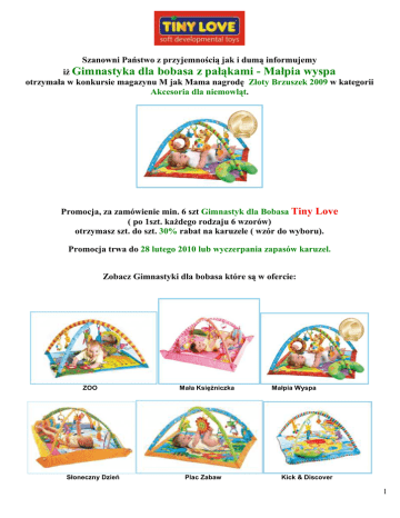 Szanowni Państwo z przyjemnością jak i dumą informujemy iŜ Gimnastyka dla bobasa z pałąkami - Małpia wyspa otrzymała w konkursie magazynu M jak Mama nagrodę Złoty Brzuszek 2009 w kategorii Akcesoria dla niemowląt. Promocja, za zamówienie min. 6 szt Gimnastyk dla Bobasa Tiny Love ( po 1szt. kaŜdego rodzaju 6 wzorów) otrzymasz szt. do szt. 30% rabat na karuzele ( wzór do wyboru). Promocja trwa do 28 lutego 2010 lub wyczerpania zapasów karuzel. Zobacz Gimnastyki dla bobasa które są w ofercie: ZOO Słoneczny Dzień Mała KsięŜniczka Plac Zabaw Małpia Wyspa Kick & Discover 1 Zapoznaj się z karuzelami: Klasyczna Mała KsięŜniczka Serenada Natury Wyspa Marzeń Zamówienia moŜna składać przez moduł dla partnerów handlowych . Zaloguj się do modułu dla partnerów handlowych aby dokonać zamówienia. Jednocześnie informujemy, iŜ po zalogowaniu do modułu dla partnerów moŜna pobierać aktualne cenniki handlowe juŜ razem ze zdjęciami. FIRMA MARKO ZE WZGLĘDU NA ZMIENIAJĄCE SIĘ KURSY WALUT, ZASTRZEGA SOBIE PRAWO DO ZMIANY CEN PO KAśDEJ NOWEJ DOSTAWIE. SERDECZNIE ZAPRASZAMY DO ZAKUPÓW !!! W dalszym ciągu zamówienia moŜna składać emailem [email protected], faxem (0-32) 453-01-72 lub telefonicznie tel. 032 455 55 25 , 032455 3029, 032453 01 71 wew.60,61,62,64,65,67,68 W przypadku konieczności uzyskania dalszych informacji prosimy o kontakt z panią Beatą Musz wew. 65 e-mail: [email protected] Zachęcamy do zakupów J. Musioł i R. Marszolik 2