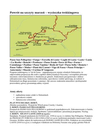 Powrót na szczyty marzeń – wycieczka trekkingowa Passo San Pellegrino • Fango • Forcella di Lusia • Laghi di Lusia • Laste • Lusia • La Rezila • Ronchi • Predazzo • Passo Feudo •Torre di Pisa • Forno • Costalunga • Paolina • Passo Vajolon • Roda di Vael • Passo Sella • Demetz • Passo Valles • Mulaz • Piani dei Casoni • Vigo di Fassa • Passo Principe • Antermoia • Mazzin • Cortina D’Ampezzo Program trekkingowy w Val di Fassa – najpiękniejszym rejonie włoskich Dolomitów, to odpowiednia propozycja dla osób o ogólnie dobrej kondycji fizycznej i szczególnie polecany turystom z doświadczeniem w chodzeniu po górach. Znakomicie przygotowane i dobrze zabezpieczone trasy, fantastyczne schroniska, zjawiskowe widoki sprawiają, że tydzień w Dolomitach na długo pozostanie w pamięci. Jak zawsze znakomita atmosfera i profesjonalni przewodnicy górscy gwarantują udany wyjazd. Atuty oferty • najbardziej znane szlaki w Dolomitach • zjawiskowe widoki • fantastyczne schroniska PLAN WYCIECZKI1. DZIEŃ. Zbiórka uczestników. Wyjazd do Włoch przez Czechy i Austrię. 2. DZIEŃ. PASSO SAN PELLEGRINO Przejazd do PASSO SAN PELLEGRINO w godzinach popołudniowych. Zakwaterowanie w hotelu. Spacer po miejscowości, kolacja. Spotkanie z przewodnikiem i prezentacja programu. Nocleg. 3. DZIEŃ. SZCZYT LASTE (2410 m n.p.m.) Śniadanie. Przejazd autokarem do FANGO (ok. 1550 m n.p.m.) w dolinie San Pellegrino. Podejście do PRZEŁĘCZY FORCELLA DI LUSIA (2363 m n.p.m.) położonej pomiędzy masywami Laste i Gronton. Krótkie zejście do malowniczych JEZIOR LAGHI DI LUSIA. Podejście na wierzchołek LASTE (2410 m n.p.m.) z rozległym widokiem na Dolomity Fassane oraz grupy górskie Pala di San Martino i Latemar. Zejście do SCHRONISKA LUSIA (2055 m n.p.m.) i dalej drogą do SCHRONISKA LA REZILA i do RONCHI. Powrót autokarem do hotelu. Kolacja, nocleg. Czas trekkingu: ok. 6 godz., podejścia: ok. 800 m, zejścia: ok. 1000 m. 4. DZIEŃ. SCHRONISKO TORRE DI PISA – DOLINA VALLE SORDA Śniadanie. Przejazd autokarem do PREDAZZO, położonego w dolinie Val di Fiemme. Wjazd kolejkami krzesełkowymi na PASSO FEUDO (2200 m n.p.m.). Przejście przez hale z zielonymi łąkami, a następnie przez skalisty teren do SCHRONISKA TORRE DI PISA (2671 m n.p.m.), obok którego znajduje się słynna iglica skalna w kształcie Krzywej Wieży w Pizie. Zejście do biwaku Latemar Sieff, a następnie szlakiem z ubezpieczeniami (typu ferrata) do doliny Valle Sorda i dalej do miejscowości FORNO. Powrót autokarem do hotelu. Kolacja, nocleg. Czas trekkingu: ok. 7 godz., podejścia: ok. 500 m, zejścia: ok. 1500 m. 5. DZIEŃ. PRZEŁĘCZ PASSO VAJOLON (2560 m n.p.m.) Śniadanie. Przejazd autokarem na PRZEŁĘCZ COSTALUNGA do kolejki Paolina. Wjazd kolejką do SCHRONISKA PAOLINA (2127 m n.p.m.), następnie podejście na PRZEŁĘCZ PASSO VAJOLON (2560 m n.p.m.) pod skalnymi urwiskami słynnej ściany Roda di Vael. Ostatni fragment podejścia na przełęcz prowadzi żlebem i eksponowaną drabinką. Z przełęczy roztaczają się piękne widoki na masywy Catinaccio, Sassolungo i Marmolada. Zejście do SCHRONISKA RODA DI VAEL (2280 m n.p.m.) i na przełęcz Costalunga. Fakultatywnie (za dodatkową opłatą na miejscu): przejście via ferrata Roda di Vael. Ferrata średnio łatwa, czas przejścia tam i z powrotem ok. 2,5 godz., 350 m przewyższenia w górę i 350 m w dół. Z przełęczy Passo Vajolon, zamiast zejścia bezpośrednio na dół do schroniska, wyjście ferratą na wierzchołek Roda di Vael (2806 m n.p.m.) i powrót na przełęcz tą samą drogą. Spotkanie z resztą grupy w schronisku Roda di Vael. Powrót autokarem do hotelu. Kolacja, nocleg. Czas trekkingu: ok. 5 godz., podejścia: ok. 450 m, zejścia ok. 820 m. 6. DZIEŃ. SCHRONISKO VICENZA (2253 m n.p.m.) Śniadanie. Przejazd autokarem na PRZEŁĘCZ PASSO SELLA (2240 m n.p.m.). Wjazd kolejką górską do SCHRONISKA DEMETZ, położonego na przełęczy Forcella del Sassolungo (2681 m n.p.m.). Zejście do schroniska Vicenza (2253 m n.p.m.), położonego pośród skalnych ścian, w samym sercu masywu Sassolungo. Następnie trawersem w równym terenie u podnóża szczytów Sassopiatto, Il Dente, Cima Inkofler i Gromman dojście do schroniska Pertini i Fredrich August. Zejście do przełęczy Passo Sella. Powrót autokarem do hotelu. Kolacja, nocleg. Czas trekkingu: ok. 5 godz., podejścia: ok. 50 m, zejścia: ok. 450 m. 7. DZIEŃ. SZCZYT MULAZ (2906 m n.p.m.) Śniadanie. Przejazd autokarem na PRZEŁĘCZ PASSO VALLES (2031 m n.p.m.) w masywie Pala di San Martino, jednego z najdzikszych zakątków Dolomitów. Podejście do schroniska Volpi al Mulaz (2560 m n.p.m.), położonego u stóp szczytów Focobon, Frangole i Mulaz. Przerwa na indywidualny posiłek i odpoczynek w schronisku. Przy dobrych warunkach pogodowych dla chętnych wejście na wierzchołek MULAZ (2906 m n.p.m.), a następnie zejście tą samą drogą do schroniska. Zejście grupy doliną Valle Venegia do PIANI DEI CASONI. Przejazd autokarem do hotelu. Kolacja, nocleg. Czas trekkingu: ok. 7-8 godz., podejścia: ok. 660 m, zejścia: ok. 1000 m. 8. DZIEŃ. VAL DI FASSA Śniadanie. Przejazd autokarem do VIGO DI FASSA (1517 m n.p.m.). Przejazd kolejką linową do schroniska Ciampedie (1997 m n.p.m). Przejście do schroniska Gardeccia (1950 m n.p.m.) i dalej do schroniska Vajolet (2243 m n.p.m.) położonego u stóp strzelistych Torii Vajolet. Następnie przejście przez PRZEŁĘCZ PASSO PRINCIPE (2599 m n.p.m.) oraz PRZEŁĘCZ ANTERMOIA (2770 m n.p.m.) w sąsiedztwie najwyższego szczytu w Catinacio – Antermoia (3004 m n.p.m.). Kolejno zejście do schroniska Antermoia (2497 m n.p.m.), położonego nieopodal pięknego jeziora o tej samej nazwie, jedynego większego jeziora grupy Catinaccio niewysychającego w czasie lata. Następnie zejście doliną Val de Udai do miasteczka MAZZIN (1370 m n.p.m.). Powrót autokarem do hotelu. Kolacja pożegnalna i projekcja sla