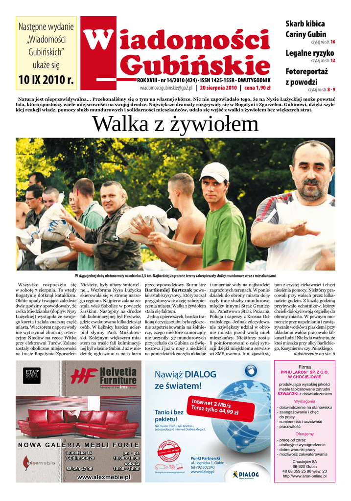 Następne wydanie „Wiadomości Gubińskich” ukaże się Skarb kibica Cariny Gubin W iadomości __Gubińskie 10 IX 2010 r. . . czytaj na str. 16 Legalne ryzyko czytaj na str. 12 Fotoreportaż z powodzi . ROK XVIII nr 14/2010 (424) ISSN 1425-1558 DWUTYGODNIK [email protected] | 20 sierpnia 2010 | cena 1,90 zł czytaj na str. 8 - 9 Natura jest nieprzewidywalna... Przekonaliśmy się o tym na własnej skórze. Nic nie zapowiadało tego, że na Nysie Łużyckiej może powstać fala, która spustoszy wiele miejscowości na swojej drodze. Największe dramaty rozgrywały się w Bogatyni i Zgorzelcu. Gubinowi, dzięki szybkiej reakcji władz, pomocy służb mundurowych i solidarności mieszkańców, udało się wyjść z walki z żywiołem bez większych strat. Walka z żywiołem W ciągu jednej doby ułożono wały na odcinku 2,5 km. Najbardziej zagrożone tereny zabezpieczały służby mundurowe wraz z mieszkańcami Wszystko rozpoczęło się w sobotę 7 sierpnia. To wtedy Bogatynię dotknął kataklizm. Obfite opady trwające zaledwie dwie godziny spowodowały, że rzeka Miedzianka (dopływ Nysy Łużyckiej) wystąpiła ze swojego koryta i zalała znaczną część miasta. Wieczorem naporu wody nie wytrzymał zbiornik retencyjny Niedów na rzece Witka przy elektrowni Turów. Zalane zostały okoliczne miejscowości na trasie Bogatynia-Zgorzelec. Niestety, były ofiary śmiertelne... Wezbrana Nysa Łużycka skierowała się w stronę naszego regionu. Najpierw zalana została wieś Sobolice w powiecie żarskim. Następny na drodze fali kulminacyjnej był Przewóz, gdzie ewakuowano kilkadziesiąt osób. W Łęknicy bardzo ucierpiał słynny Park Mużakowski. Kolejnym większym miastem na trasie fali kulminacyjnej był właśnie Gubin. Już w niedzielę ogłoszono u nas alarm przeciwpowodziowy. Burmistrz Bartłomiej Bartczak powołał sztab kryzysowy, który zaczął przygotowywać akcję zabezpieczenia miasta. Walka z żywiołem stała się faktem. Jedną z pierwszych, bardzo trafioną decyzją sztabu było zgłoszenie zapotrzebowania na żołnierzy, czego niektóre samorządy nie uczyniły. 37 mundurowych przyjechało do Gubina ze Świętoszowa i już w nocy z niedzieli na poniedziałek zaczęło układać i umacniać wały na najbardziej zagrożonych terenach. W poniedziałek do obrony miasta dołączyły inne służby mundurowe, między innymi Straż Graniczna, Państwowa Straż Pożarna, Policja i saperzy z Krosna Odrzańskiego. Jednak zdecydowanie największy udział w obronie miasta przed wodą mieli mieszkańcy. Niektórzy zostali poinformowani o całej sytuacji dzięki miejskiemu serwisowi SMS-owemu. Inni zjawili się Firma Nawiąż DIALOG ze światem! atem! Tanio i bez pakietu! Internet 2 Teraz tylko Mb/s 44,99 Nie musisz mieć u nas telefonu, żeby podłączyć Internet DialNet Mega 2. tam z czystej ciekawości i chęci niesienia pomocy. Niektórzy pracowali przy wałach przez kilkanaście godzin. Z każdą godziną przybywało ochotników, którzy chcieli dołożyć swoją cegiełkę do obrony miasta. W pewnym momencie przy napełnianiu i zawiązywaniu worków z piaskiem i przy układaniu wałów pracowało kilkuset ludzi! Nie było ważne to, że ktoś mieszka przy ulicy Barlickiego, Kosynierów czy Pułaskiego. dokończenie na str. 6 PPHU „ARON” SP. Z O.O. W CHOCIEJOWIE produkująca wysokiej jakości meble tapicerowane zatrudni SZWACZKI z doświadczeniem Wymagania zł - doświadczenie na stanowisku - zaangażowanie i chęć do pracy - sumienność i uczciwość - pracowitość Oferujemy N o wa g a l e r i a m e b l i f o r t e Lubelska 14 Gubin 66-620 68 359 47 06 pn. - pt. 10.00 - 18.00 sobota 10.00 - 14.00 www.alexmeble.pl Szczegóły na www.wygrajauto.pl Punkt Partnerski ul. Legnicka 1, Gubin tel 792 502240 www.dialog.pl - pracę od zaraz - atrakcyjne wynagrodzenie - dobre warunki pracy - możliwość zakwaterowania Chociejów 8A 66-620 Gubin 48 68 359 25 98 wew. 23 http://www.aron-online.pl 2 W iadomości __Gubińskie Urodzenia | Sandra Pawęzka, Antoni Wojtczak, Hanna Kluge, Marcin Laskowski, Julita Wójcik, Hubert Janowiak, Szymon Jaworski, Weronika Petynka, Hanna Macewicz, Bartosz Chojnacki, Michalina Sikora, Aleksander Siwik. Zgony | Józef Jesionowski l. 90, Zenon Wojciul l. 50, Franciszek Ostapkowicz l. 84, Dariusz Boguski l. 31, Anna Morgas l. 71.n Sprawna i owocna 6 sierpnia bardzo wcześnie, bo o godz. 9.00 zwołano posiedzenie Rady Miejskiej. Radni byli wypoczęci, tryskający zdrowiem i humorem, co w czasie przywitania zauważył przewodniczący Leszek Ochotny. Serdecznym i rzeczowym wystąpieniem w trosce o miasto rozpoczęła Danuta Andrzejewska, na temat ulicy Złotej mówiła Halina Wojnicz. Pełen zachwytów nad odremontowanym budynkiem Urzędu Miejskiego wiceprzewodniczący Zygfryd Gwizdalski wyraził uznanie dla burmistrza Bartłomieja Bartczaka. Odnowienie siedziby władz miasta Pan Gwizdalski uznał za spełnienie jego niemal dwudziestoletnich marzeń. Zachwycając się wyglądem, ale i funkcjonalnością Wyspy Teatralnej Z. Gwizdalski zaproponował, by każdy radny na koniec kadencji posadził na wyspie drzewko. Zarówno burmistrz, jak i radni przyjęli tę propozycję z aprobatą. Burmistrz Bartczak poinformował, że na wyspie nie ukończono planowanych nasadzeń, co daje szansę radnym do realizacji zgłoszonego wniosku. Wniosek radnego Jana Skóry o przeniesienie radaru z ulicy Kresowej w inne miejsce również wzbudził żywe zainteresowanie. Marcin Sikora proponował umieszczenie radaru przy ulicy Kosynierów, by w ten sposób zapobiec brawurowej jeździe motocyklistów. Przewodniczący Komisji Porządku Publicznego Andrzej Białek objaśnił, że radar jest w remoncie, a zmianę jego lokalizacji może zarządzić tylko komendant powiatowy Policji. W sprawach różnych radny Waldemar Kowal zapytał burmistrza, czy są jakieś roszczenia obywateli innych państw do nieruchomości w mieście. Burmistrz objaśnił, że aktualnie nie ma żadnego taki
