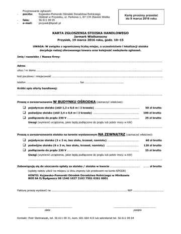 - Przyjmowanie zgłoszeń: poczta: Kujawsko-Pomorski Ośrodek Doradztwa Rolniczego Oddział w Przysieku, ul. Parkowa 1, 87-134 Zławieś Wielka faks: 56 611 09 05 e-mail: [email protected] Kartę prosimy przesłać do 9 marca 2016 roku KARTA ZGŁOSZENIA STOISKA HANDLOWEGO Jarmark Wielkanocny Przysiek, 19 marca 2016 roku, godz. 10–15 UWAGA: W związku z ograniczoną liczbą miejsc, o uczestnictwie i lokalizacji stoiska decyduje rodzaj oferowanego towaru oraz kolejność nadsyłania zgłoszeń. Imię i nazwisko / Nazwa firmy: ............................................................................................................................................................................... Adres: ulica / nr domu ........................................................................................................................................................ kod pocztowy i miejscowość ...................................................................................................................................... telefon ................................................................ fax ............................................... Krótki opis oferty handlowej: ............................................................................................................................................................................... Proszę o zarezerwowanie W BUDYNKU OŚRODKA (zaznaczyć właściwe): pojedyncze stoisko (stół 1,2 x 0,6 m i 2 krzesła) ...................................................... 50 zł brutto podwójne stoisko (stół 2,4 x 0,6 m i 2 krzesła) ....................................................... 100 zł brutto podłączenie do prądu 230 V ....................................................................................... 25 zł brutto Uwagi (wymienić urządzenia, jakie będą podłączone do prądu lub pobór mocy w kW) .................................................................................................................................................................. Proszę o zarezerwowanie stoiska na terenie wystawowym NA ZEWNĄTRZ (zaznaczyć właściwe): pojedyncze stoisko (3 x 3 m, bez stołu, krzeseł, namiotu) ...................................... 60 zł brutto podwójne stoisko (6 x 3 m, bez stołu, krzeseł, namiotu) ....................................... 120 zł brutto podłączenie do prądu 230 V ....................................................................................... 25 zł brutto Uwagi (wymienić urządzenia, jakie będą podłączone do prądu lub pobór mocy w kW) .................................................................................................................................................................. Zobowiązuję się do uiszczenia opłaty za stoisko / stoiska w kwocie .................................... ....... zł brutto (opłatę należy uiścić na miejscu w dniu imprezy lub przelewem na konto KPODR) KONTO: Kujawsko-Pomorski Ośrodek Doradztwa Rolniczego w Minikowie BOŚ SA O/Bydgoszcz 98 1540 1027 2102 7501 6261 0001 Fakturę proszę wystawić na ........................................................................................... NIP ..................................... ..................................................... data .................................................. podpis Kontakt: Piotr Stelmaszak, tel. 56 611 09 31, kom. 601 664 415 lub sekretariat tel. 56 611 09 04