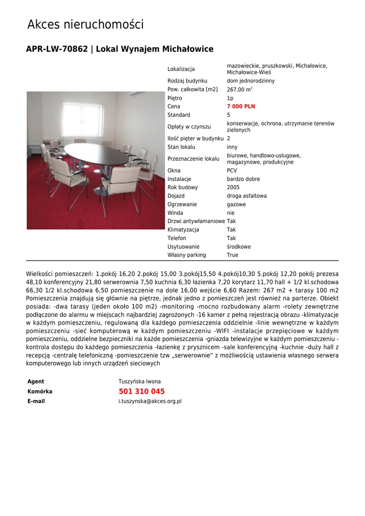 Akces nieruchomości APR-LW-70862 | Lokal Wynajem Michałowice Lokalizacja mazowieckie, pruszkowski, Michałowice, Michałowice-Wieś Rodzaj budynku dom jednorodzinny Pow. całkowita [m2] 267,00 m2 Piętro 1p Cena 7 000 PLN Standard 5 Opłaty w czynszu konserwacje, ochrona, utrzymanie terenów zielonych Ilość pięter w budynku 2 Stan lokalu inny Przeznaczenie lokalu biurowe, handlowo-usługowe, magazynowe, produkcyjne Okna PCV Instalacje bardzo dobre Rok budowy 2005 Dojazd droga asfaltowa Ogrzewanie gazowe Winda nie Drzwi antywłamaniowe Tak Klimatyzacja Tak Telefon Tak Usytuowanie środkowe Własny parking True Wielkości pomieszczeń: 1.pokój 16,20 2.pokój 15,00 3.pokój15,50 4.pokój10,30 5.pokój 12,20 pokój prezesa 48,10 konferencyjny 21,80 serwerownia 7,50 kuchnia 6,30 łazienka 7,20 korytarz 11,70 hall + 1/2 kl.schodowa 66,30 1/2 kl.schodowa 6,50 pomieszczenie na dole 16,00 wejście 6,60 Razem: 267 m2 + tarasy 100 m2 Pomieszczenia znajdują się głównie na piętrze, jednak jedno z pomieszczeń jest również na parterze. Obiekt posiada: -dwa tarasy (jeden około 100 m2) -monitoring -mocno rozbudowany alarm -rolety zewnętrzne podłączone do alarmu w miejscach najbardziej zagrożonych -16 kamer z pełną rejestracją obrazu -klimatyzacje w każdym pomieszczeniu, regulowaną dla każdego pomieszczenia oddzielnie -linie wewnętrzne w każdym pomieszczeniu -sieć komputerową w każdym pomieszczeniu -WIFI -instalacje przepięciowe w każdym pomieszczeniu, oddzielne bezpieczniki na każde pomieszczenia -gniazda telewizyjne w każdym pomieszczeniu kontrola dostępu do każdego pomieszczenia -łazienkę z prysznicem -sale konferencyjną -kuchnie -duży hall z recepcją -centralę telefoniczną -pomieszczenie tzw „serwerownie” z możliwością ustawienia własnego serwera komputerowego lub innych urządzeń sieciowych Agent Tuszyńska Iwona Komórka 501 310 045 E-mail [email protected]