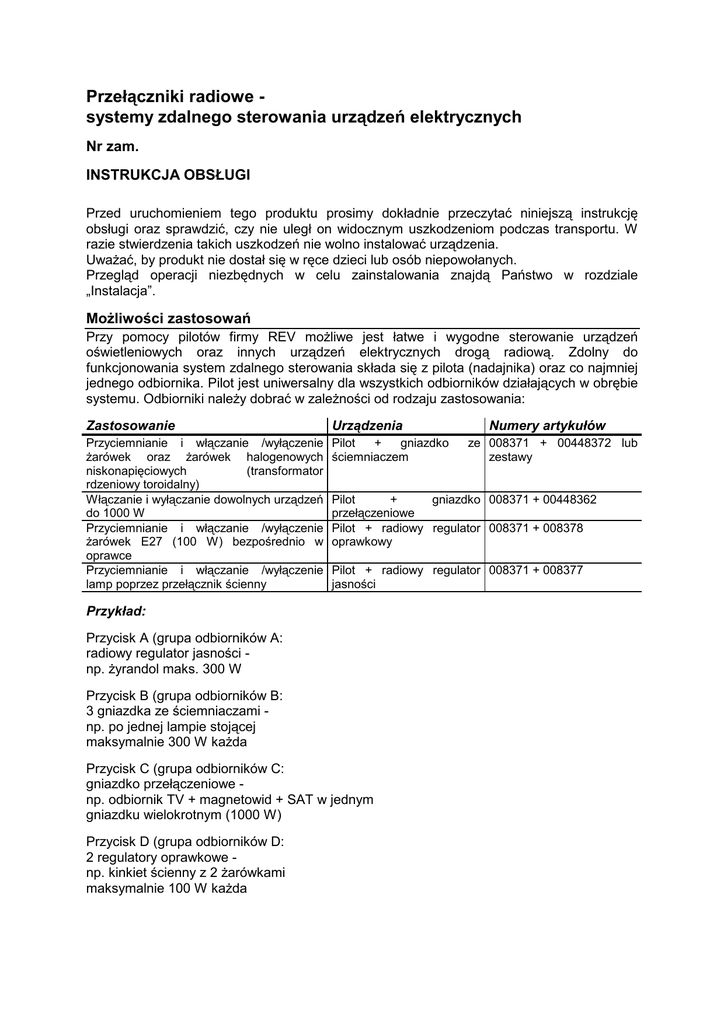 Przełączniki radiowe systemy zdalnego sterowania urządzeń elektrycznych Nr zam. INSTRUKCJA OBSŁUGI Przed uruchomieniem tego produktu prosimy dokładnie przeczytać niniejszą instrukcję obsługi oraz sprawdzić, czy nie uległ on widocznym uszkodzeniom podczas transportu. W razie stwierdzenia takich uszkodzeń nie wolno instalować urządzenia. Uważać, by produkt nie dostał się w ręce dzieci lub osób niepowołanych. Przegląd operacji niezbędnych w celu zainstalowania znajdą Państwo w rozdziale „Instalacja”. Możliwości zastosowań Przy pomocy pilotów firmy REV możliwe jest łatwe i wygodne sterowanie urządzeń oświetleniowych oraz innych urządzeń elektrycznych drogą radiową. Zdolny do funkcjonowania system zdalnego sterowania składa się z pilota (nadajnika) oraz co najmniej jednego odbiornika. Pilot jest uniwersalny dla wszystkich odbiorników działających w obrębie systemu. Odbiorniki należy dobrać w zależności od rodzaju zastosowania: Zastosowanie Urządzenia Przyciemnianie i włączanie /wyłączenie żarówek oraz żarówek halogenowych niskonapięciowych (transformator rdzeniowy toroidalny) Włączanie i wyłączanie dowolnych urządzeń do 1000 W Przyciemnianie i włączanie /wyłączenie żarówek E27 (100 W) bezpośrednio w oprawce Przyciemnianie i włączanie /wyłączenie lamp poprzez przełącznik ścienny Pilot + gniazdko ściemniaczem Pilot + gniazdko 008371 + 00448362 przełączeniowe Pilot + radiowy regulator 008371 + 008378 oprawkowy Pilot + radiowy regulator 008371 + 008377 jasności Przykład: Przycisk A (grupa odbiorników A: radiowy regulator jasności np. żyrandol maks. 300 W Przycisk B (grupa odbiorników B: 3 gniazdka ze ściemniaczami np. po jednej lampie stojącej maksymalnie 300 W każda Przycisk C (grupa odbiorników C: gniazdko przełączeniowe np. odbiornik TV + magnetowid + SAT w jednym gniazdku wielokrotnym (1000 W) Przycisk D (grupa odbiorników D: 2 regulatory oprawkowe np. kinkiet ścienny z 2 żarówkami maksymalnie 100 W każda Numery artykułów ze 008371 + 00448372 lub zestawy Przedstawiono tu 4 grupy przełączników sterowane jednym pilotem. Urządzenia podlegające jednej grupie odbiorników są włączane lub wyłączane jednocześnie. Ustawienia Przed uruchomieniem konieczne jest przeprowadzenie następujących ustawień: • kanału radiowego pilota • kanału radiowego oraz przyporządkowania przycisków (wykonywanego w obrębie odbiornika) • Zainstalowanie baterii Ustawienie kanału radiowego pilota: Wyciągnąć osłonę klawiatury Ustawić położenie podstawowe: przełącznik 1 „ON” przełączniki 2-6 „OFF” Ustawienie kanału radiowego oraz (wykonywane w obrębie odbiornika): przyporządkowanie przycisków ⇒ Gniazdko przełączeniowe ⇒ Gniazdko ze ściemniaczem Kanał: Przekręcić odbiornik 1-Usunąć śrubę 2-Odkręcić pokrywę Kanał: Przycisk: Przycisk: Ustawić położenie podstawowe: Przełącznik 1 „ON” Przełączniki 2-6 „OFF” Przełącznik 7 (A) „ON” Przełączniki 8-10 (B-D) „OFF” ⇒ Radiowy regulator oprawkowy Kanał: Przekręcić odbiornik 1-Usunąć śrubę 2-Usnąć pokrywę Kanał: Przycisk: Przycisk: Ustawić położenie podstawowe: Przełącznik 1 „ON” Przełączniki 2-6 „OFF” Przełącznik 7 (A) „ON” Przełączniki 8-10 (B-D) „OFF” ⇒ Radiowy regulator jasności Kanał: Przekręcić regulator jasności Przełączniki DIP stają się widoczne Kanał: Przycisk: Przycisk: Ustawić położenie podstawowe: Przełącznik 1 „ON” Przełączniki 2-6 „OFF” Przełącznik 7 (A) „ON” Przełączniki 8-10 (B-D) „OFF” Wskazówka dot. ustawienia podstawowego: Opisane ustawienia podstawowe obowiązują dla pojedynczego systemu, przy czym wszystkie odbiorniki przełączane są poprzez przycisk A. O ile jest to zgodne z Państwa preferencjami, wraz z ustawieniem podanego położenia podstawowego zrealizowane zostały już wszystkie konieczne ustawienia. Przydzielenie odbiornika do przycisku pilota: Przyporządkowanie odbiorników przyciskom pilota następuje poprzez ustawienie litery przycisku w przełączniku kodowym odbiornika: Przycisk A Przycisk B Przycisk C Przycisk D Przełączniki 7 - 10 odpowiadają przyciskom A - D. Każdy z odbiorników może zostać przydzielony tylko do jednego przycisku. Tylko jeden z przełączników (A-D) może być ustawiony w pozycji „ON” (włączenia). Nie wolno zmieniać położenia przełączników 1 - 6. Wskazówka dot. ustawienia kanału: Jeżeli stosowany jest tylko jeden system złożony z jednego pilota i dowolnej ilości odbiorników, ustawienie podstawowe kanału pozostaje niezmienione. O ile te same nadajniki mają być sterowane dodatkowym pilotem, należy również zachować ustawienie podstawowe tego pilota. Zmiana ustawienia podstawowego kanału: W razie konieczności stosowania powyżej 4 grup przełączników, należy ustawić drugiego pilota na inny kanał radiowy (przełączniki 1-6). We wszystkich odbiornikach, które mają być sterowane poprzez drugiego pilota, konieczne jest ustawienie tego samego kanału, który został ustawiony w dodatkowym pilocie. W przypadku błędów przełączeniowych powodowanych stosowaniem podobnego systemu w tym samym paśmie częstotliwości, konieczna jest również zmiana ustawienia kanału. Bez znaczenia jest, który z kanałów zostanie wybrany. Należy jednak zawsze uwzględnić konieczność ustawienia tego samego kanału dla pilota i odbiornika. Zmiana ustawienia kanału: Ustawianie kanału odbywa się za pośrednictwem przełączników 1-6 zarówno w obrębie pilota, jak również w nadajniku: Przydzielenie kanału: Kanał Ustawienie przełącznika Przykład wyboru „kanał 8” 1 2 3 4 5 6 Pilot: Odbiornik 0 0 0 0 0 0 0 1 1 0 0 0 0 0 2 0 1 0 0 0 0 3 0 0 1 0 0 0 4 0 0 0 1 0 0 5 0 0 0 0 1 0 6 0 0 0 0 0 1 • Ustawienie kanału pilota i odbiorni7 1 1 0 0 0 0 ka musi być zgodne! 8 1 0 1 0 0 0 • Przyporządkowanie przycisków 9 1 0 0 1 0 0 